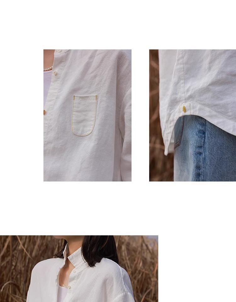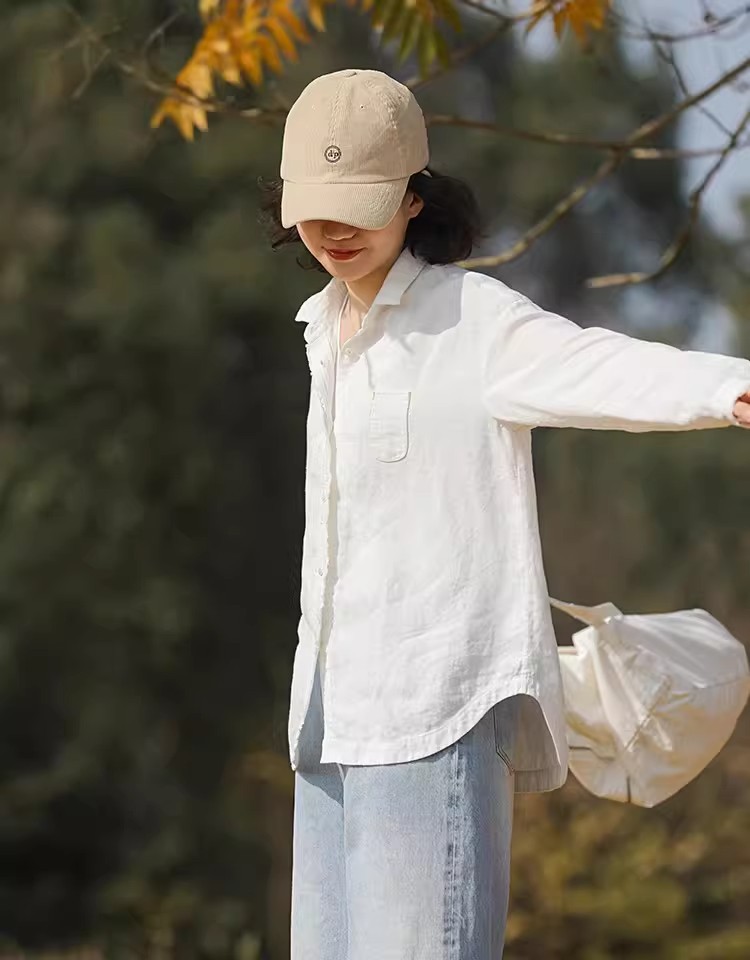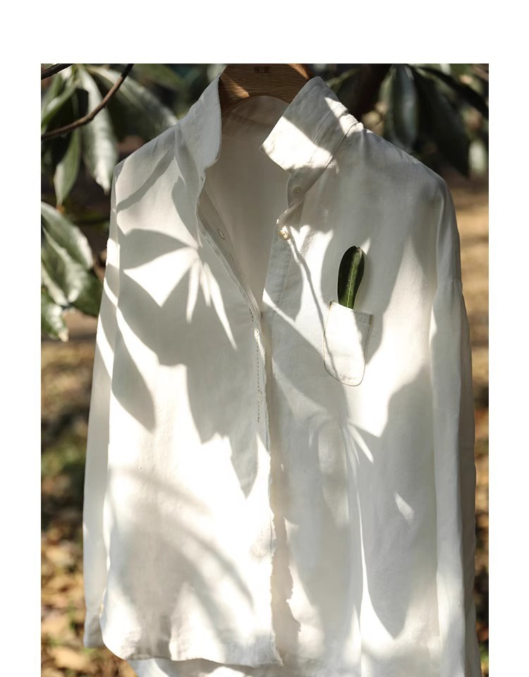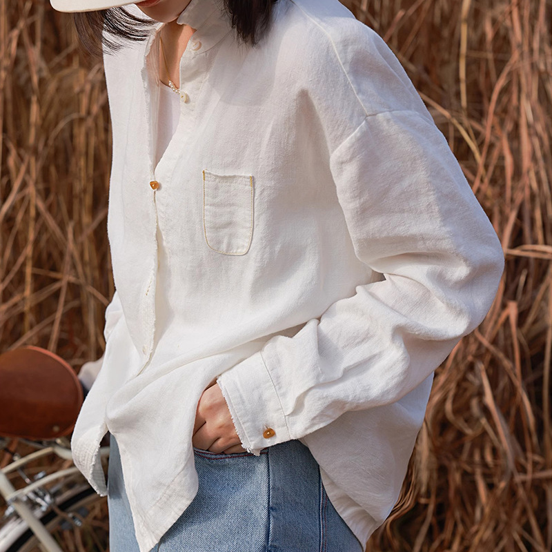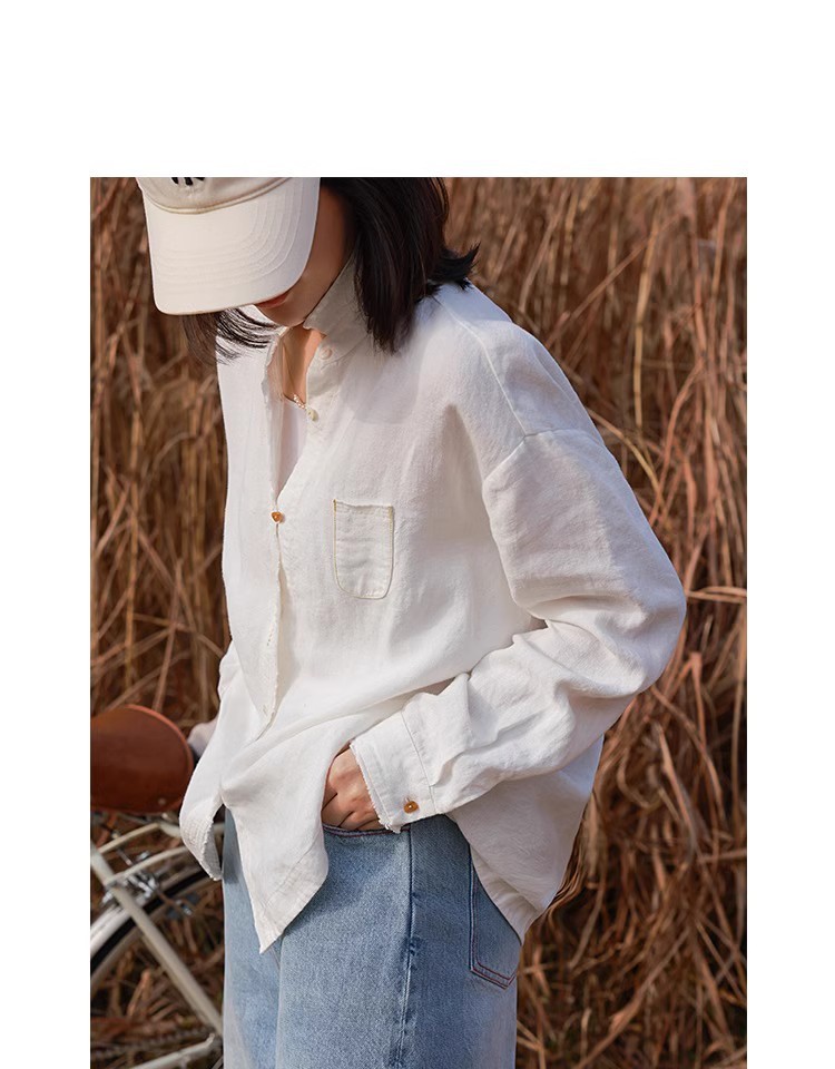 2025 봄과 가을 새로운 도착 대마 셔츠 소녀의 캐주얼 편안한 복고풍 유행 리넨 어깨 드롭 긴팔 흰색 셔츠