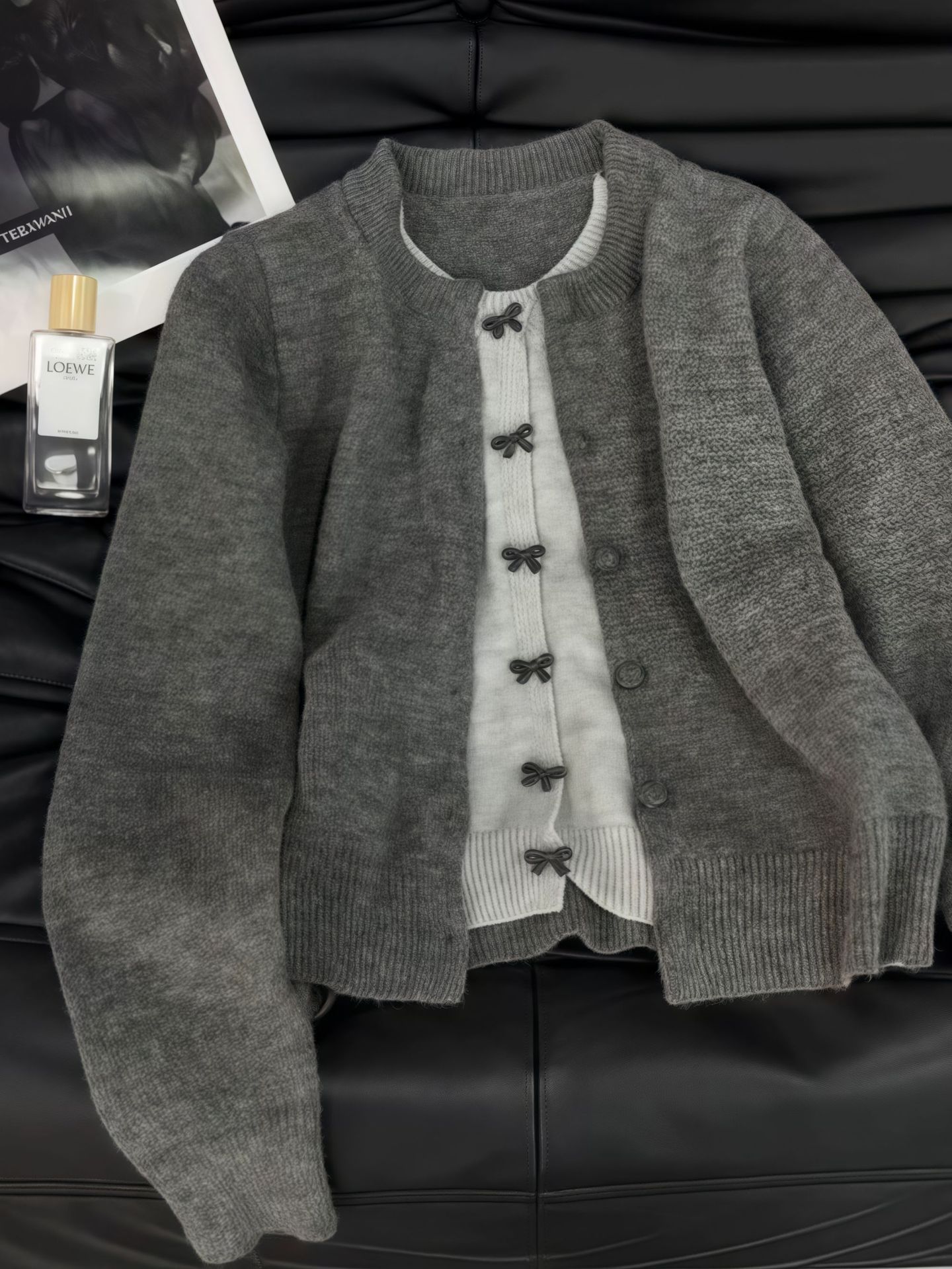 KANING 한국 스타일 리본 버튼 회색 투피스 가디건 여성용 2025 가을 신상 고급스러운 배색 상의