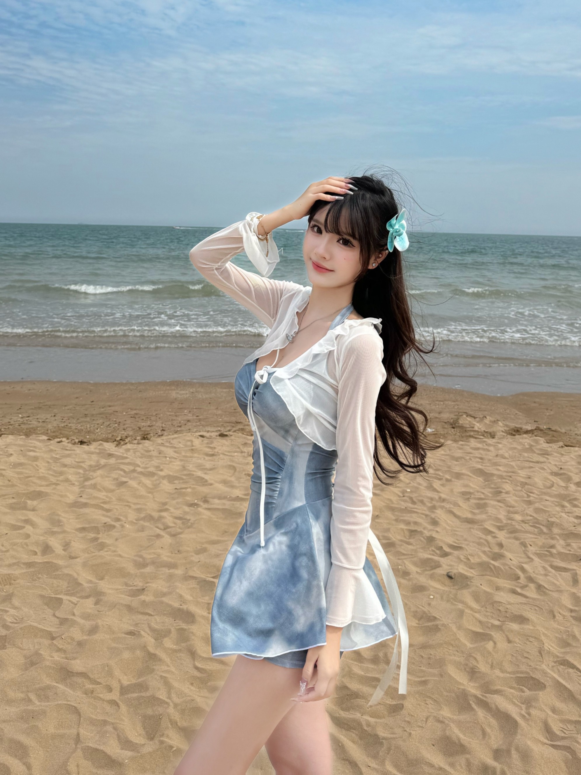 수영복 여성의 2025 새로운 넥타이 염색 블루 교수형 목 스커트 원피스 패션 하이 엔드 센스 약간의 뚱뚱한 소녀의 몸 슬리밍