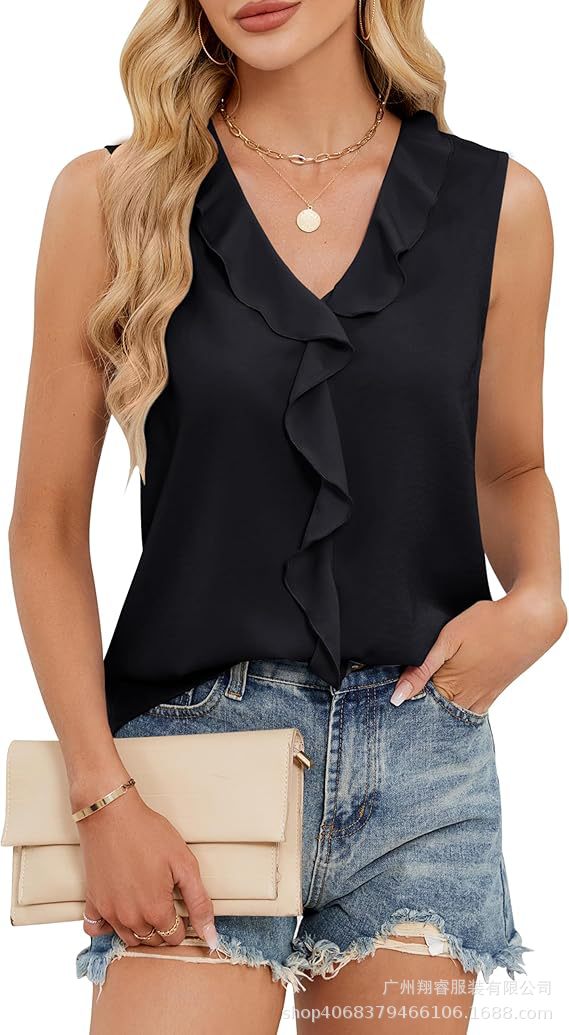 유럽과 미국의 아마존 2025 여자 여름 조끼 V-넥 러플 민소매 우아한 캐주얼 셔츠