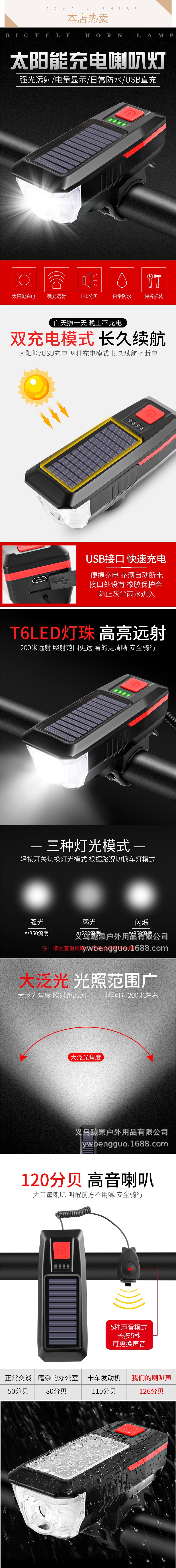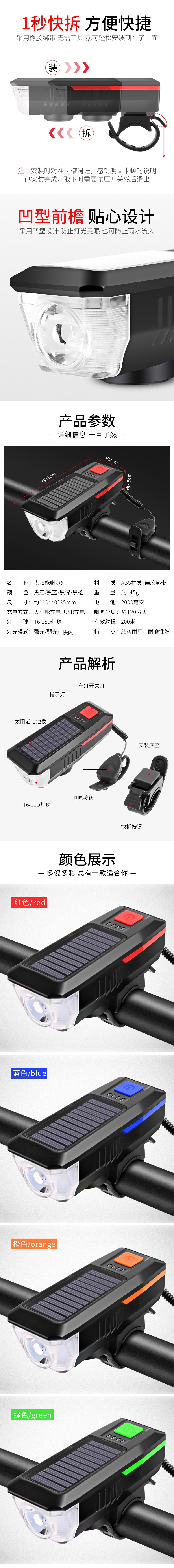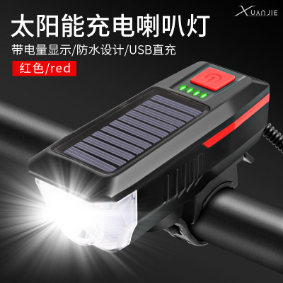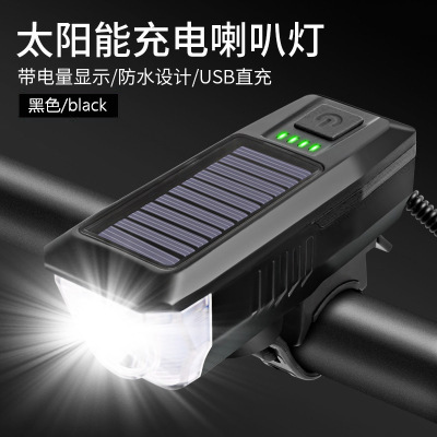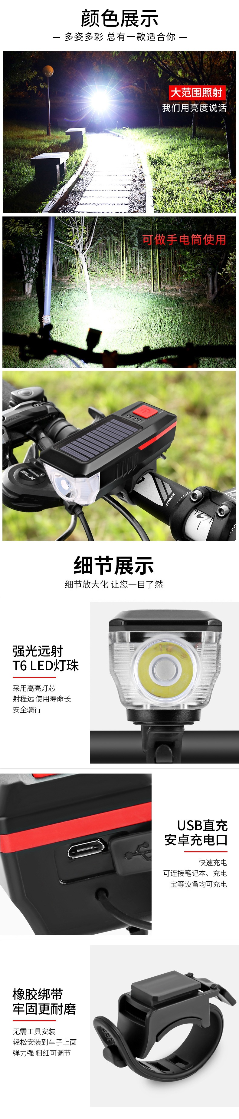 自行车灯前灯太阳能喇叭灯USB充电前灯单车强光手电骑行装备跨境