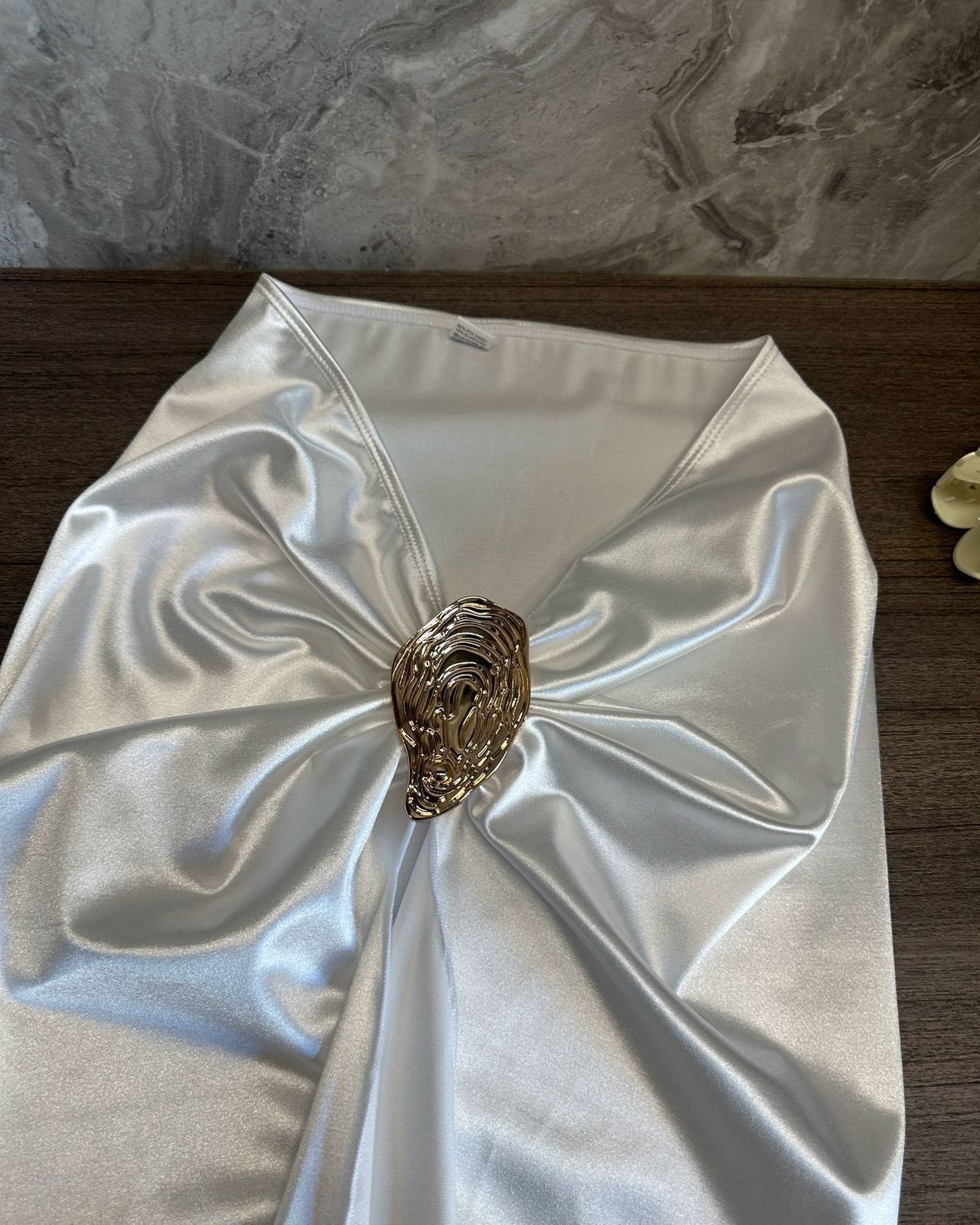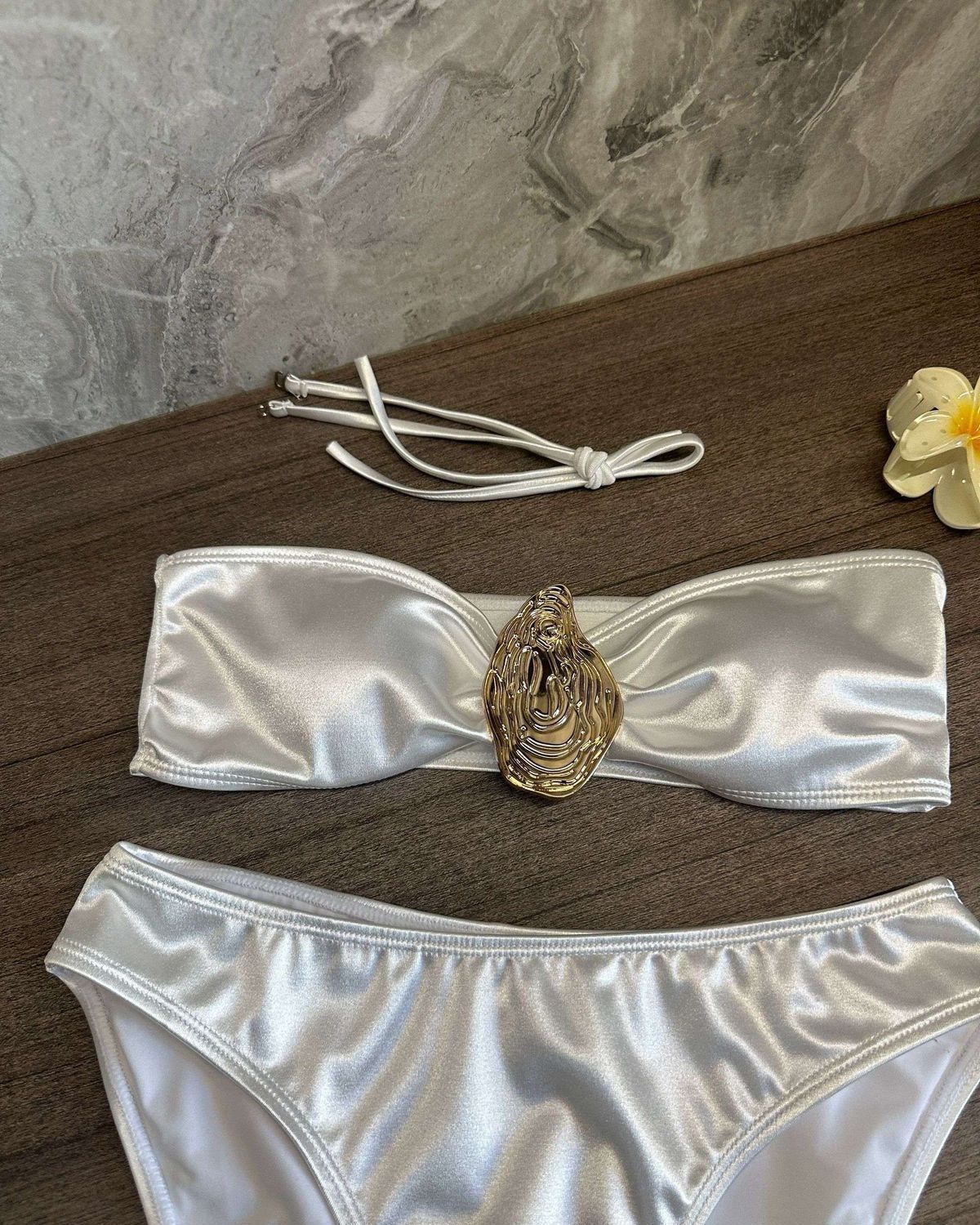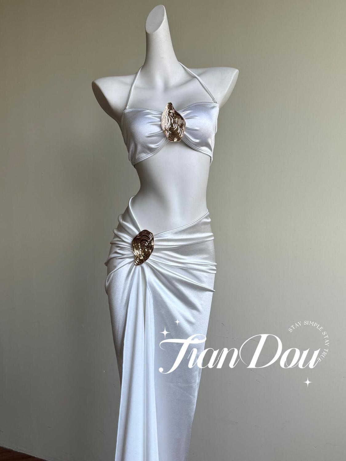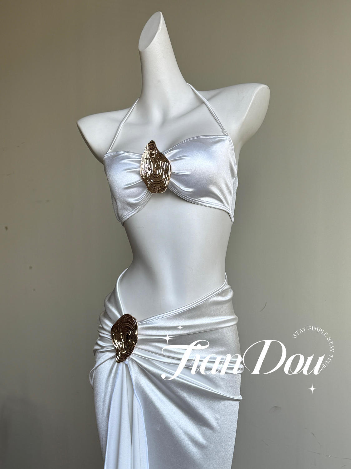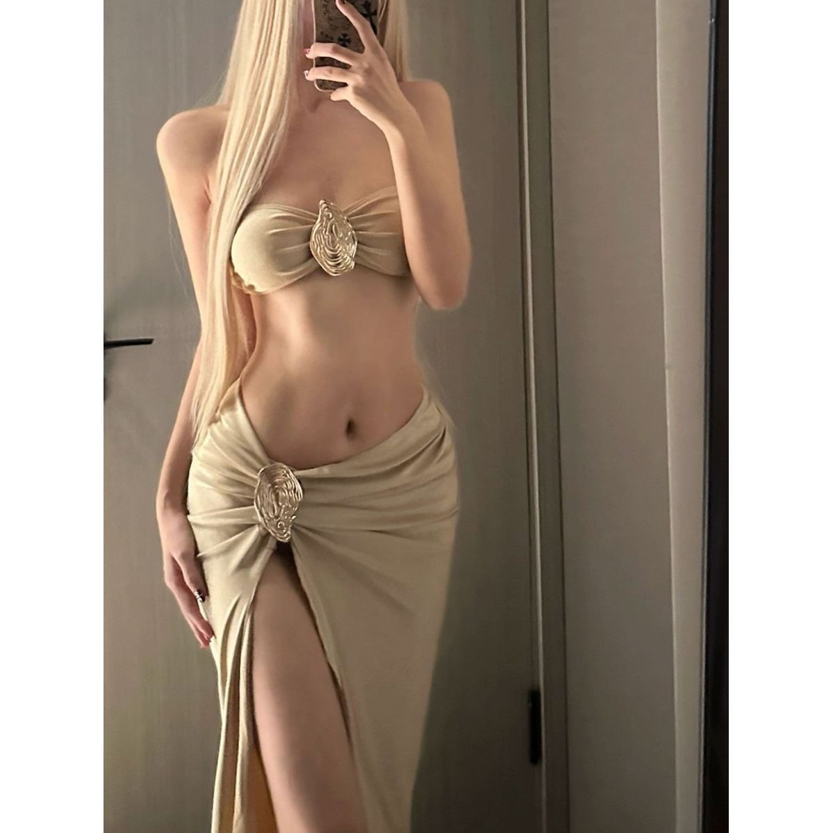 [잠수함 달빛] 고급 질감 새틴 섹시 목 분할 긴 원피스 수영복 여성 비키니 3 피스 세트 여름