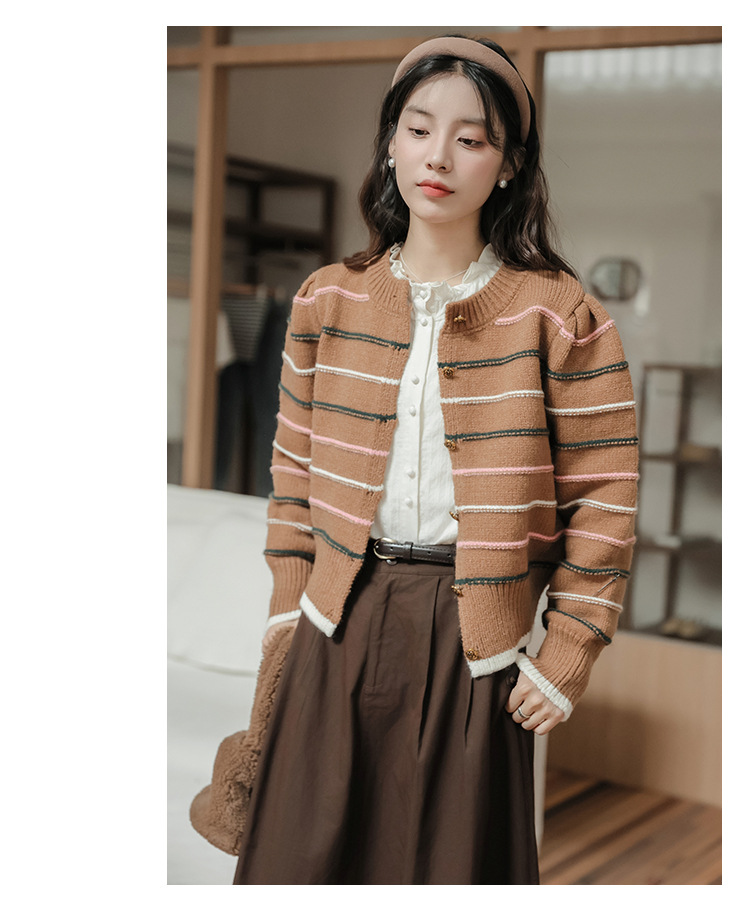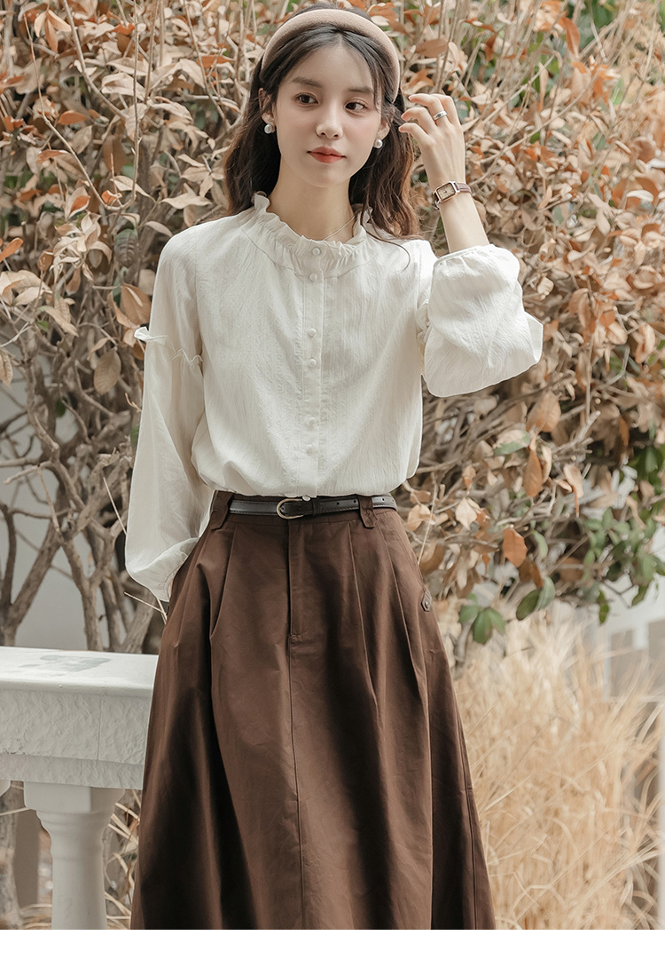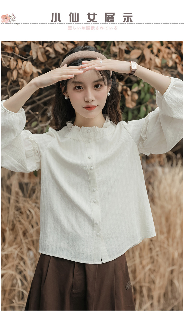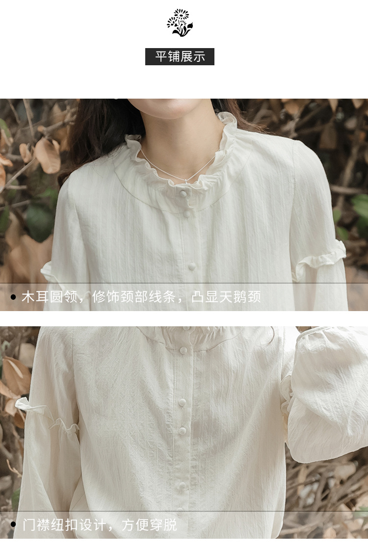 2025 가을 신상 프렌치 스타일 부드러운 랜턴 소매 베이지 화이트 슬림핏 스플라이싱 러플 스트라이프 긴팔 셔츠 여성용스토어 가기