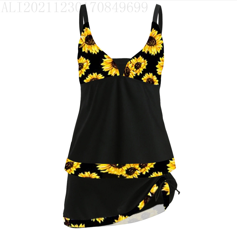 2024 새로운 여성 분할 투피스 수영복 유럽과 미국의 보수적 인 배꼽 인쇄 짧은 스커트 비키니 수영복