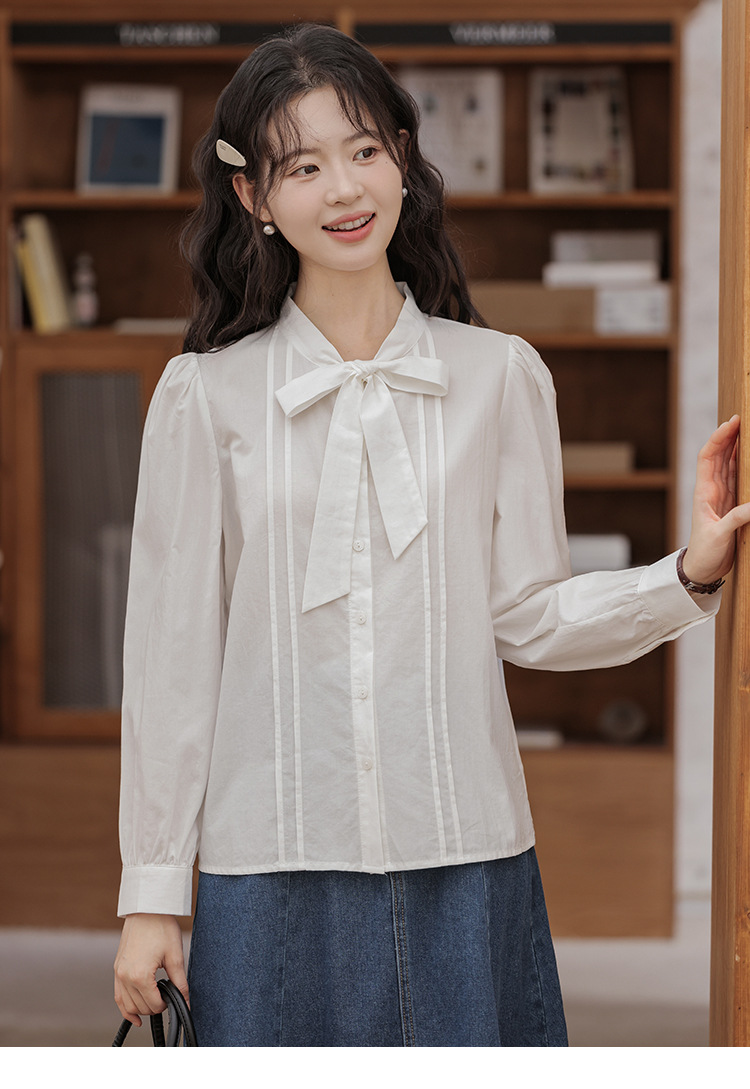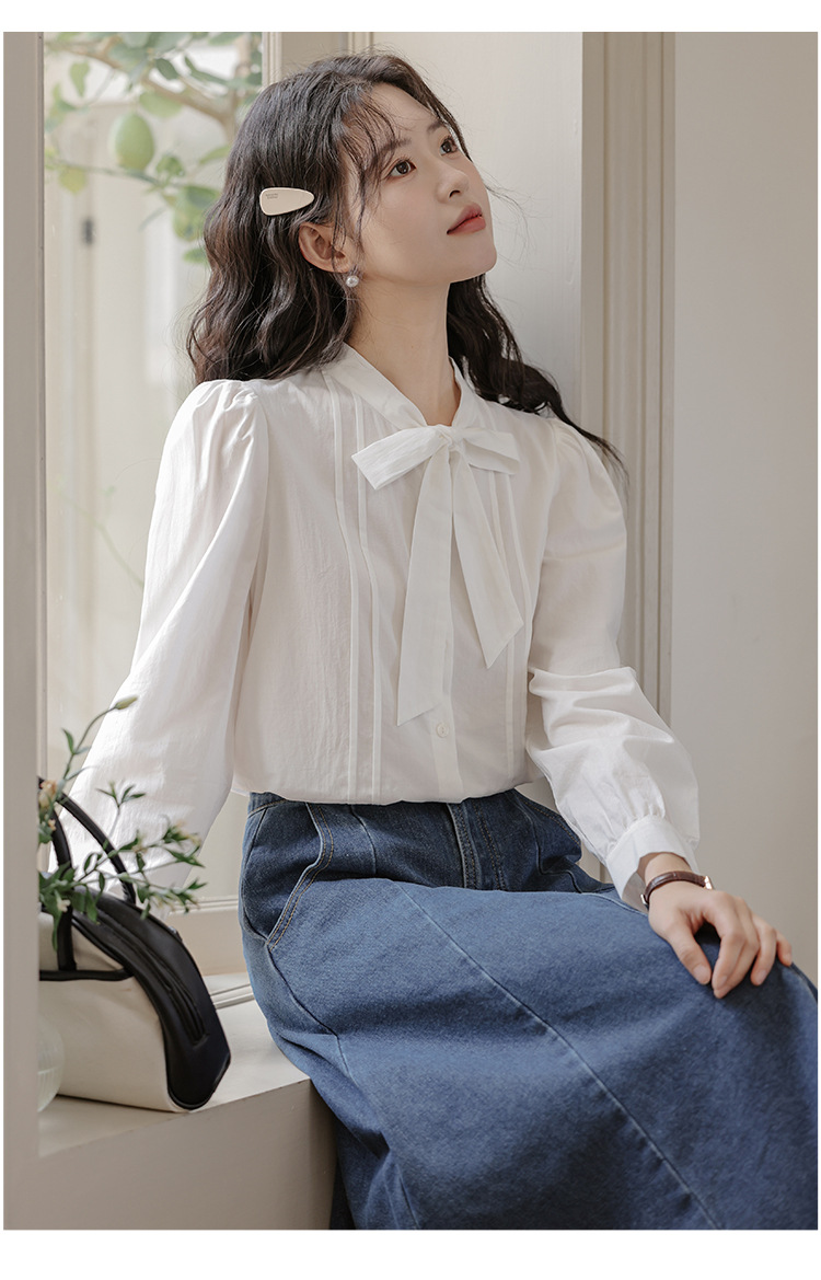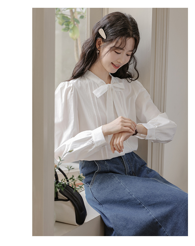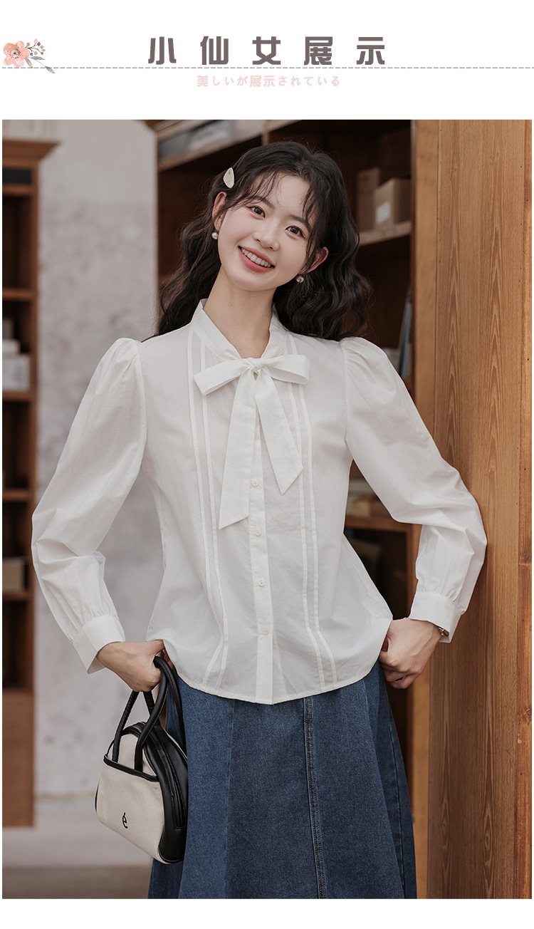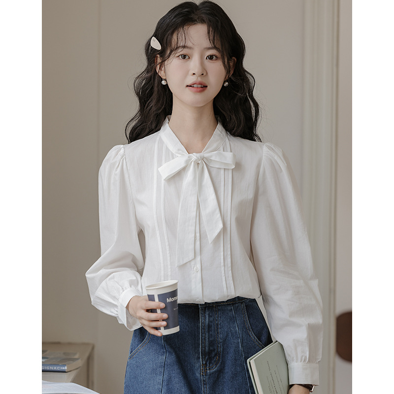 2025 년 봄 새로운 프랑스 달콤한 통근 흰색 나비 넥타이베이스 퍼프 소매 긴 소매 세련된 셔츠