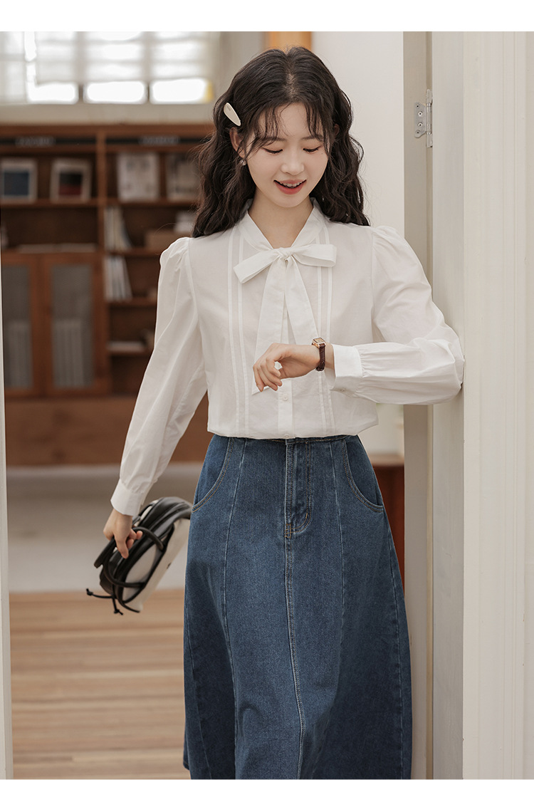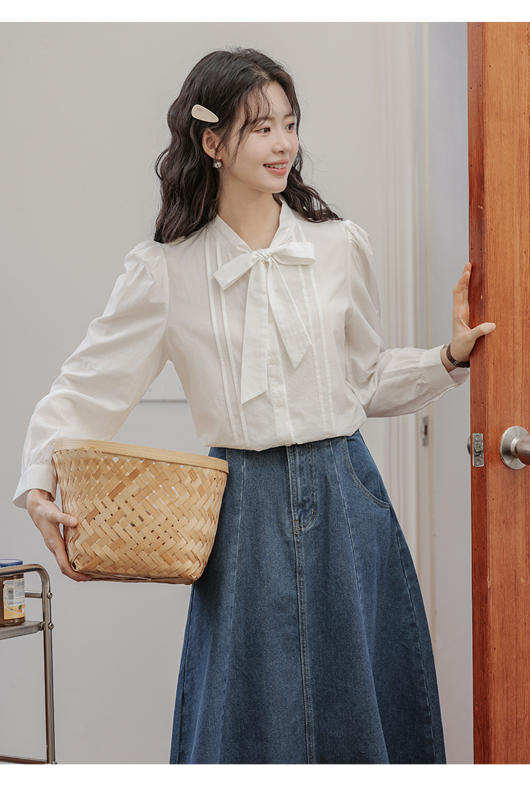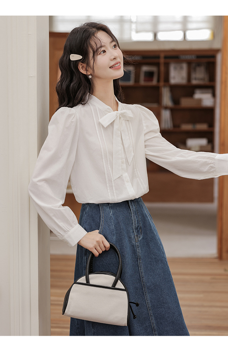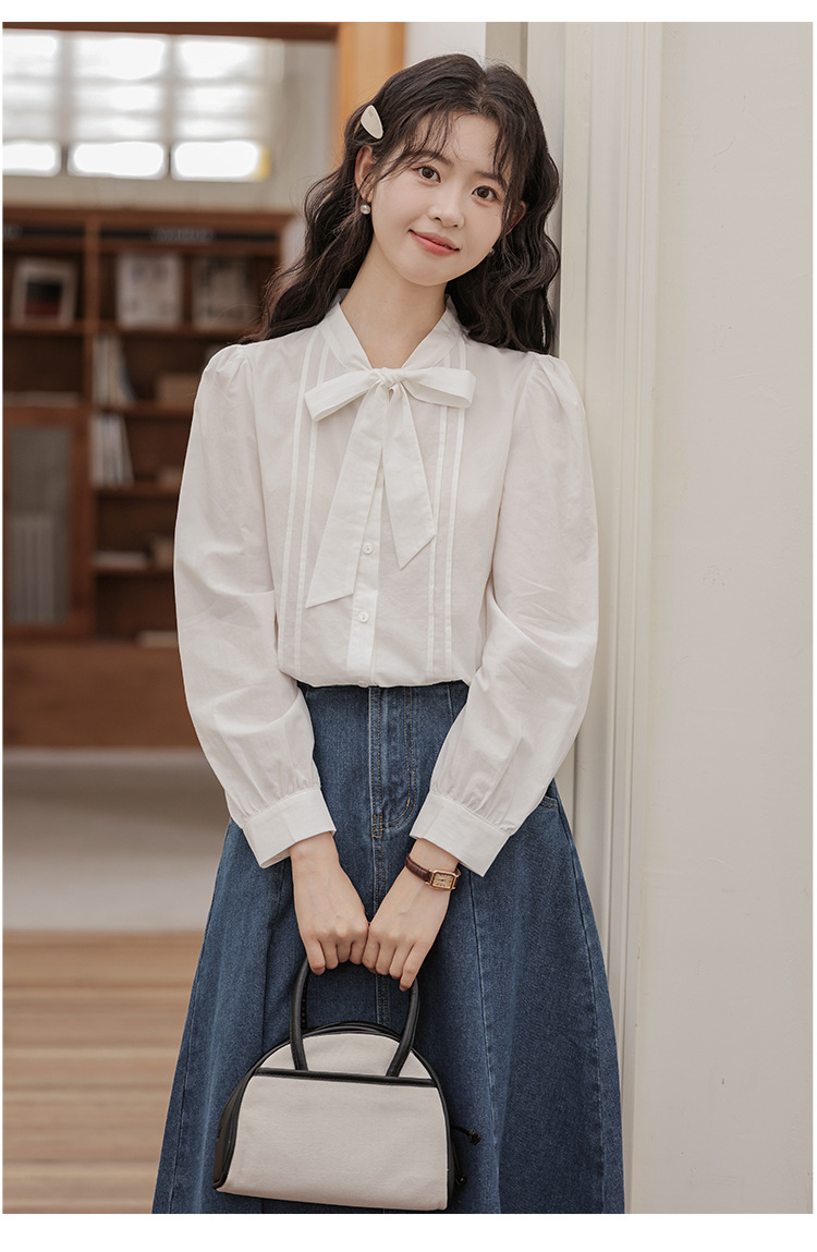 2025 년 봄 새로운 프랑스 달콤한 통근 흰색 나비 넥타이베이스 퍼프 소매 긴 소매 세련된 셔츠