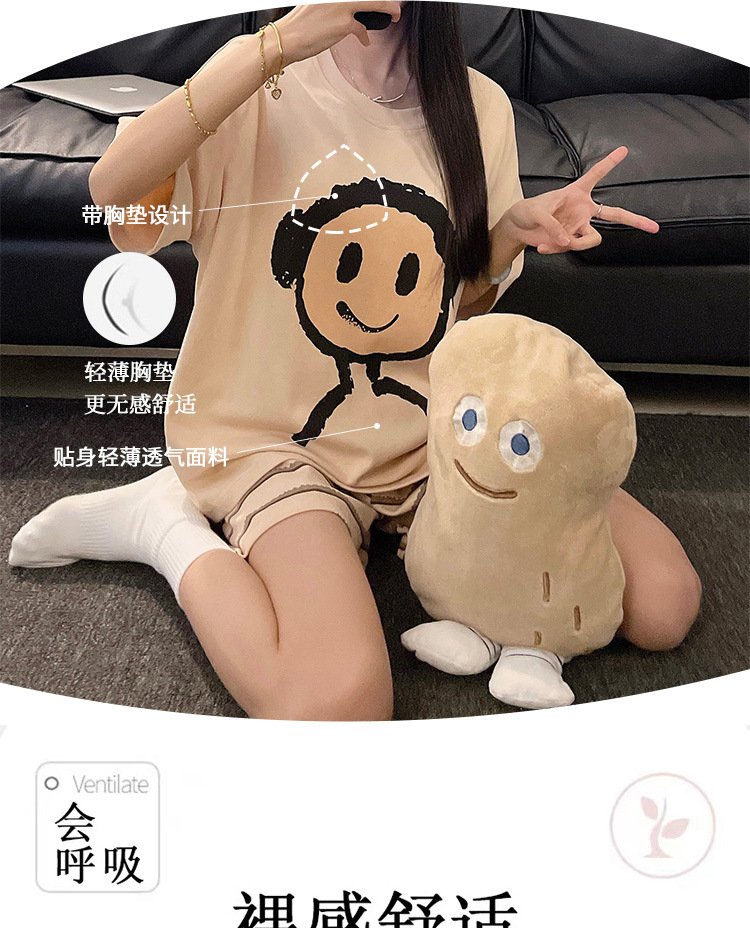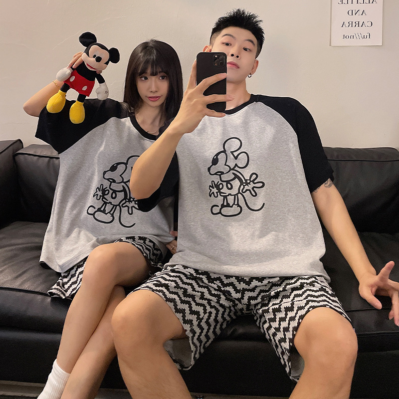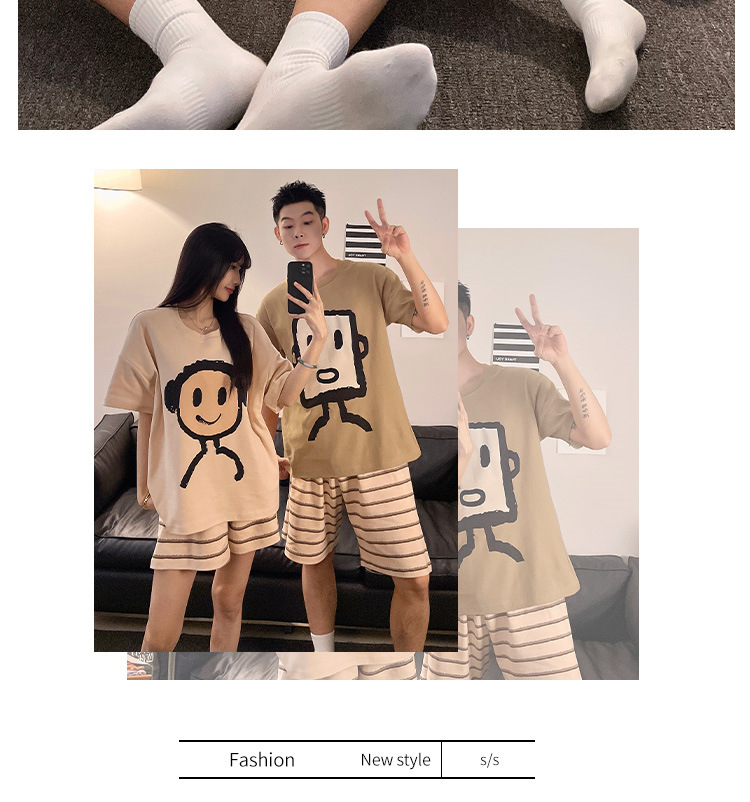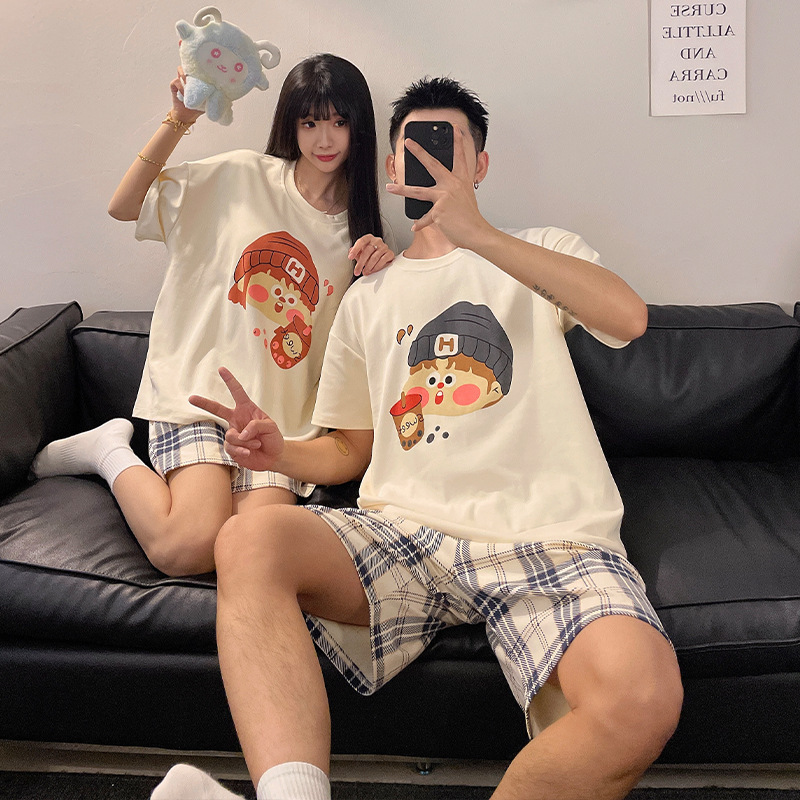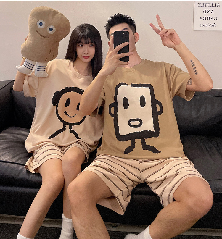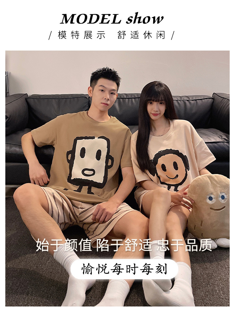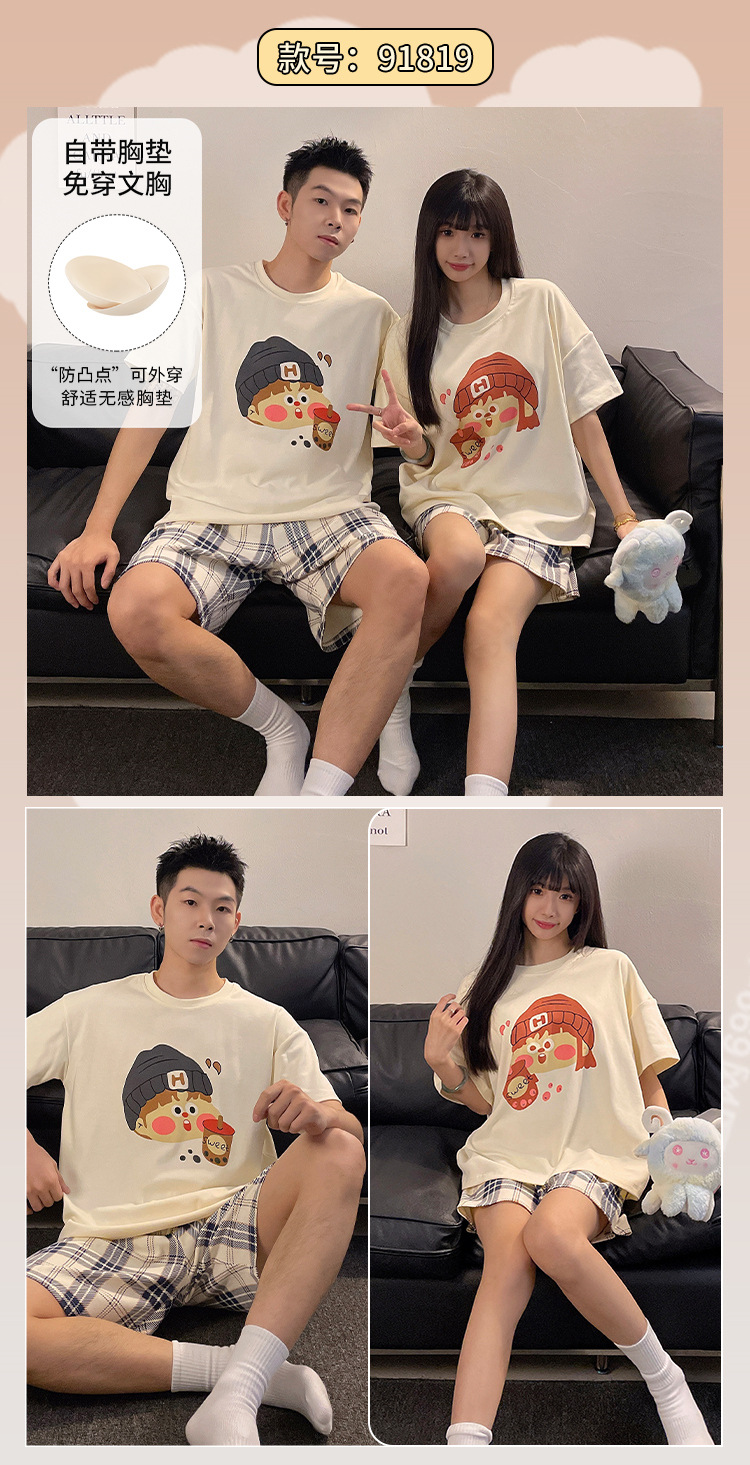 커플 잠옷 여름 짧은 소매 여성 가슴 패드 2025 새로운 봄과 여름 스타일 남성과 여성은 외부 홈 의류 세트 입을 수 있습니다스토어 가기