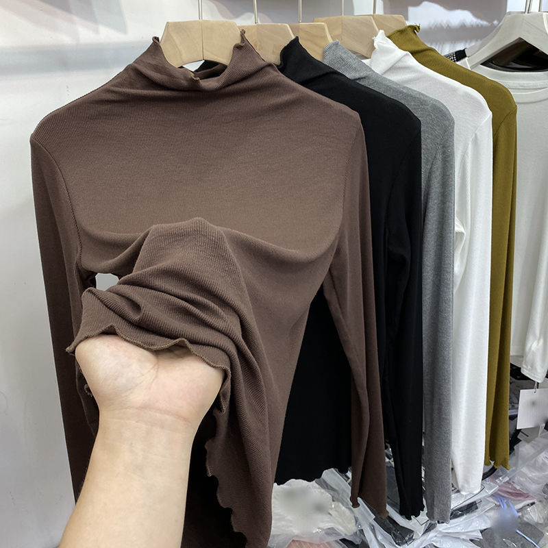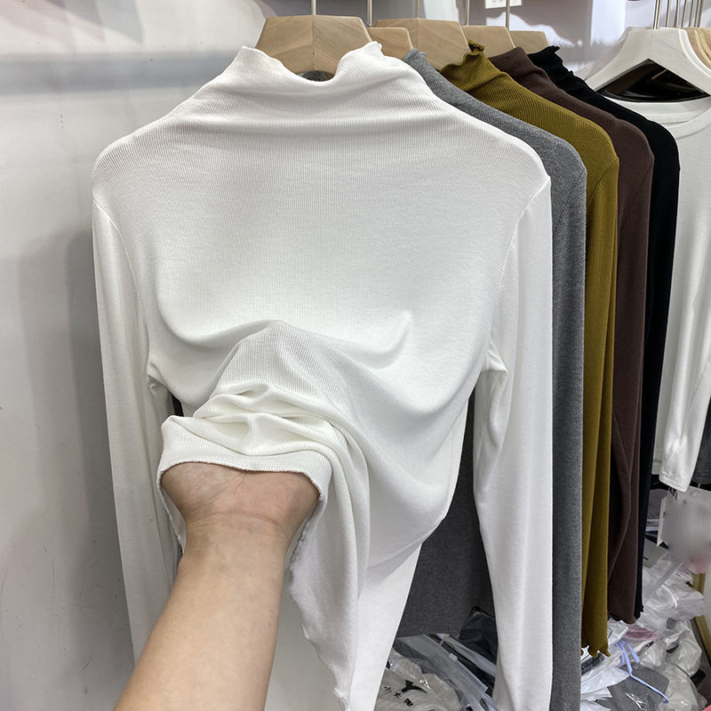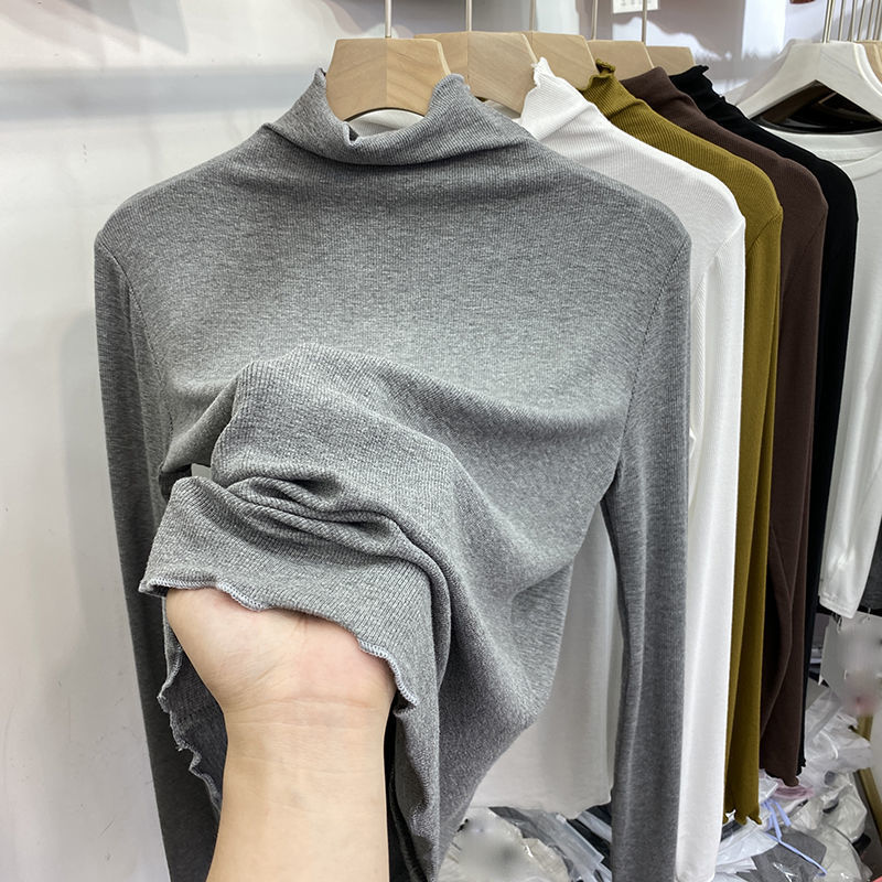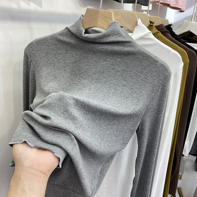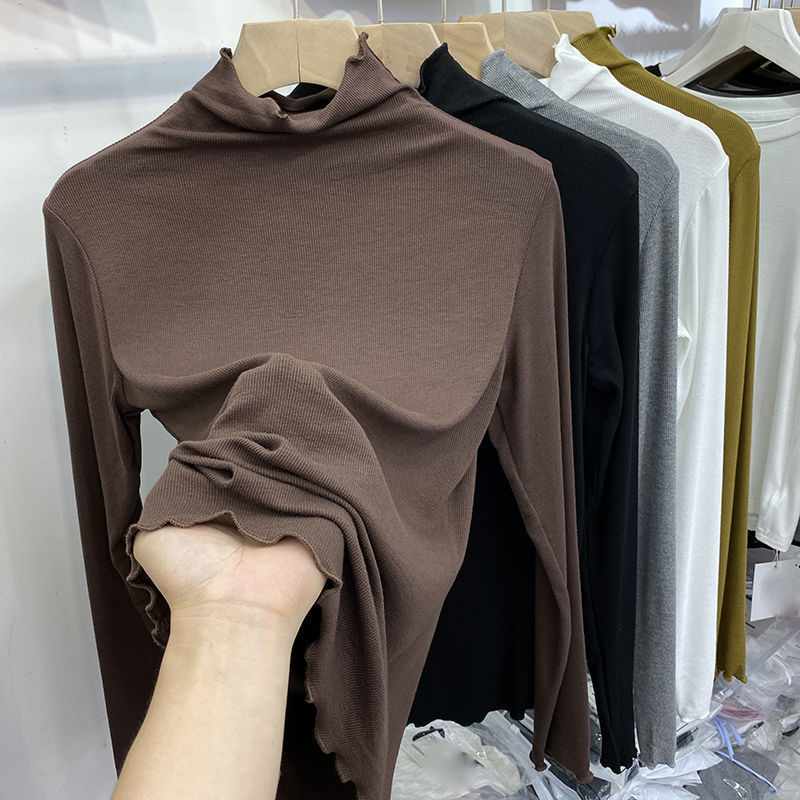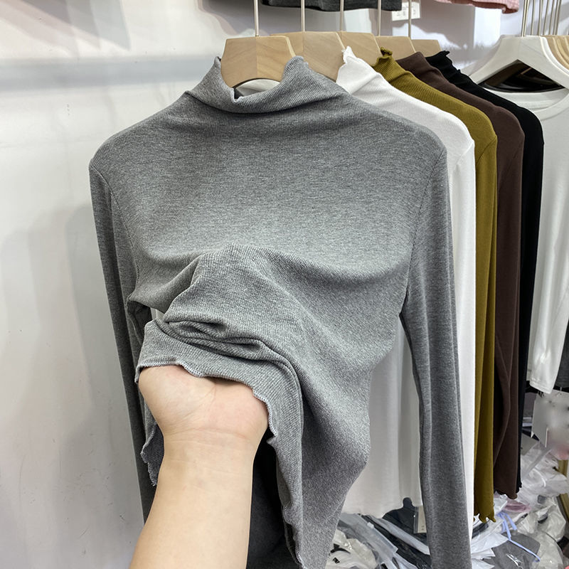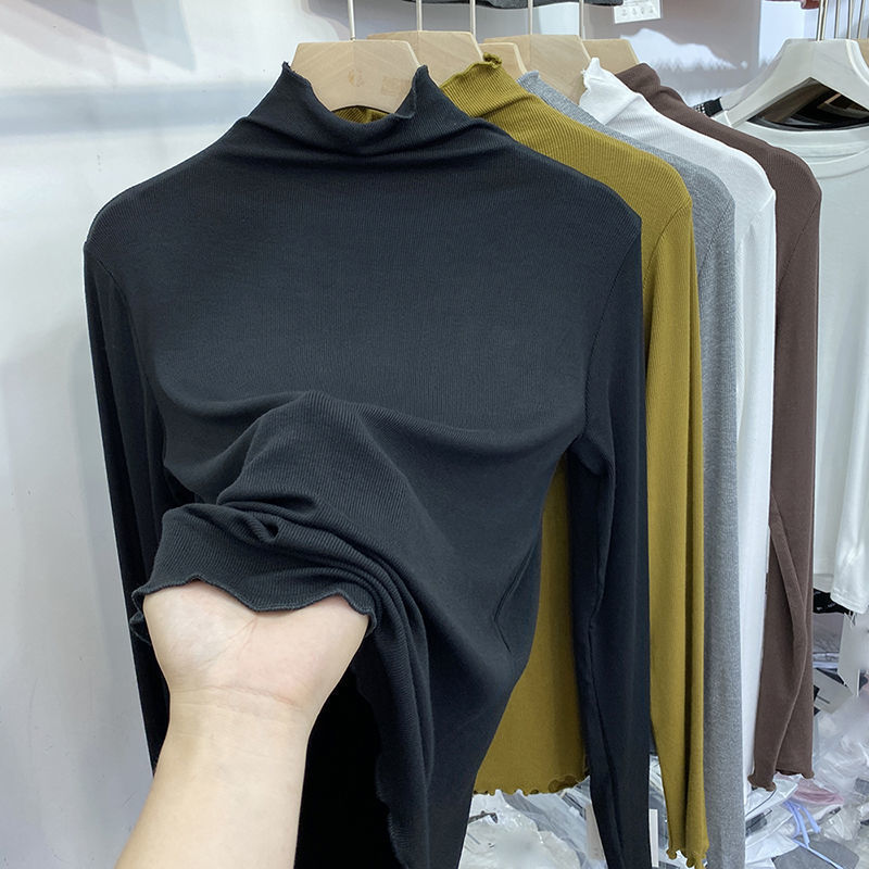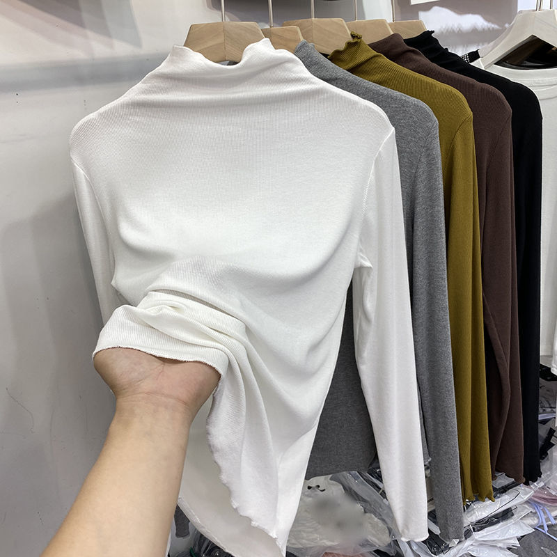 플러스 사이즈 유럽 용품 세미 하이 칼라 나무 이어 엣지베이스 셔츠 여성의 가을 착용 외국식 얇은 실 코튼 스트레치 긴 소매 티셔츠