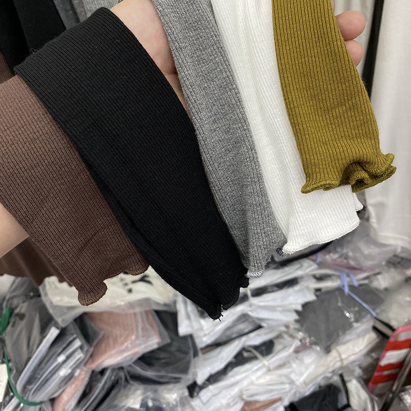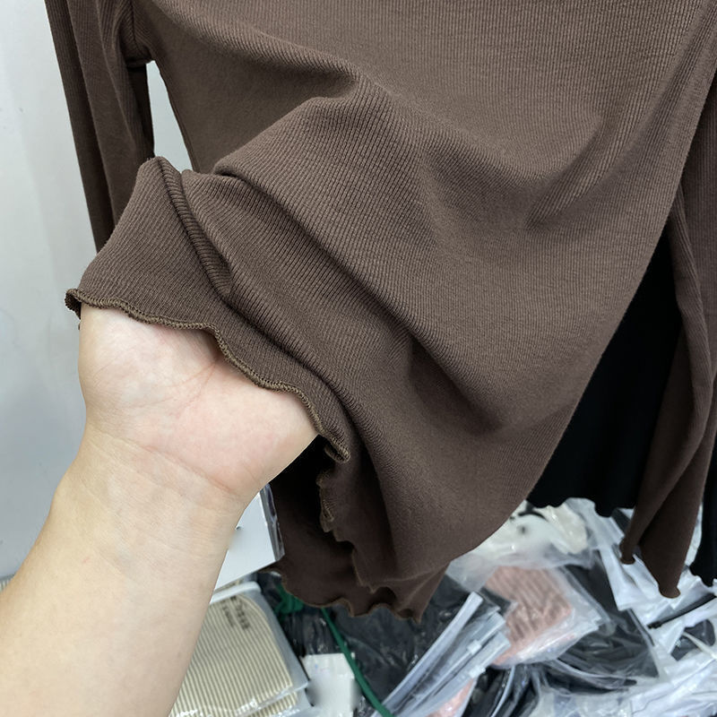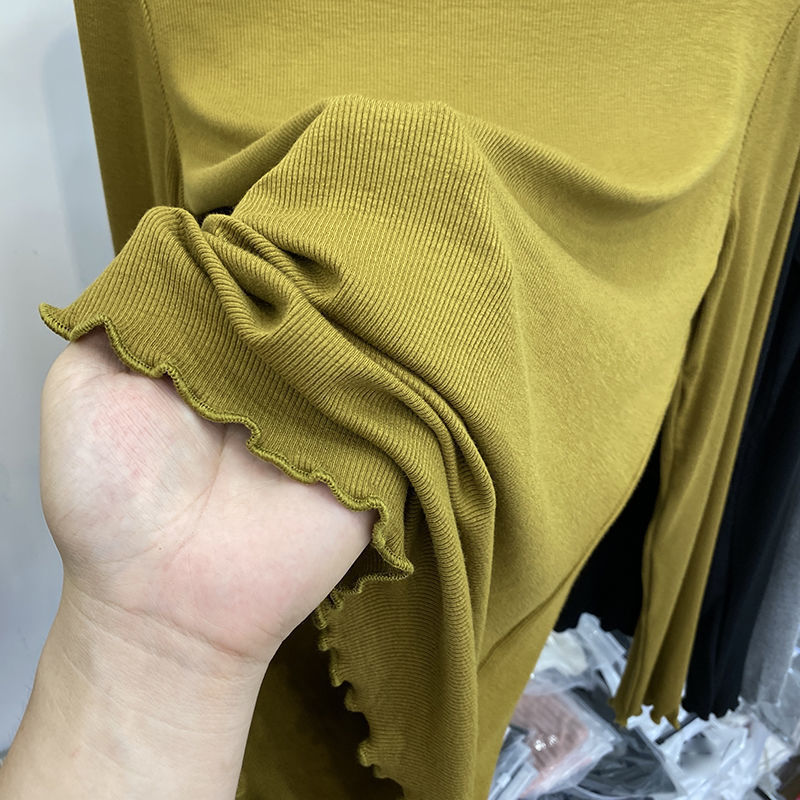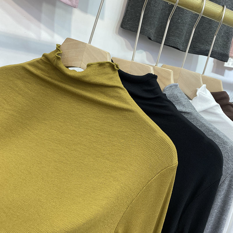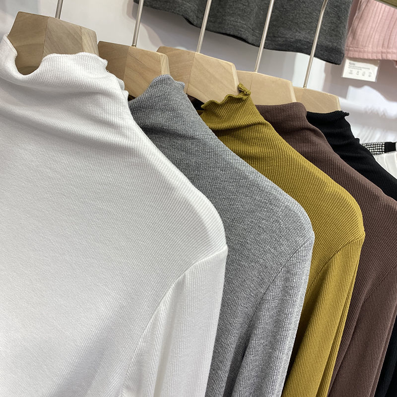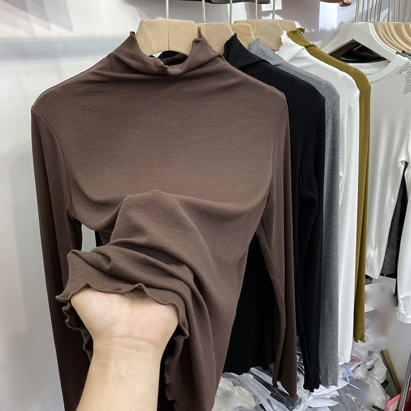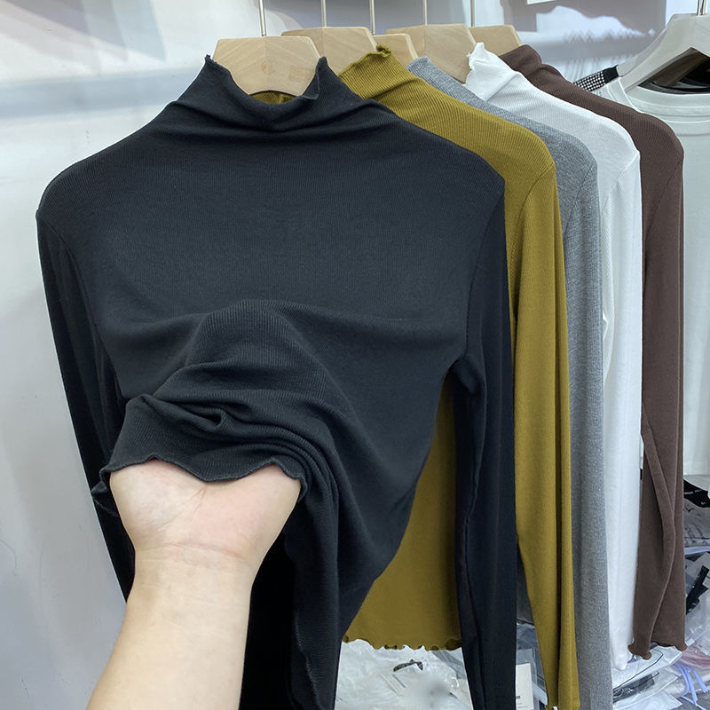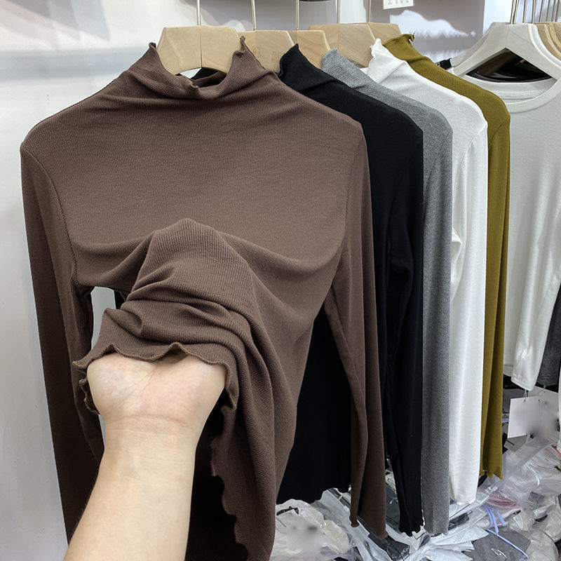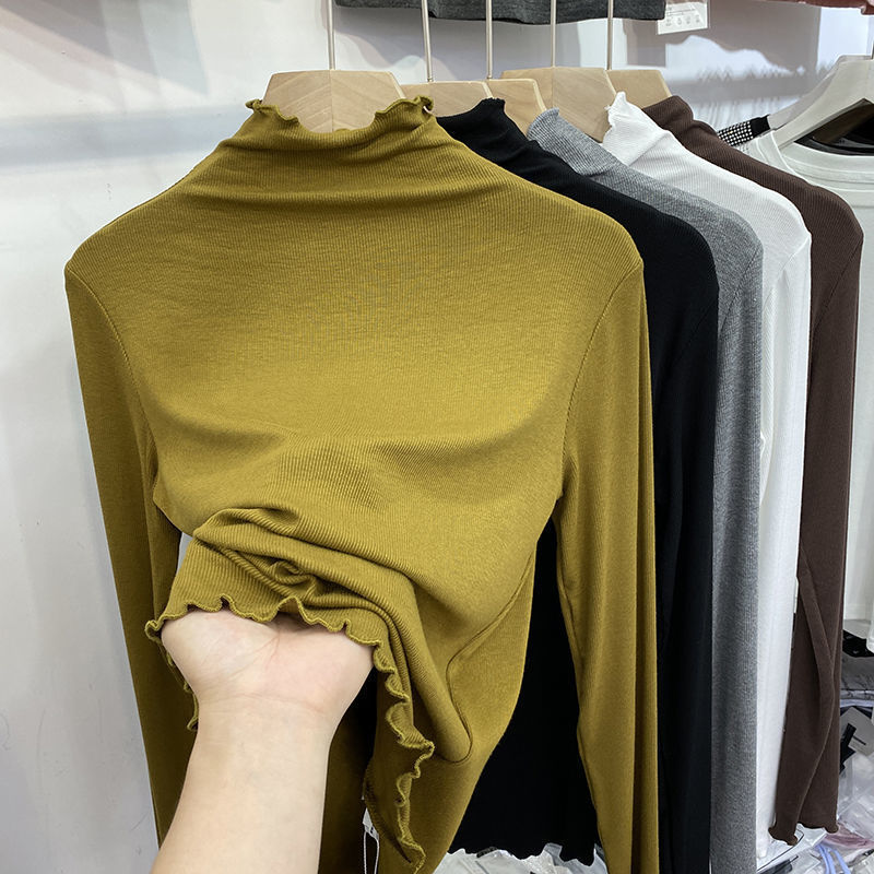 플러스 사이즈 유럽 용품 세미 하이 칼라 나무 이어 엣지베이스 셔츠 여성의 가을 착용 외국식 얇은 실 코튼 스트레치 긴 소매 티셔츠