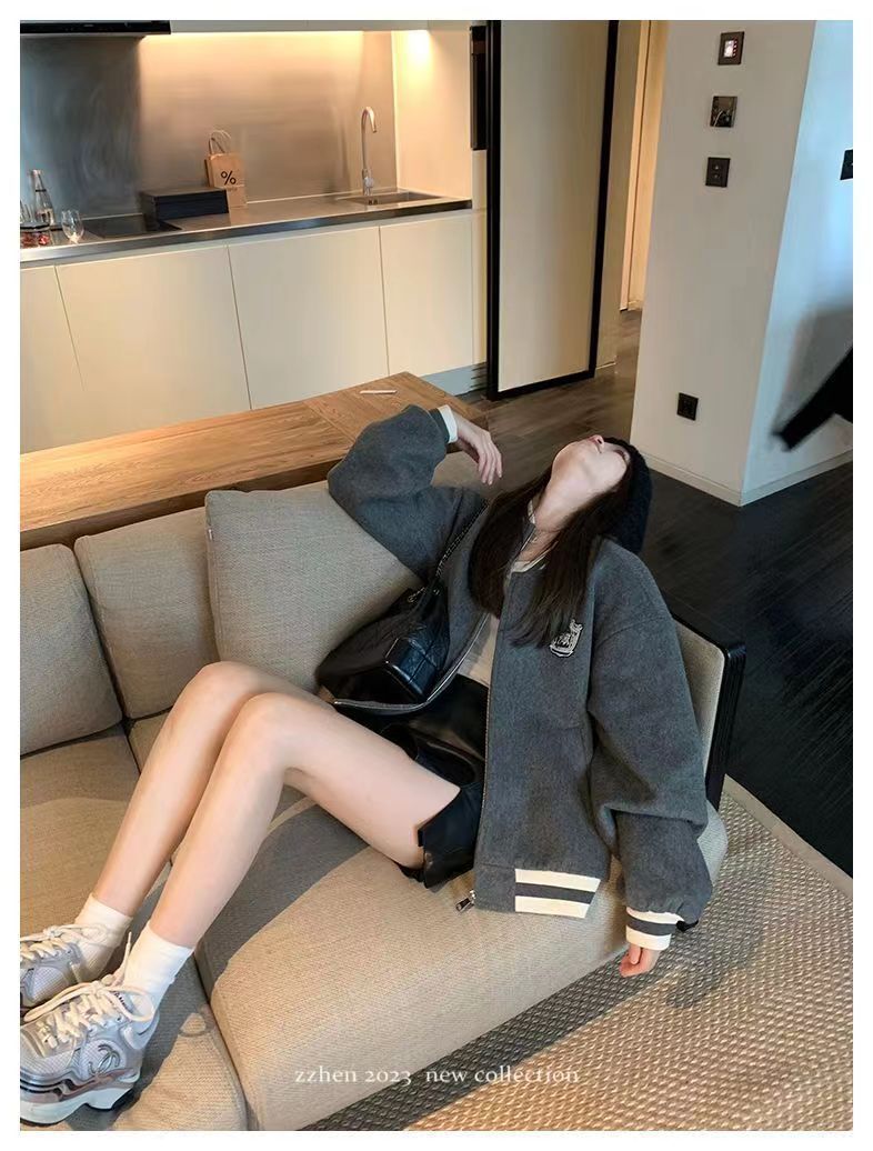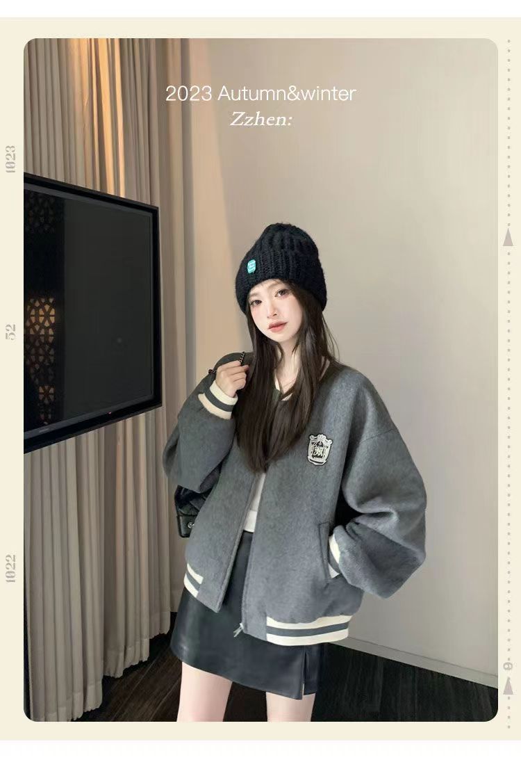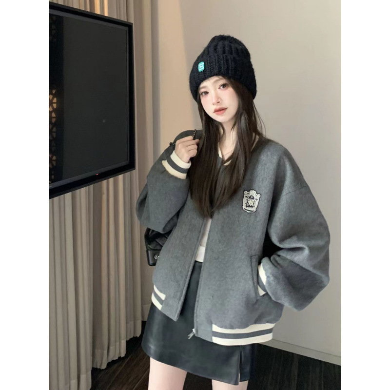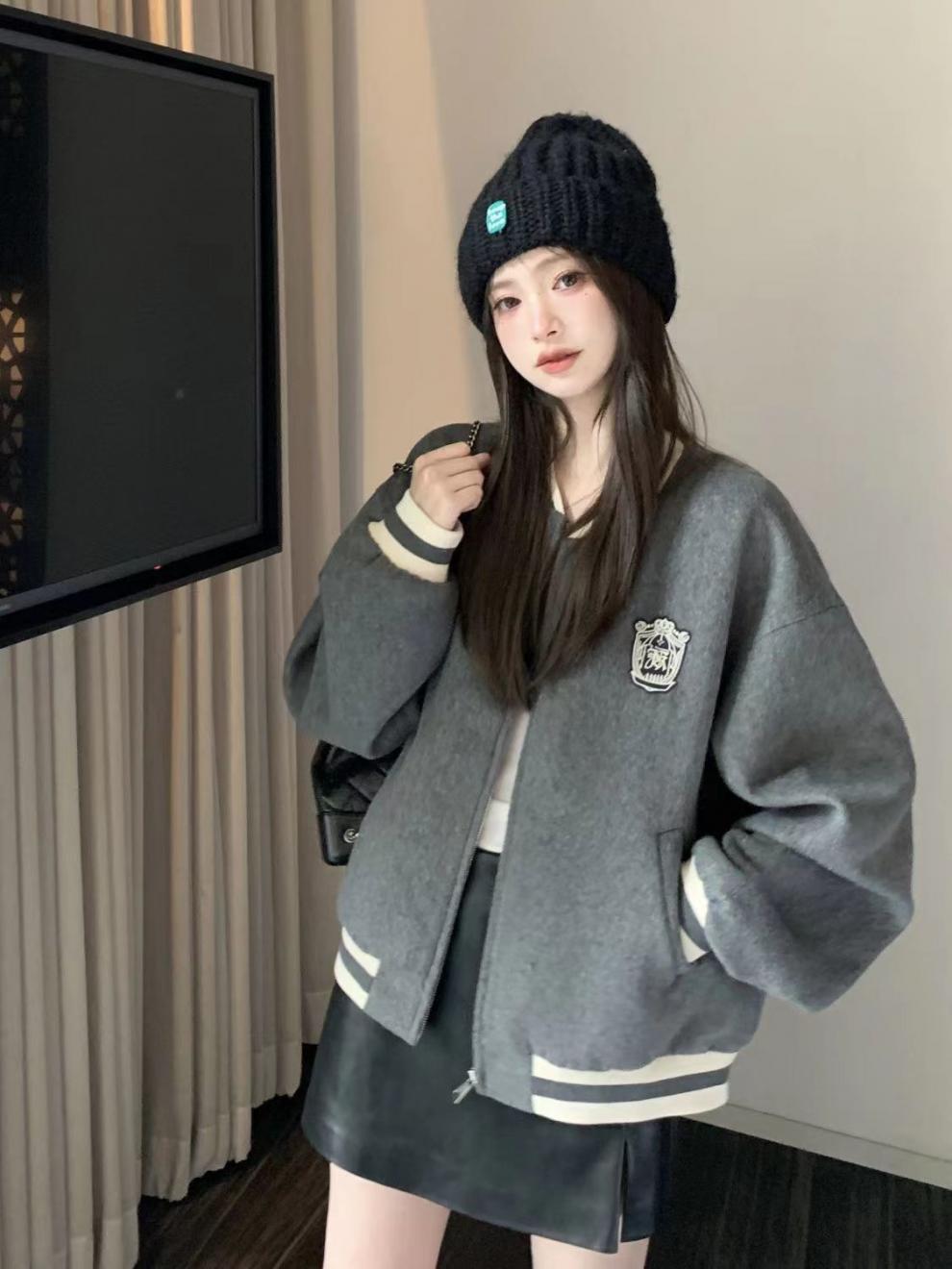 대학 스타일 회색 양 양모 단면 키 큰 야구 세트 봄과 가을 배지 대조 느슨한 모직 한국식 쇼트 코트스토어 가기