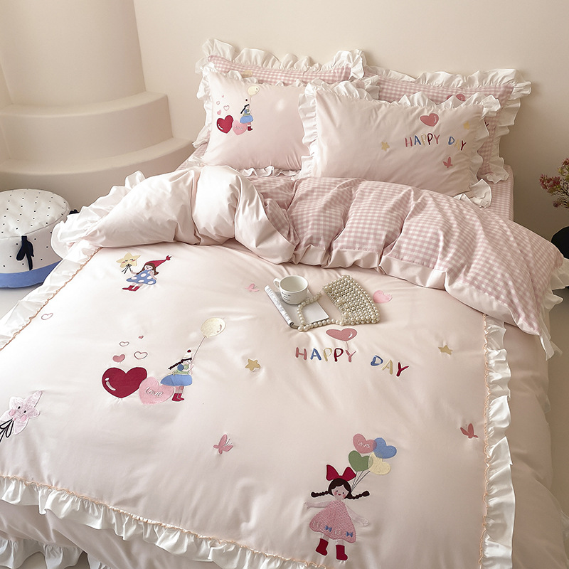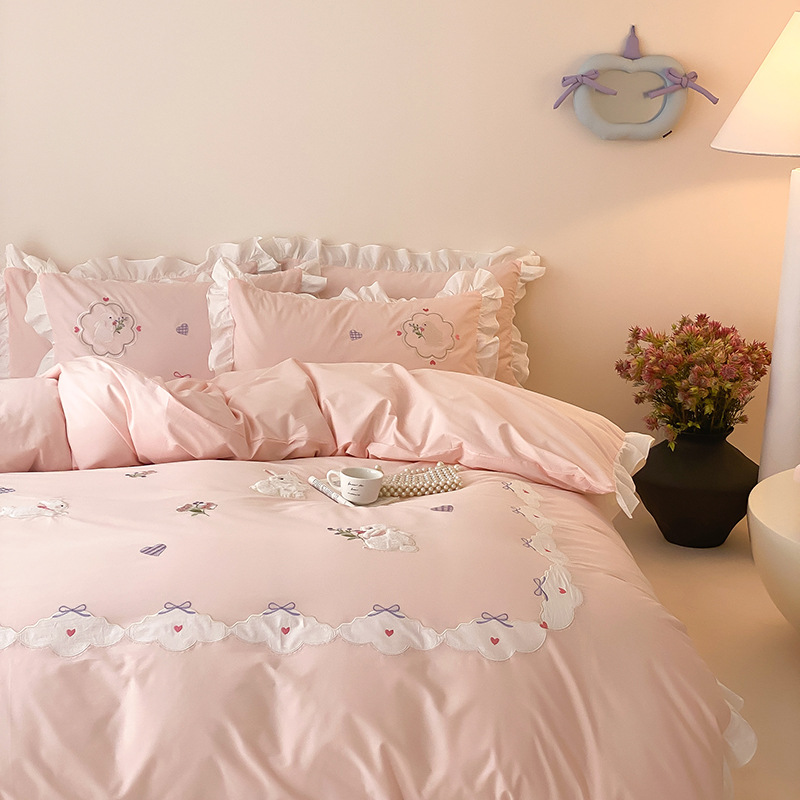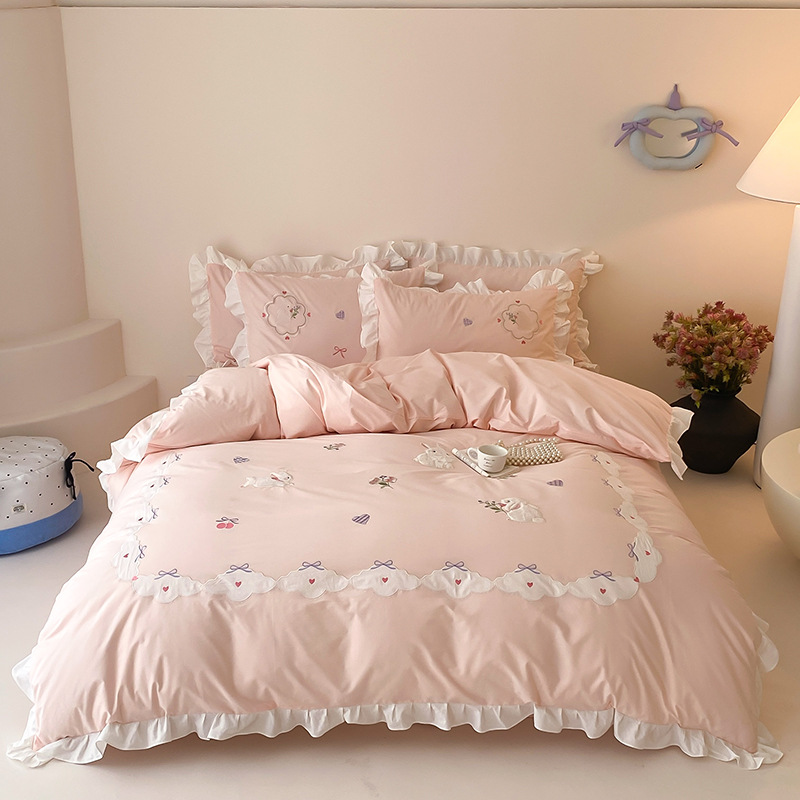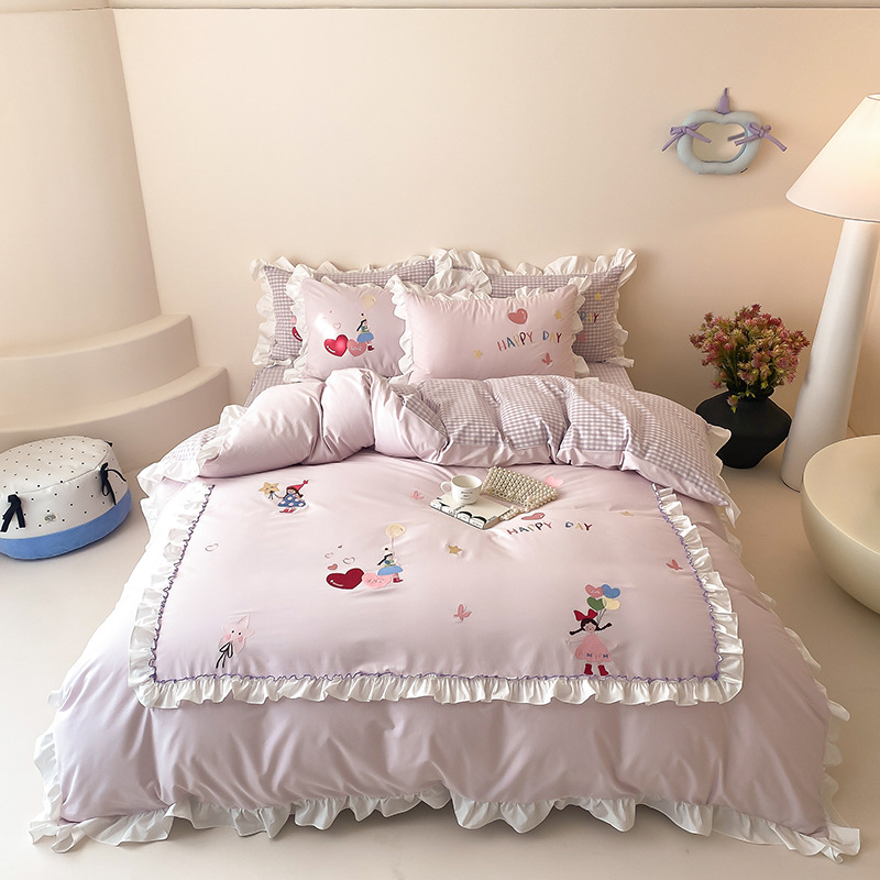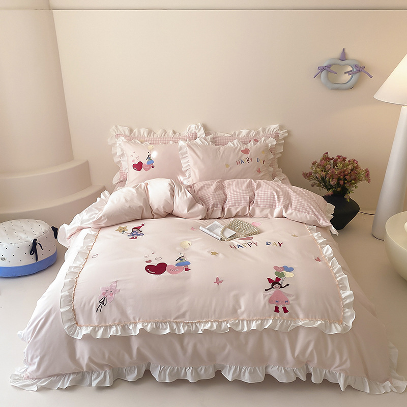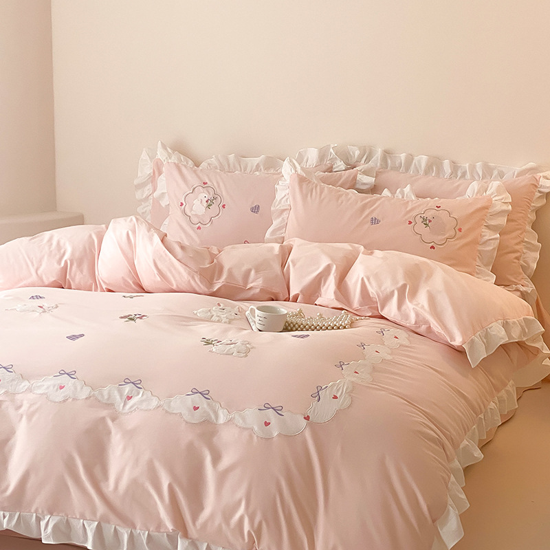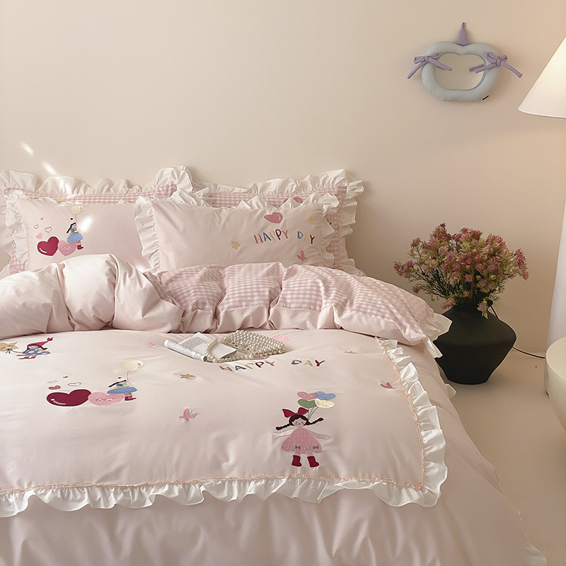 퓨어 코튼 4 피스 세트 씻은 코튼 연꽃 잎 레이스 자수 3 피스 세트 퀼트 커버 침대 시트 침상