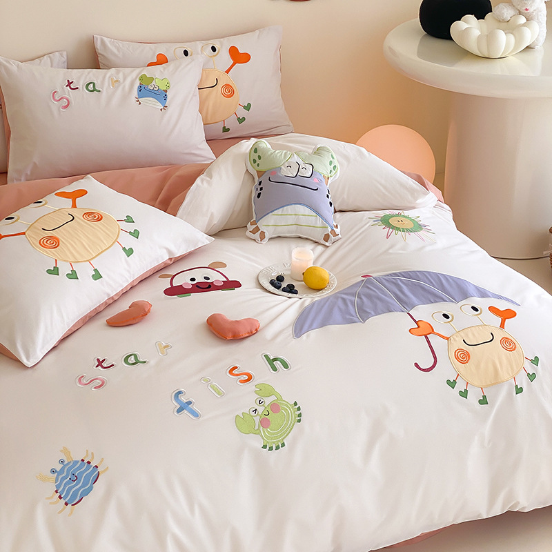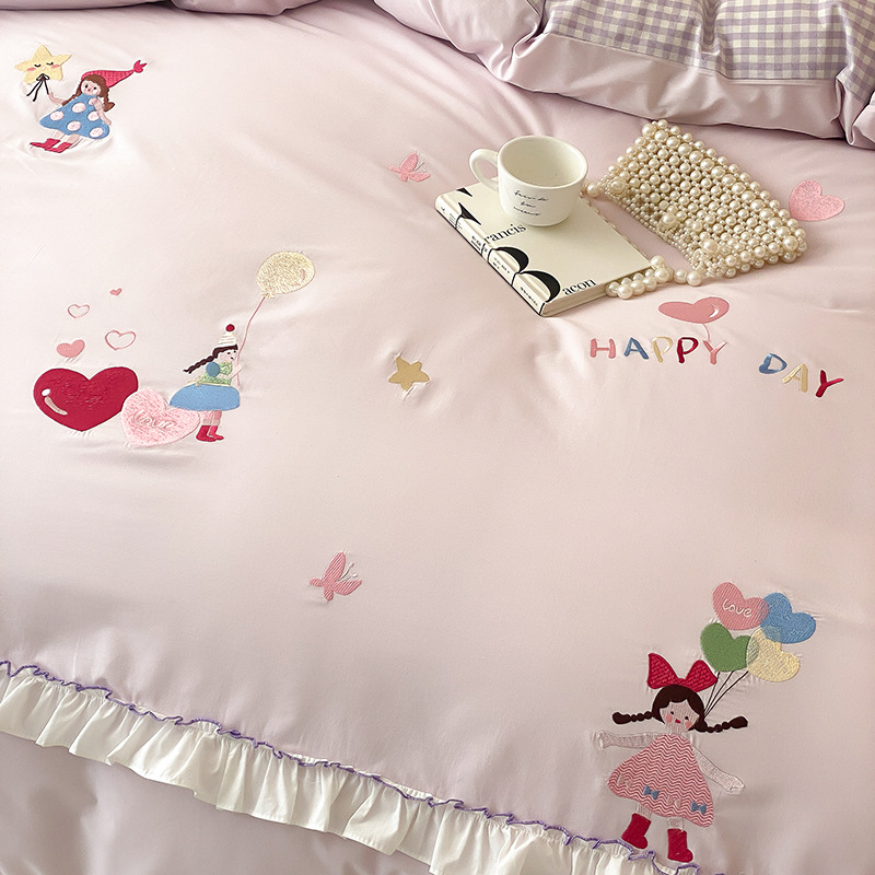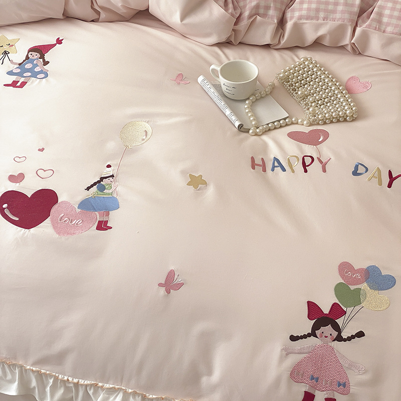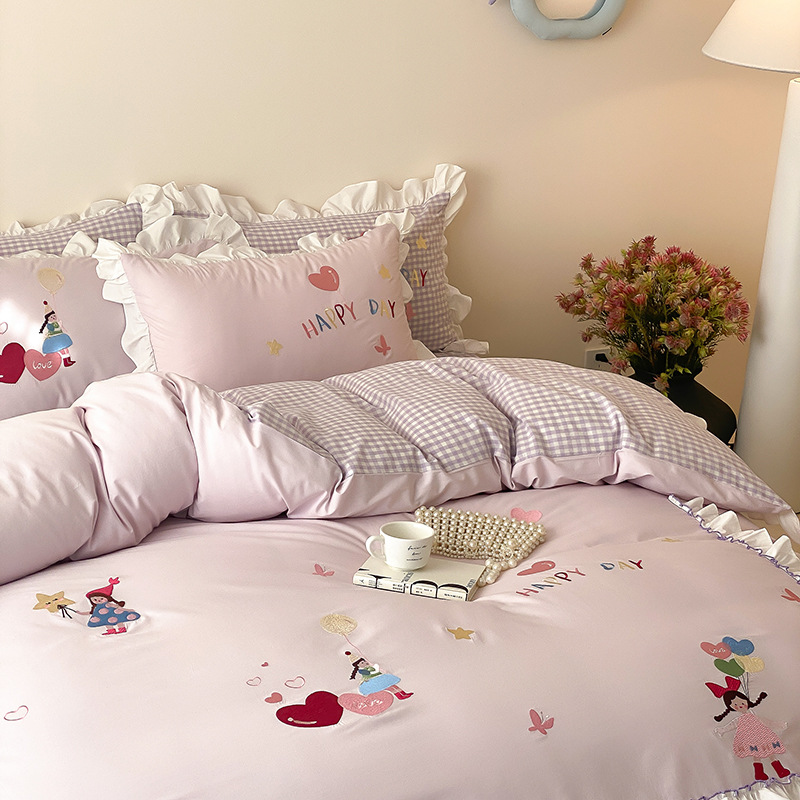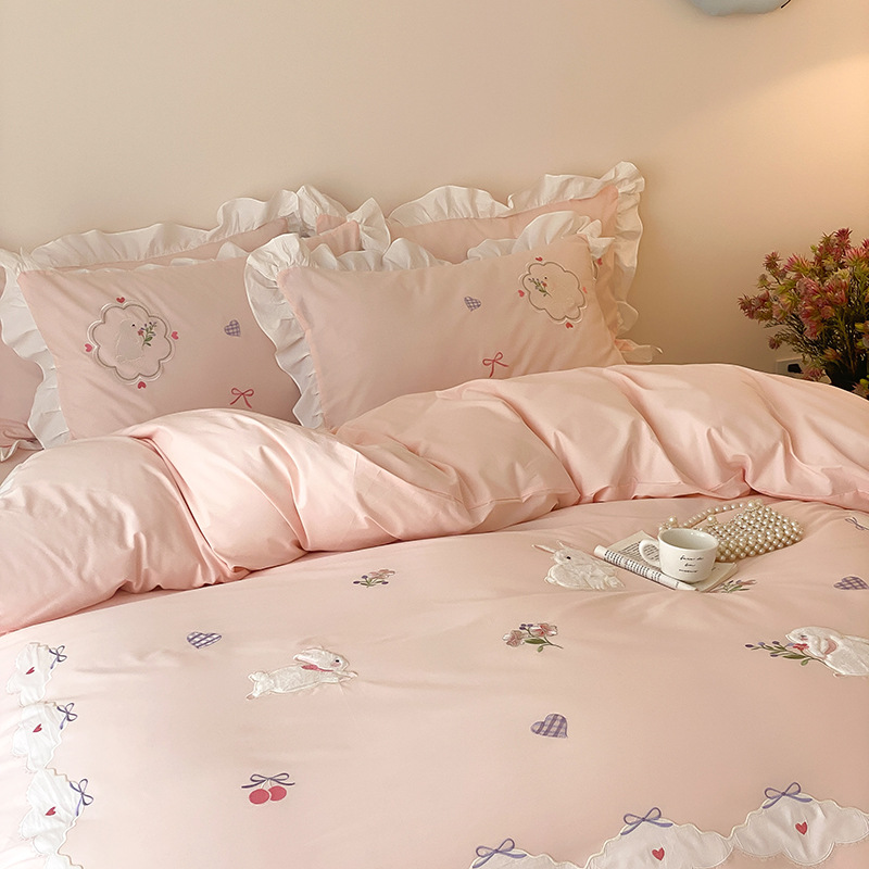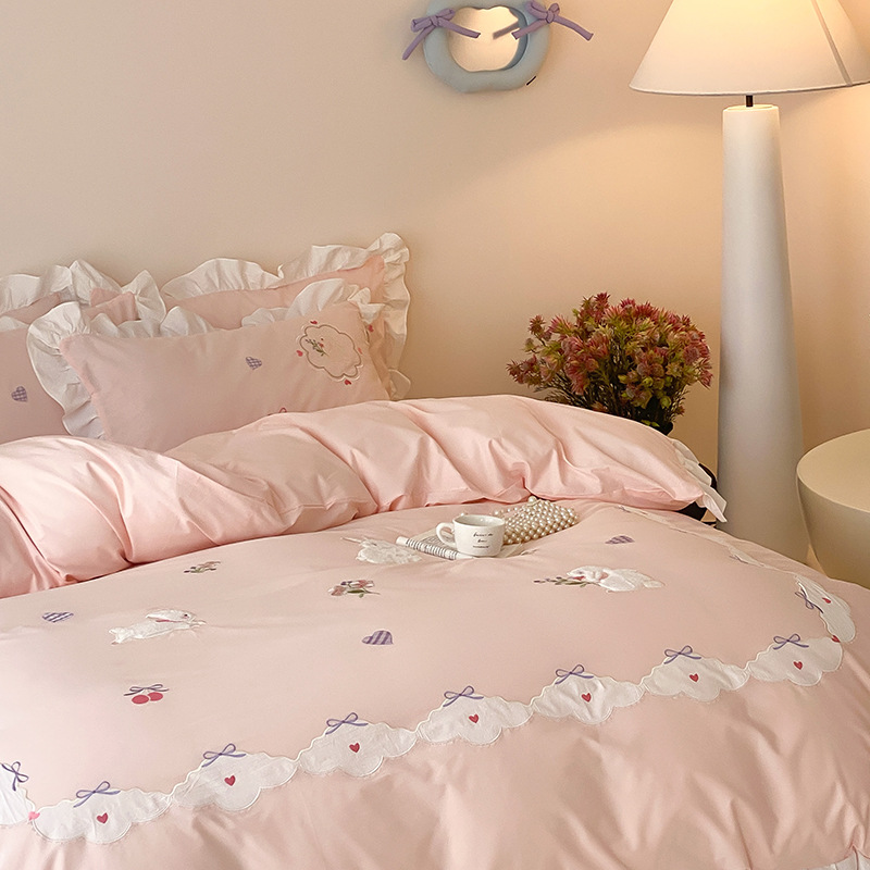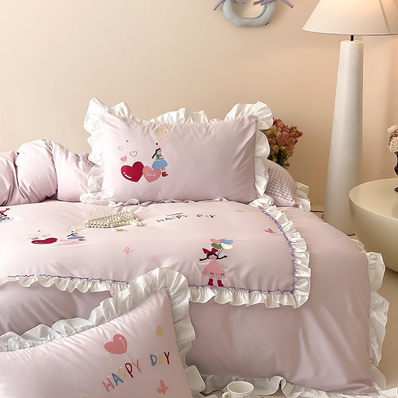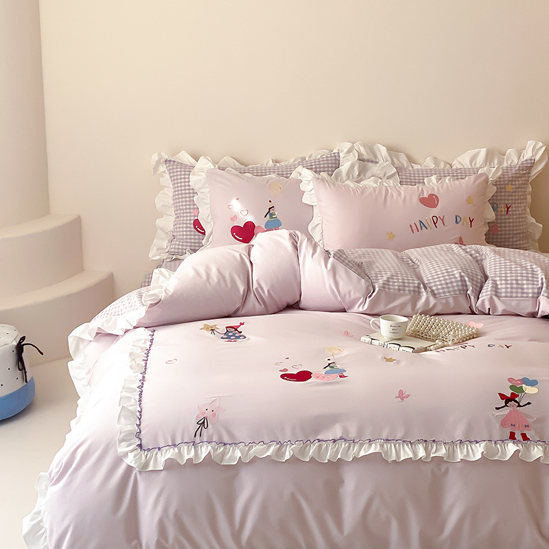 퓨어 코튼 4 피스 세트 씻은 코튼 연꽃 잎 레이스 자수 3 피스 세트 퀼트 커버 침대 시트 침상