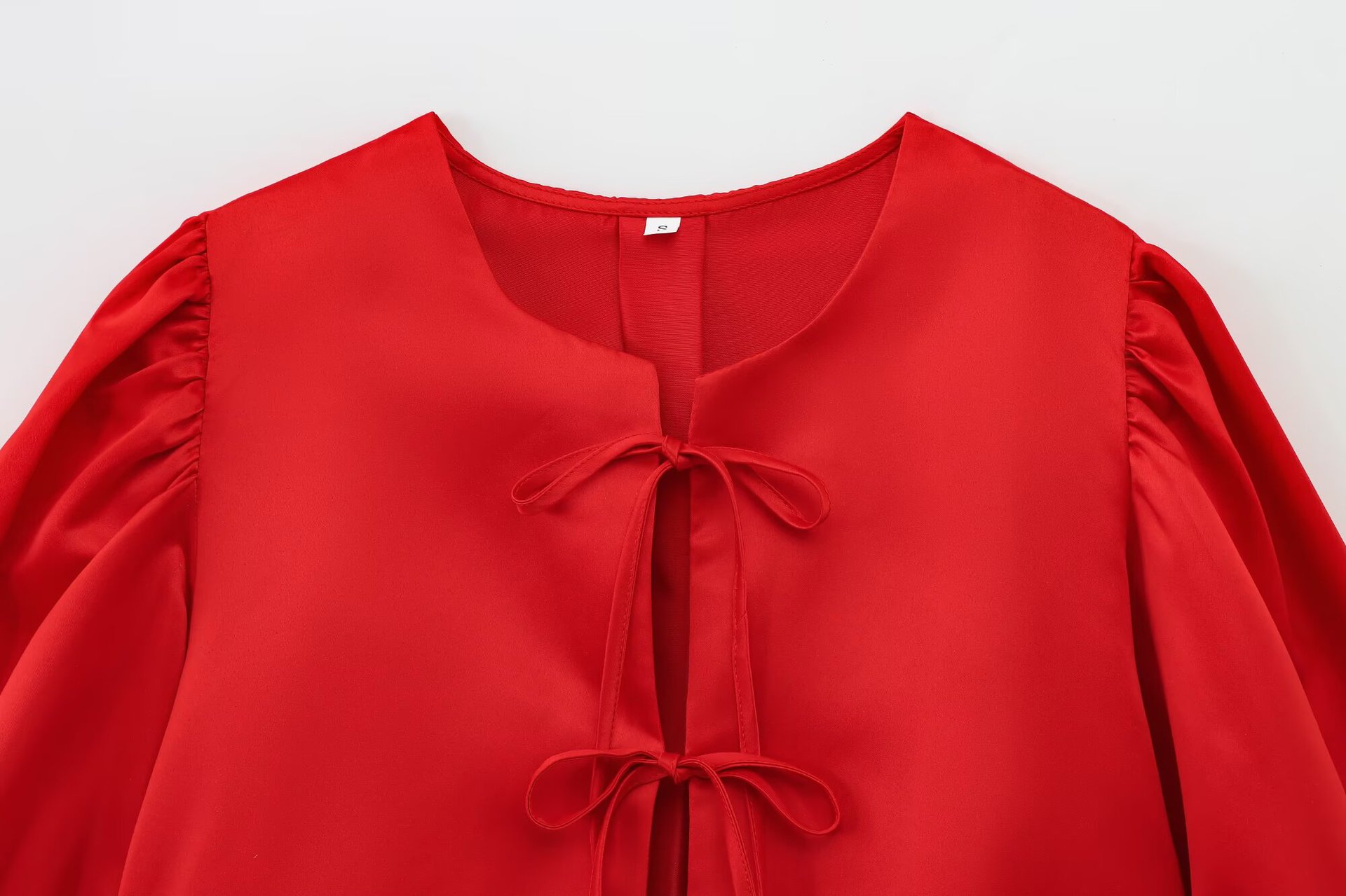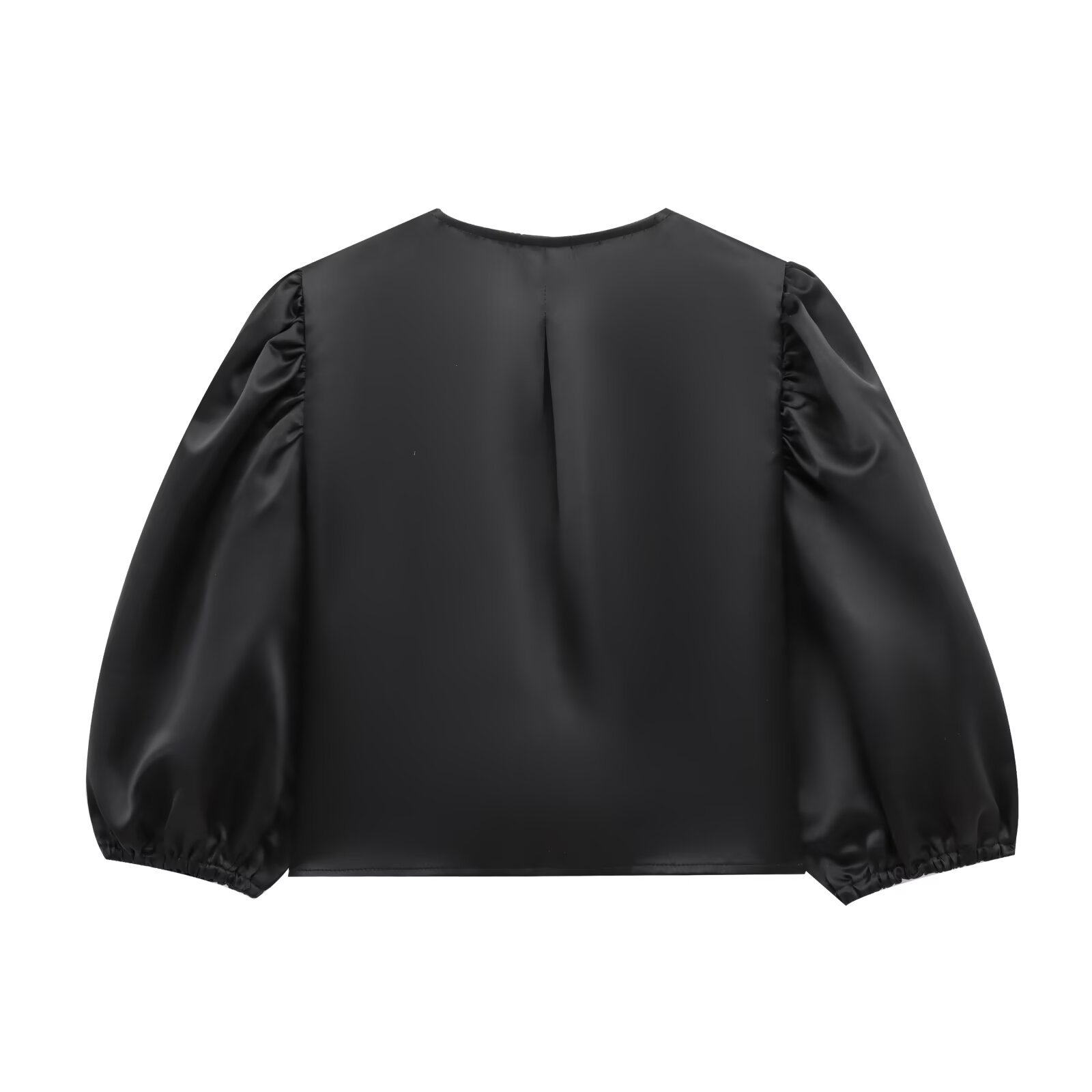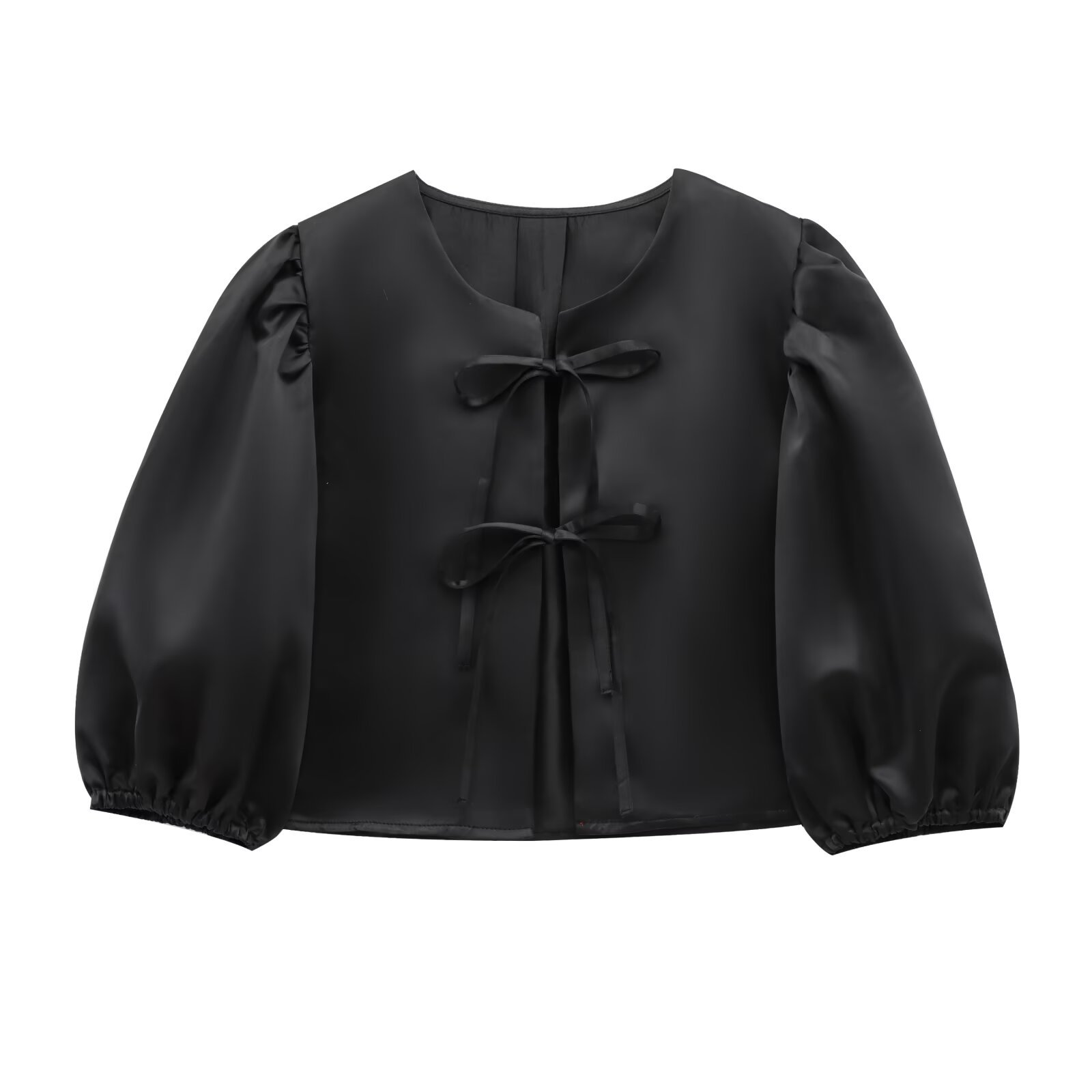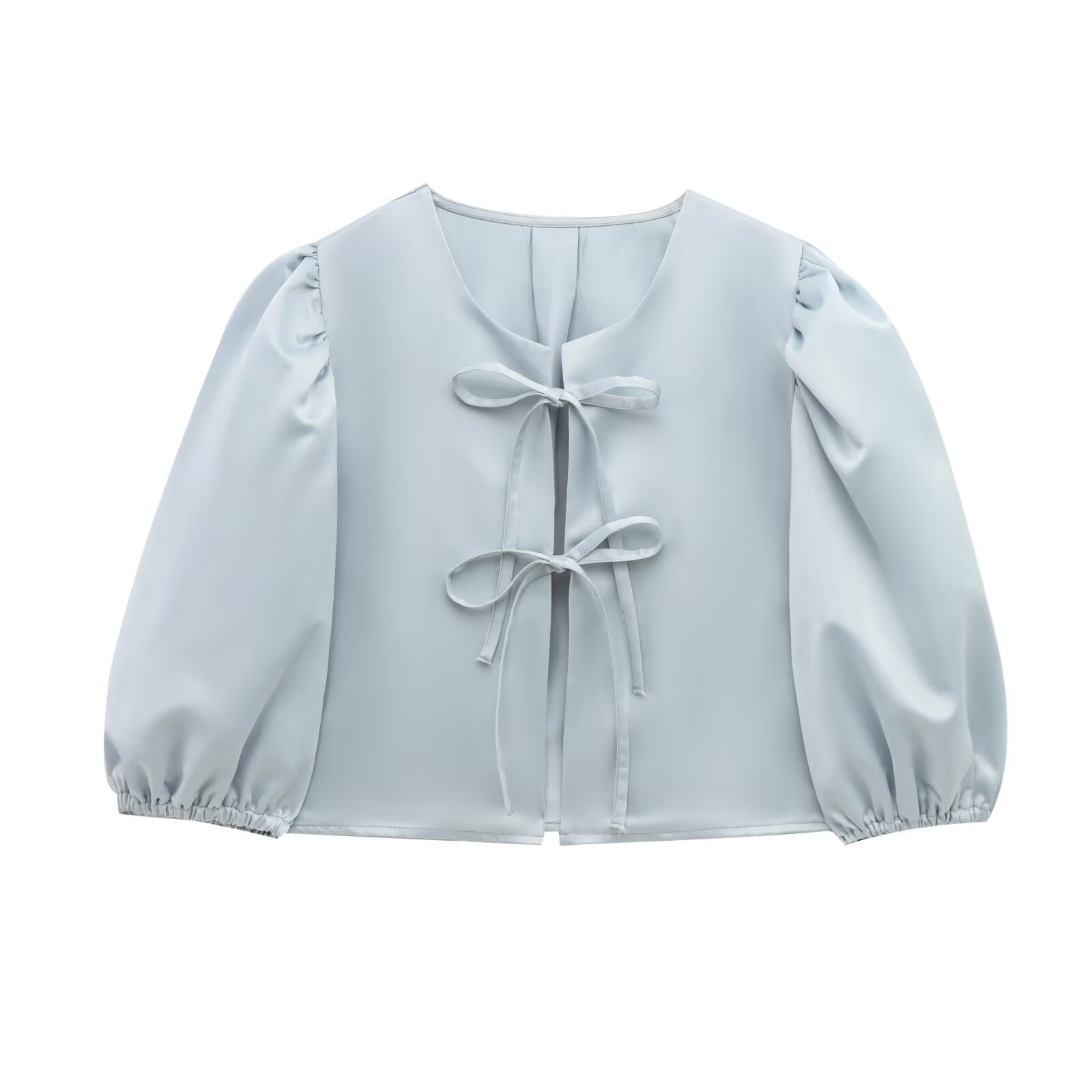 2025 봄 새로운 유럽과 미국의 국경 여성 실크 새틴 질감 버블 슬리브 활 짧은 톱 w063 9228