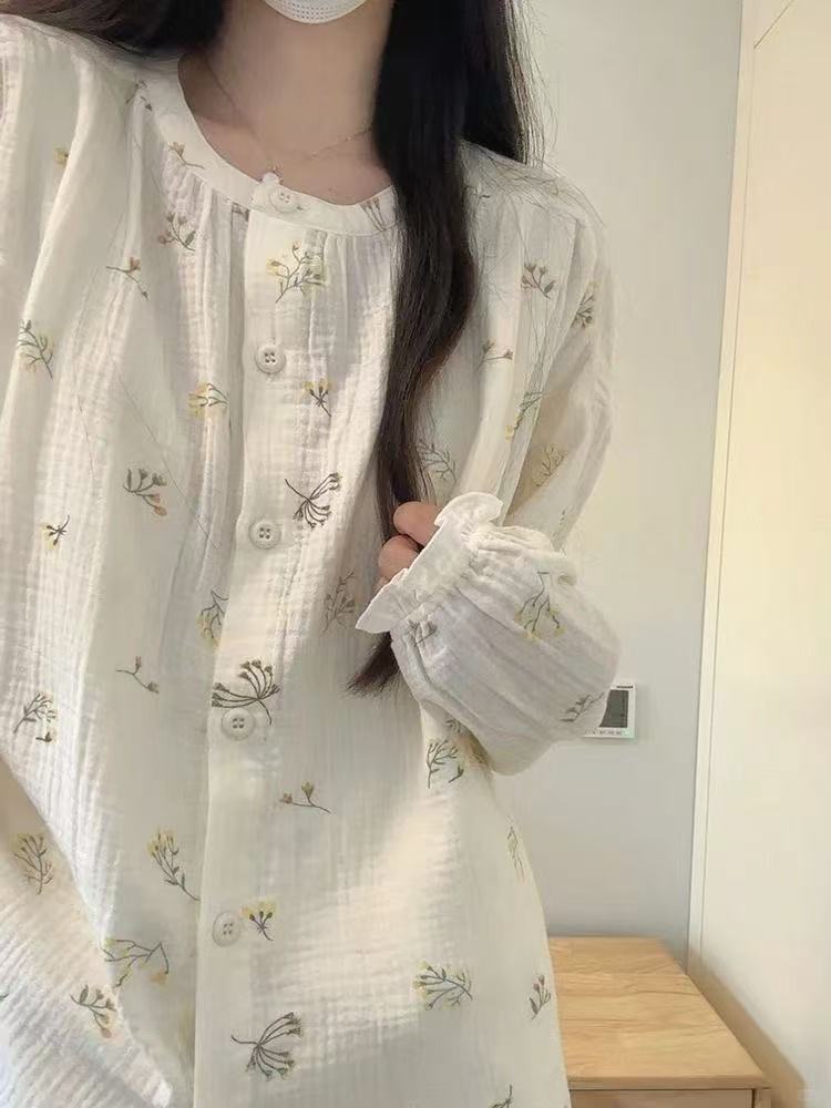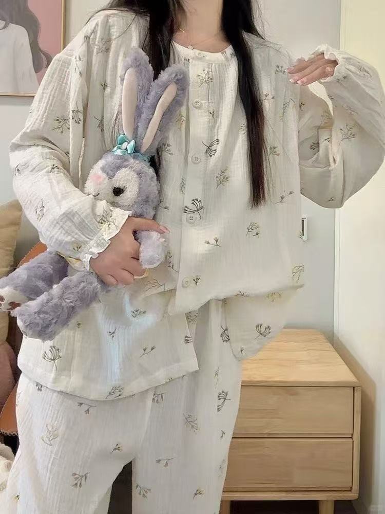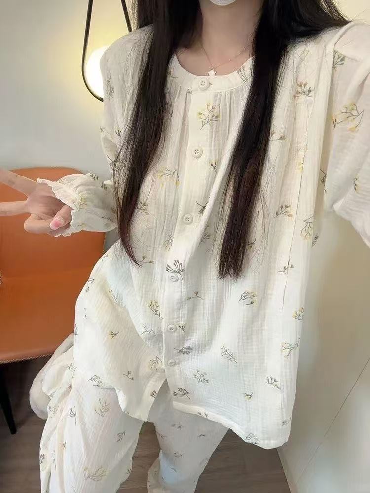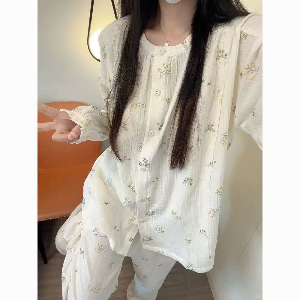 여성용 크로스보더 잠옷 봄 가을 2025 신상 긴팔 달콤하고 귀여운 고급스러운 라운드넥 홈웨어 대형 세트스토어 가기