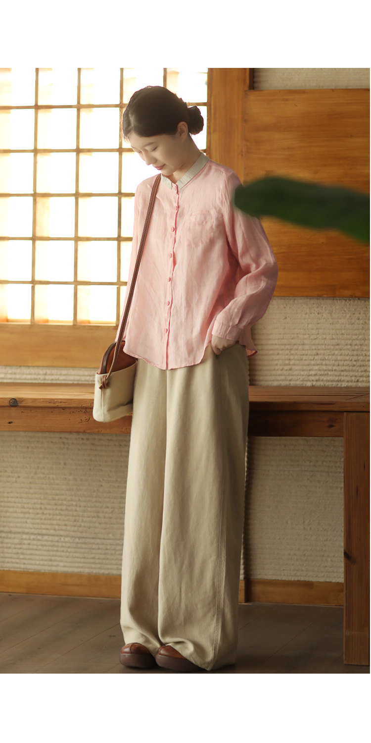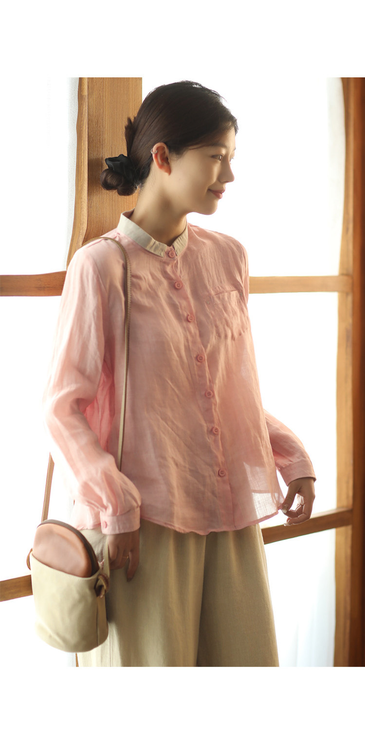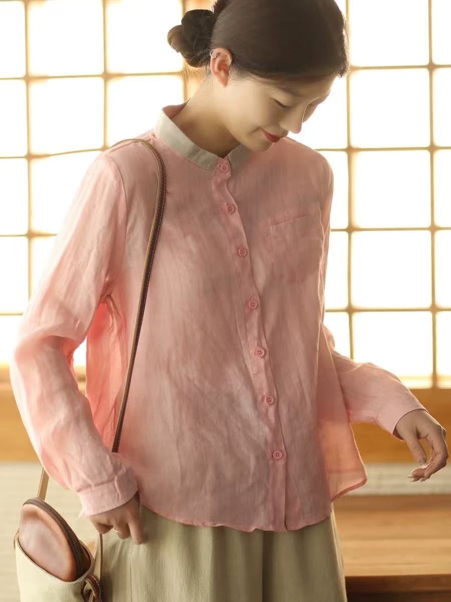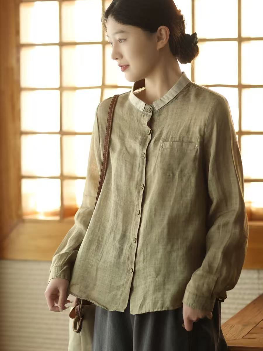 봄 새로운 빈티지 흑연 워시 라미 셔츠 여성 컬러 칼라 긴 소매 셔츠 카디건 탑 7087