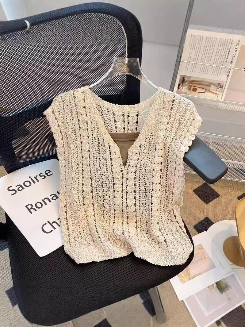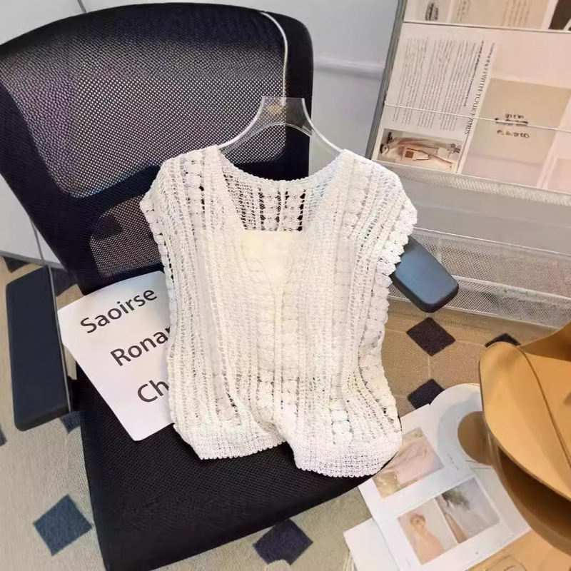 여성을위한 여름 V 넥 오픈 워크 니트 조끼 투피스 민소매 탑