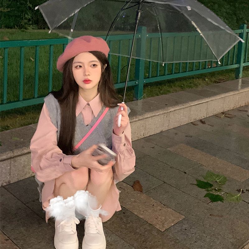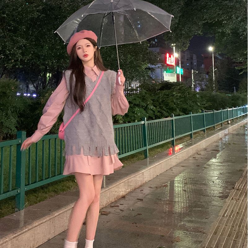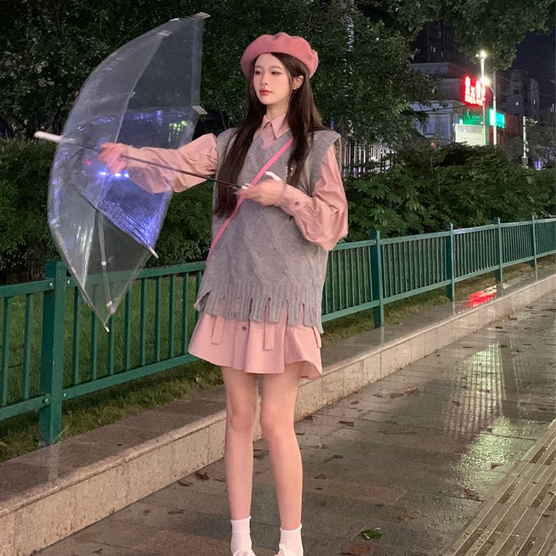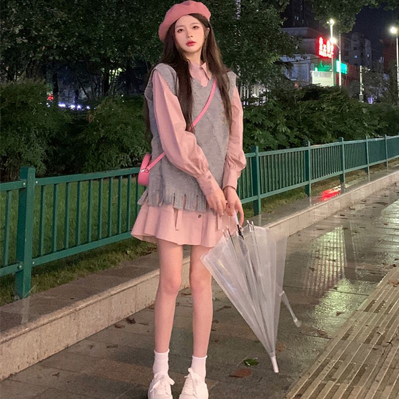 핑크 셔츠 스커트 스웨터 조끼 투피스 가을 세트 쌓인 달콤한 시원한 학업 스타일 세트와 함께 가을 복장스토어 가기