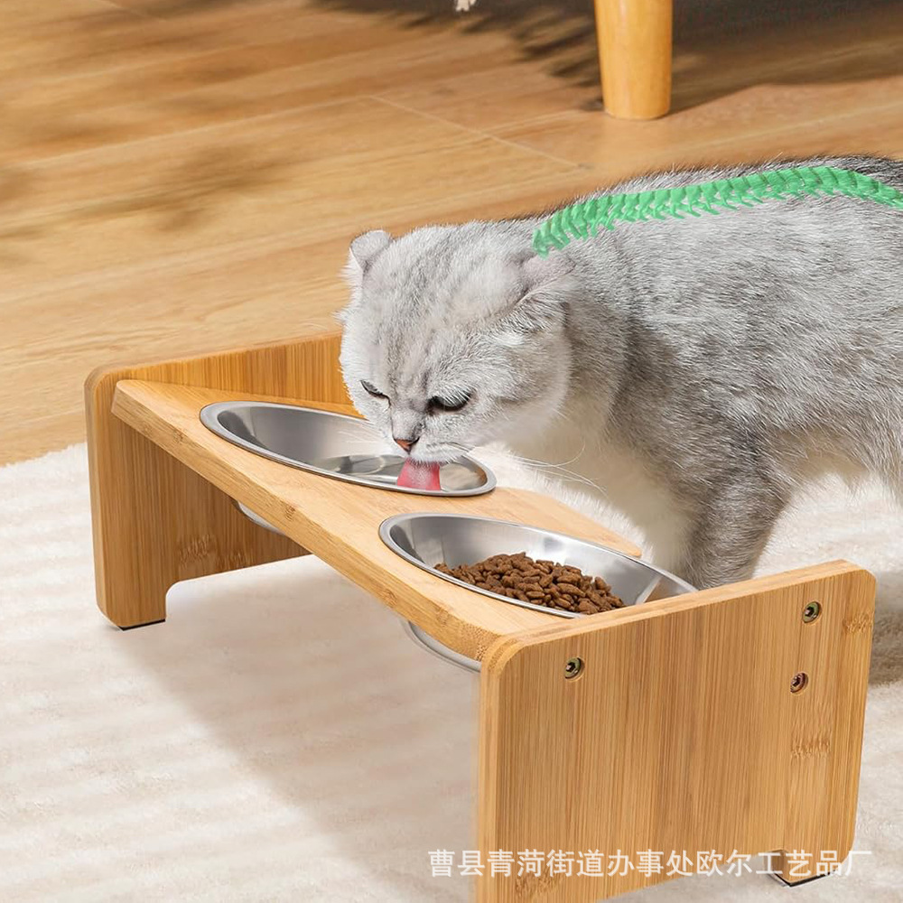 나무 높은 고양이 그릇 대나무 더블 그릇 고양이 그릇 랙 틸트 조정 가능한 단단한 나무 높은 고양이 그릇 브래킷 피더스토어 가기