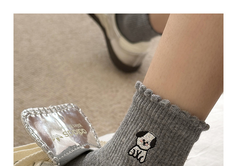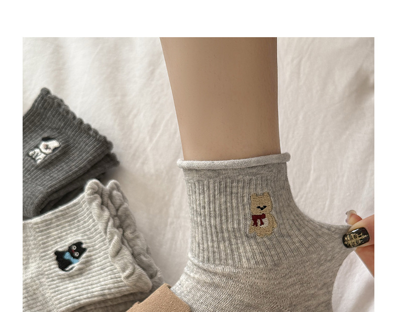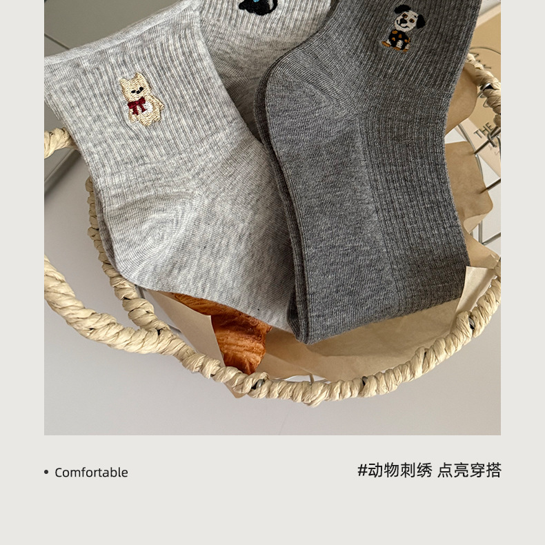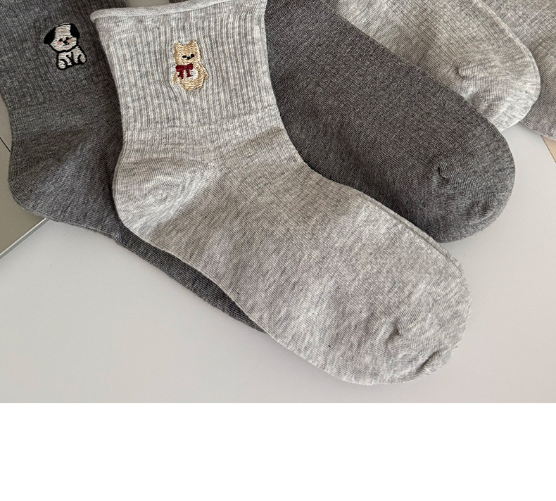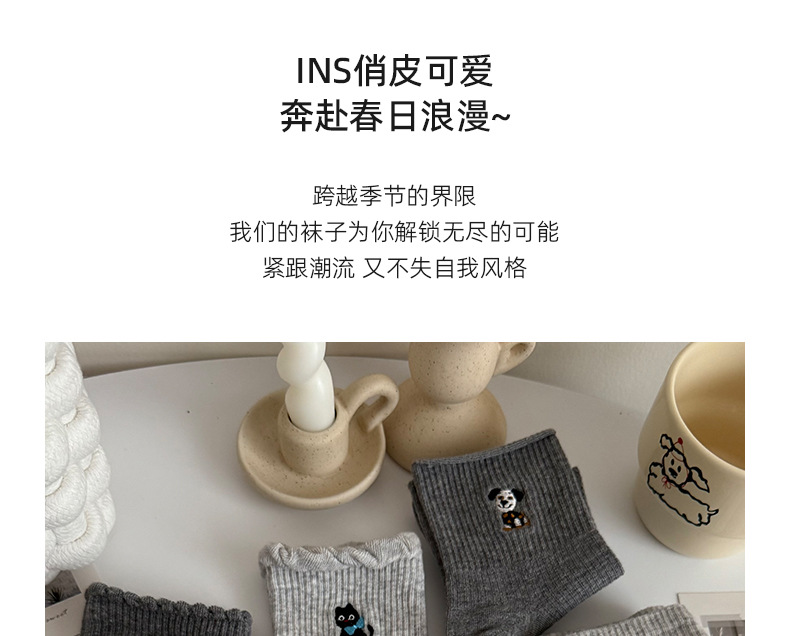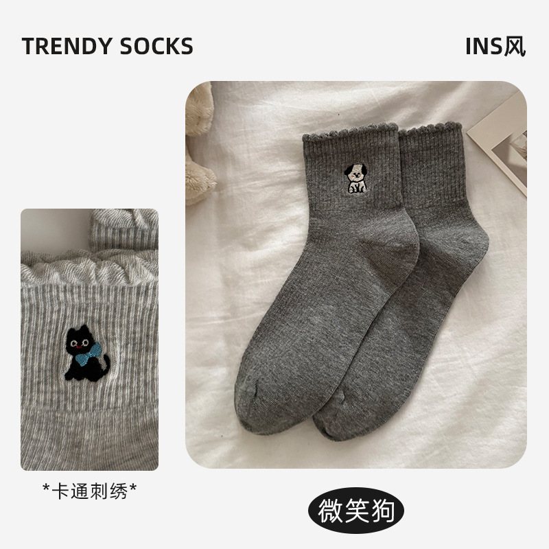 여성용 양말 가을 겨울용 면 양말 만화 자수 레이스 중간 길이 양말 귀여운 동물 무늬 회색 스포츠 양말스토어 가기