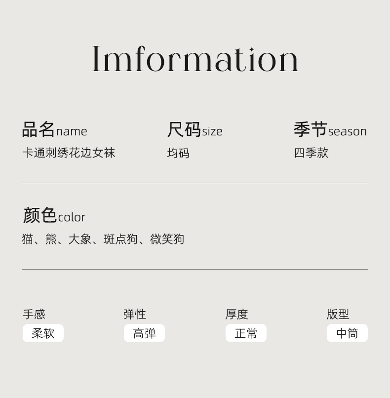여성용 양말 가을 겨울용 면 양말 만화 자수 레이스 중간 길이 양말 귀여운 동물 무늬 회색 스포츠 양말