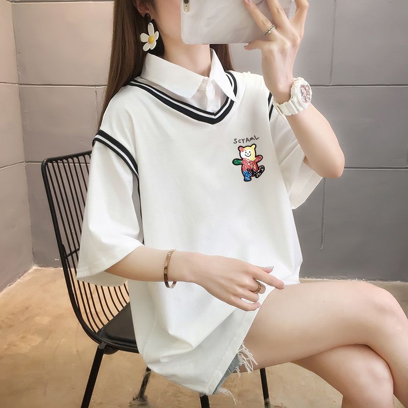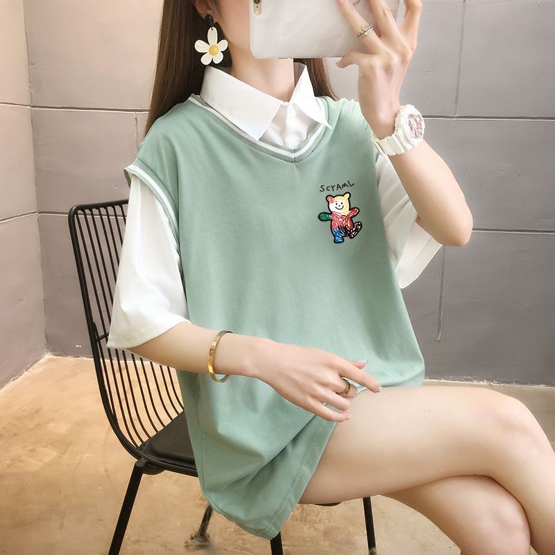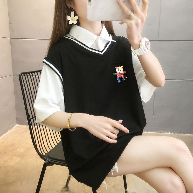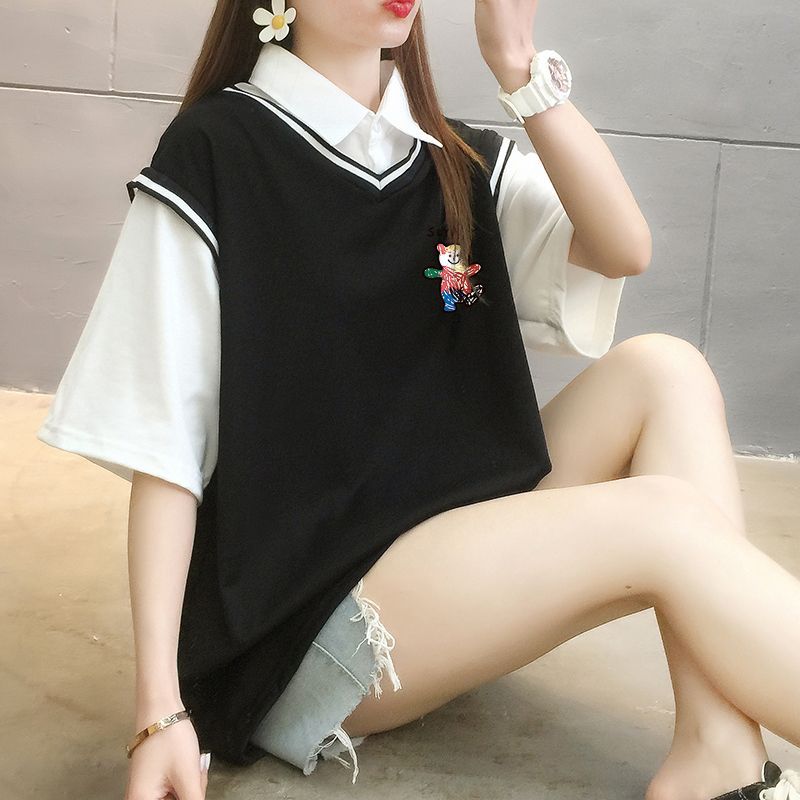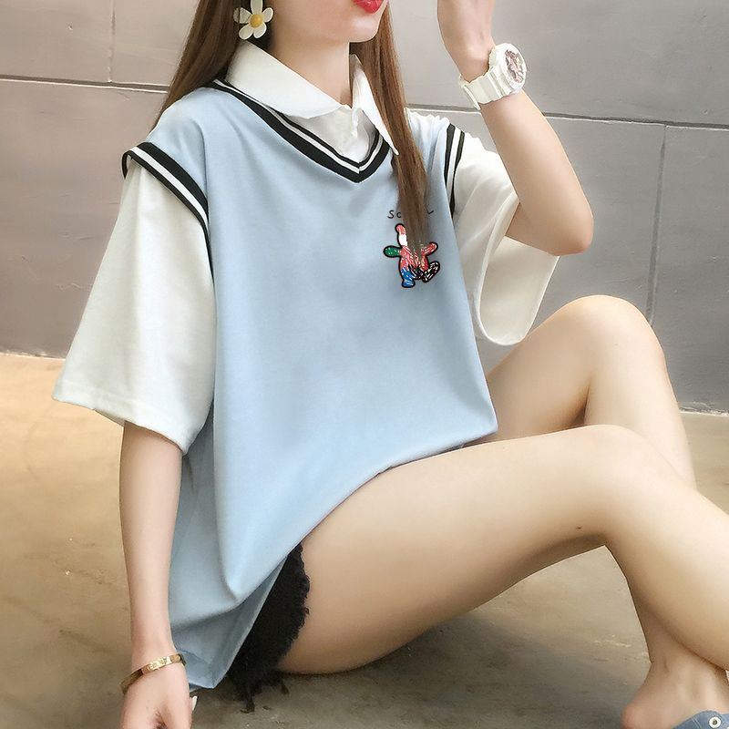 만화 가짜 투피스 반팔 티셔츠 소녀의 여름 원피스 2025 새 중학교 고등학생 캐주얼 옷깃 재킷스토어 가기