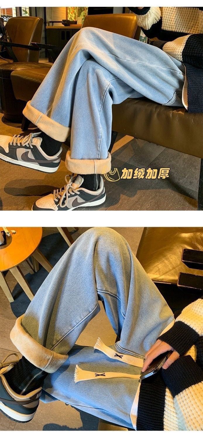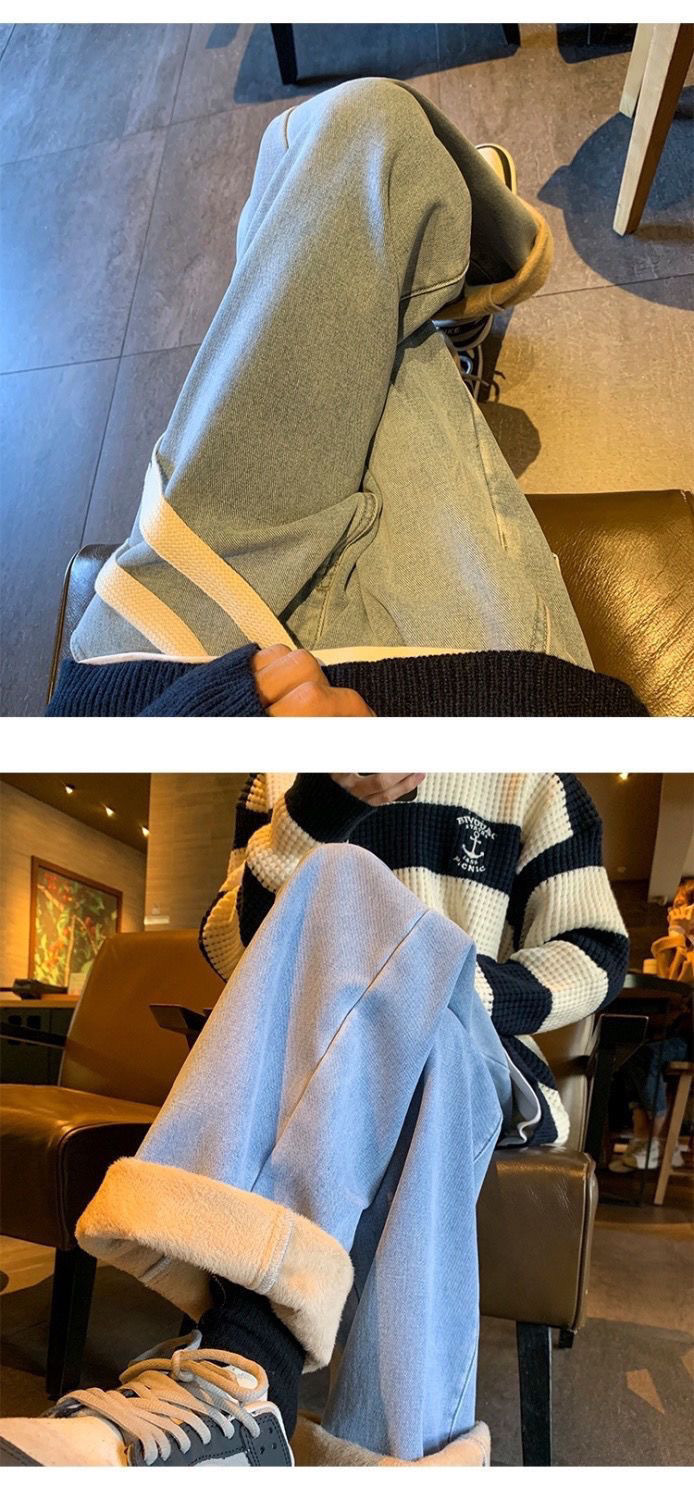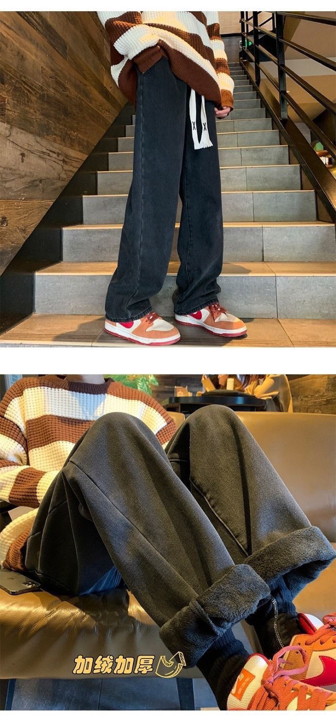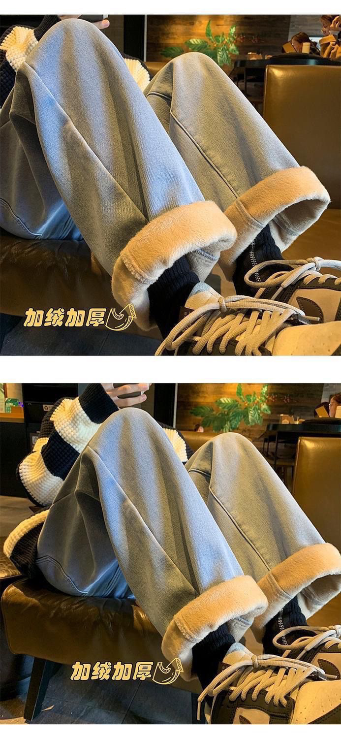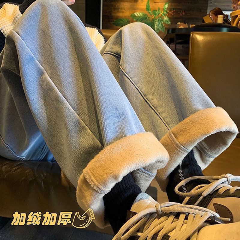 여학생을위한 기모 두꺼운 연기 회색 청바지 2024 겨울 따뜻한 외부 착용 높은 허리 딥 슬림 넓은 다리 바지스토어 가기