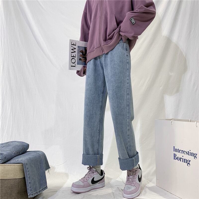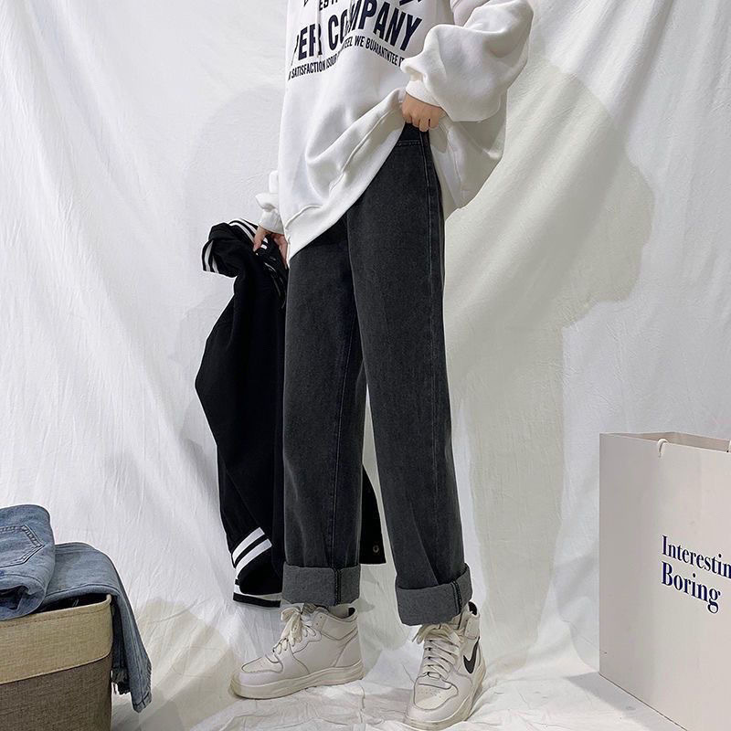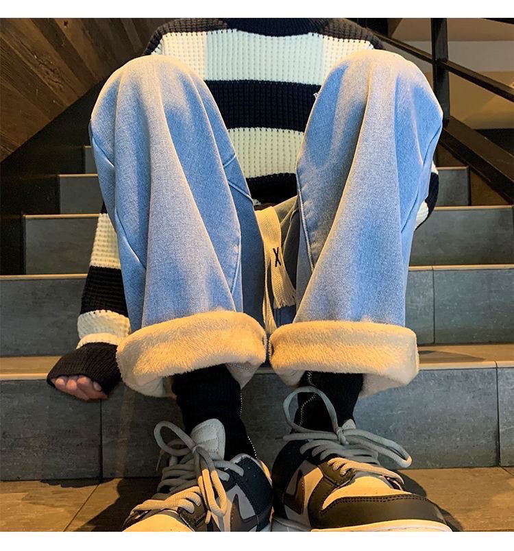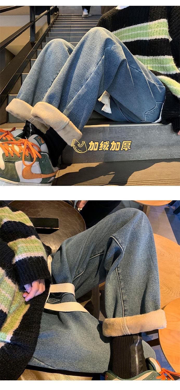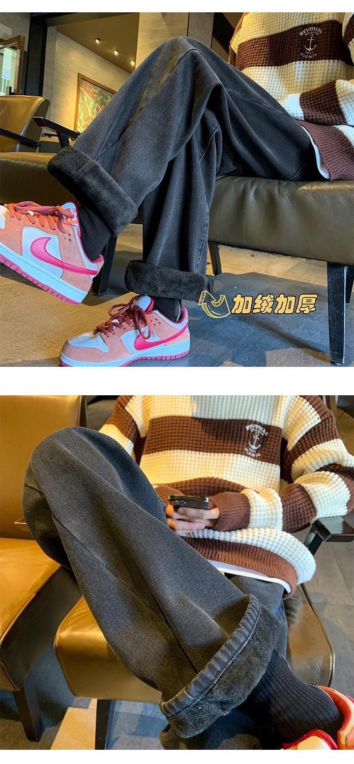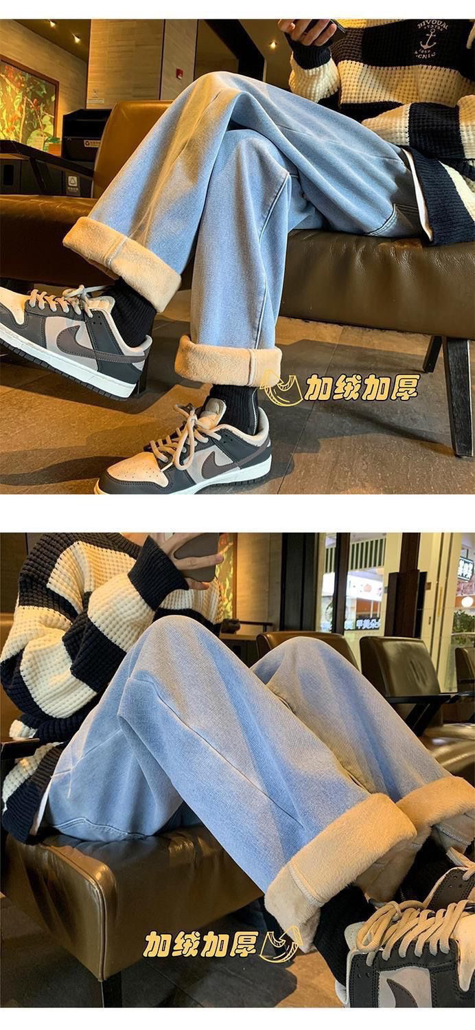 여학생을위한 기모 두꺼운 연기 회색 청바지 2024 겨울 따뜻한 외부 착용 높은 허리 딥 슬림 넓은 다리 바지스토어 가기