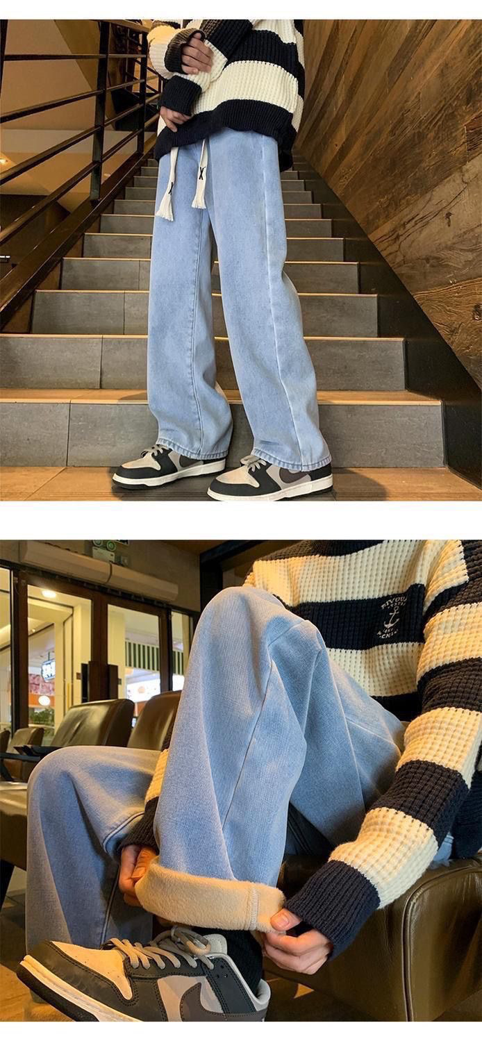 여학생을위한 기모 두꺼운 연기 회색 청바지 2024 겨울 따뜻한 외부 착용 높은 허리 딥 슬림 넓은 다리 바지
