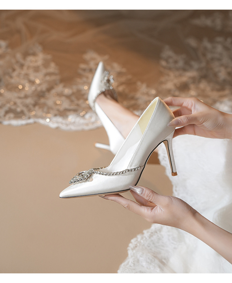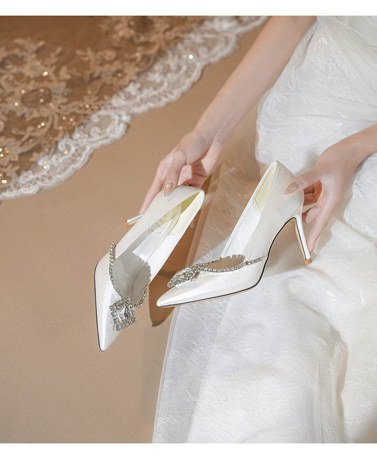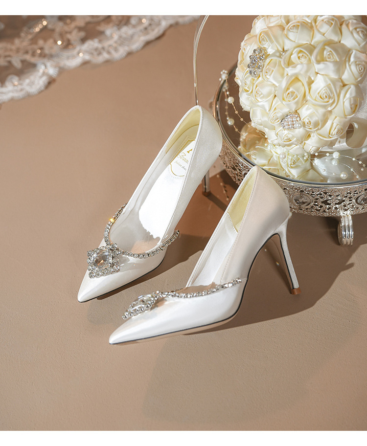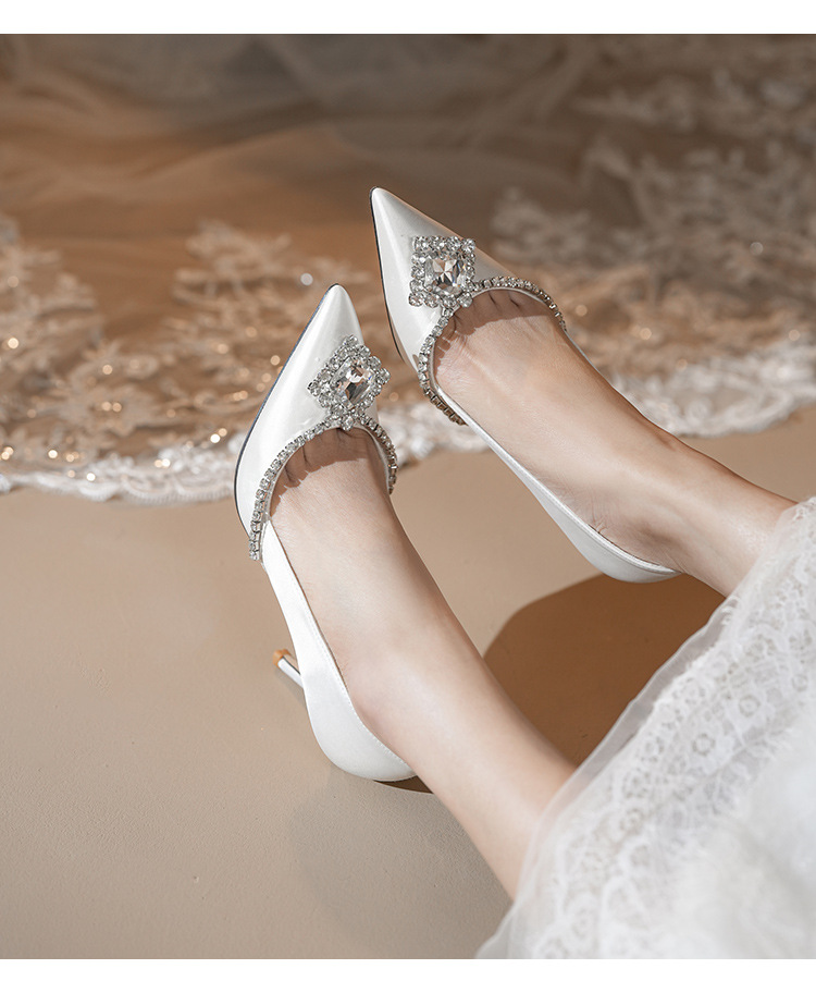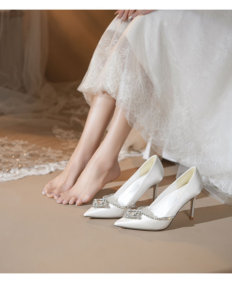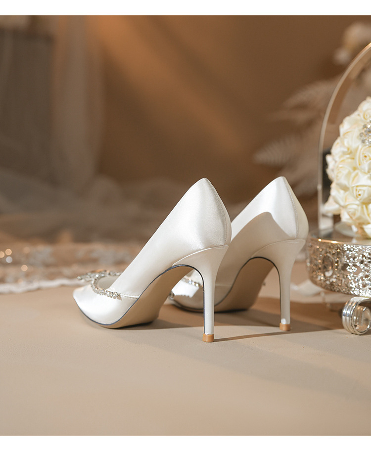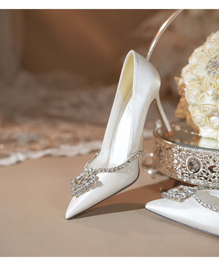 화이트 라인스톤 하이힐 여성 2025 새로운 뾰족한 스틸레토 힐 사틴 프랑스 웨딩 슈즈 웨딩 원피스 신부 신발스토어 가기