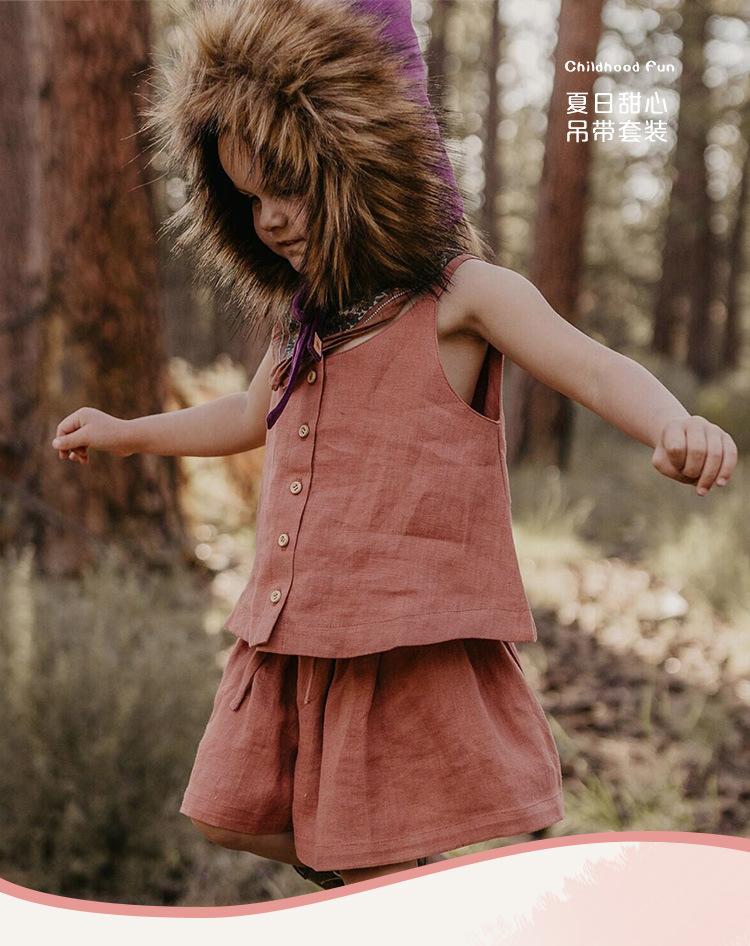 어린이 라미 코튼 세트 2025 년 여름 싱글 브레스트 미수리 슬링 탑 아동복 투피스 세트스토어 가기