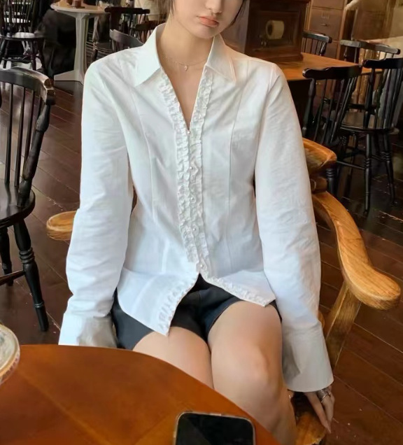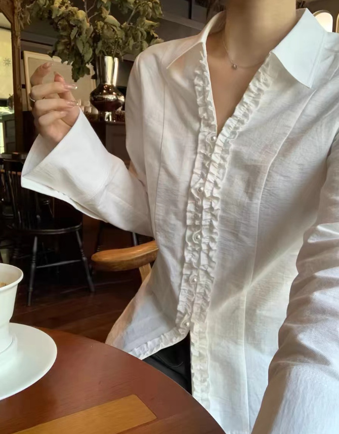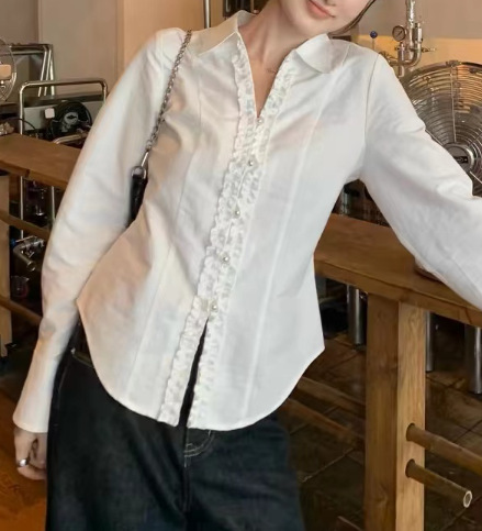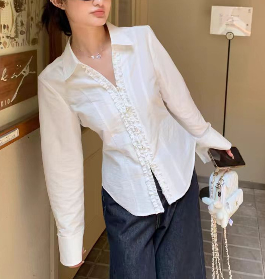 2024 가을 난양 딸! 화이트 타이트 웨이스트 레이스 슬림 펄 버튼 탑 셔츠 긴 소매 V-넥 셔츠스토어 가기