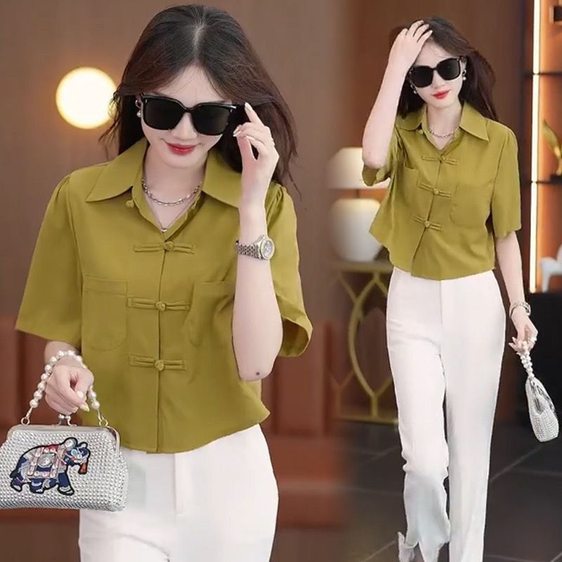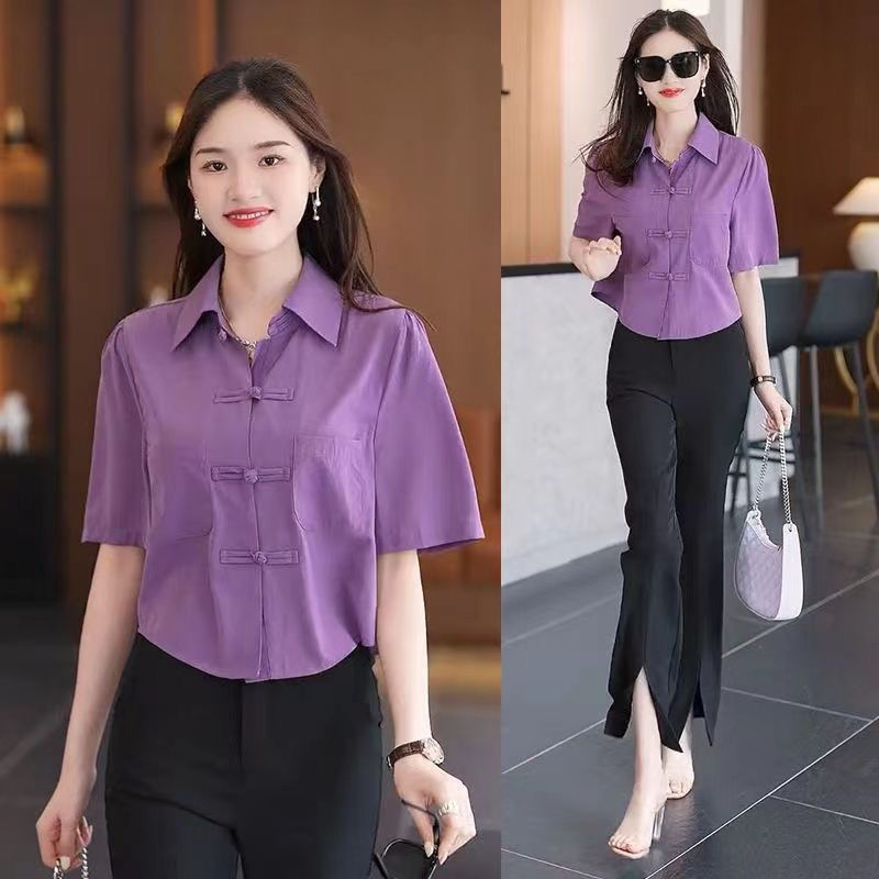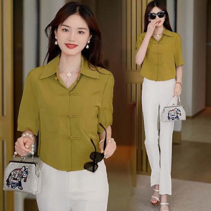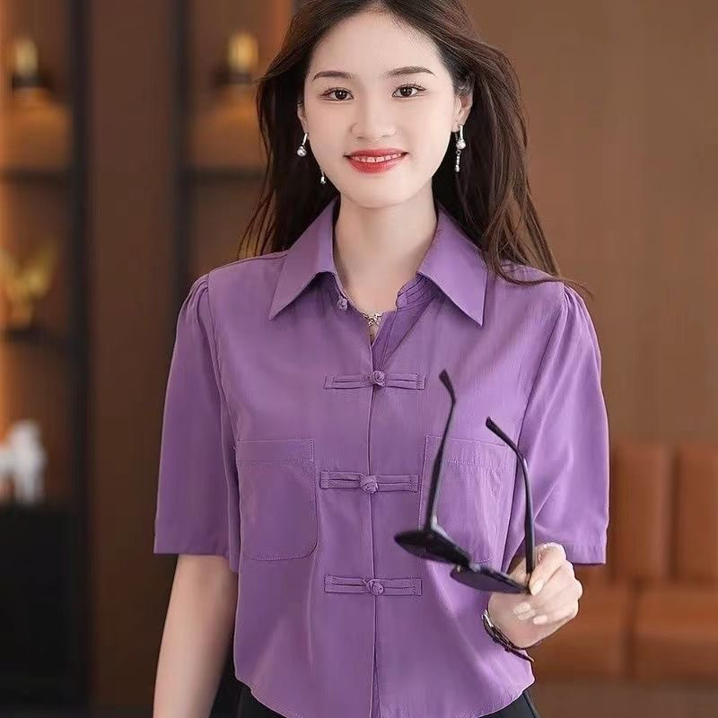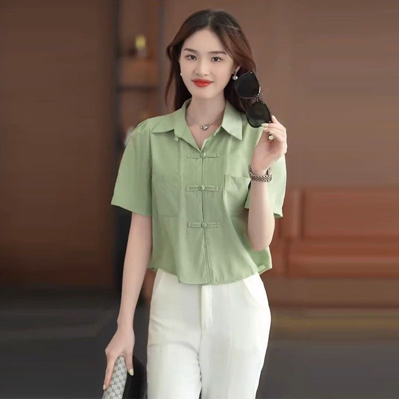 유럽 빈티지 쉬폰 셔츠 여성 여름 2025 새로운 국가 스타일 버튼 작은 셔츠 버블 소매 짧은 상단 색상