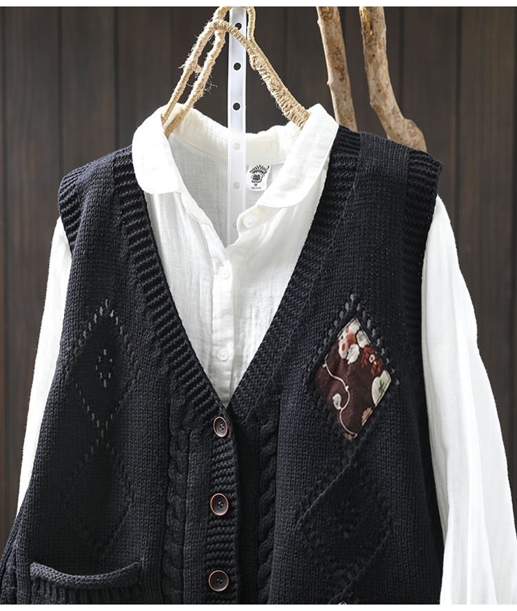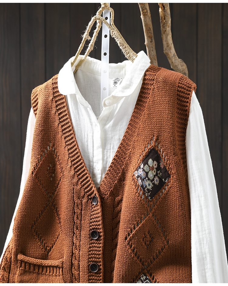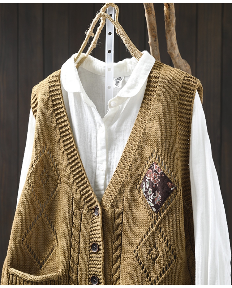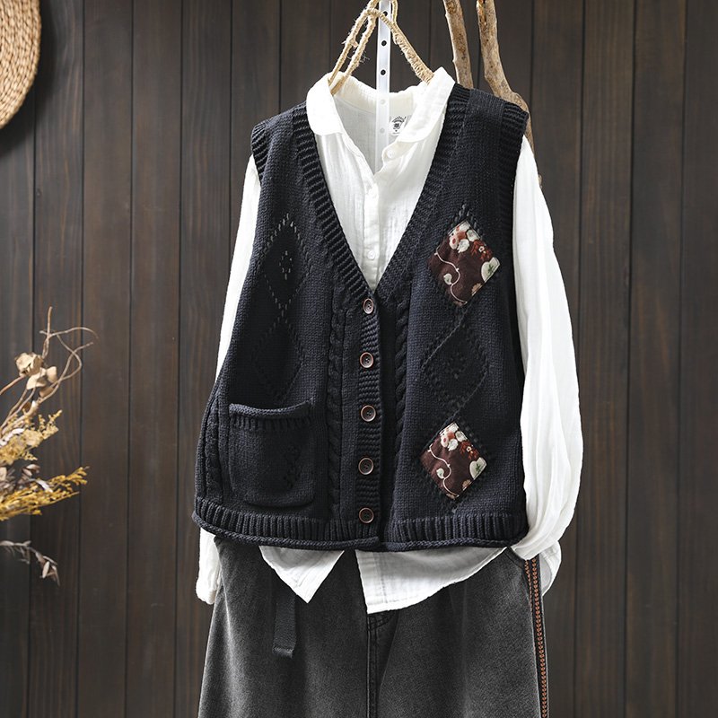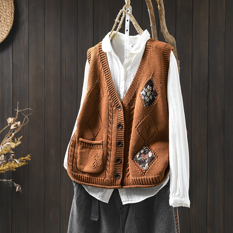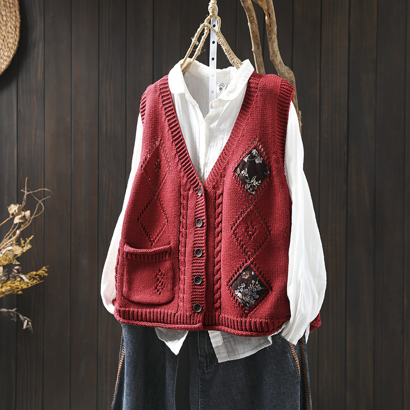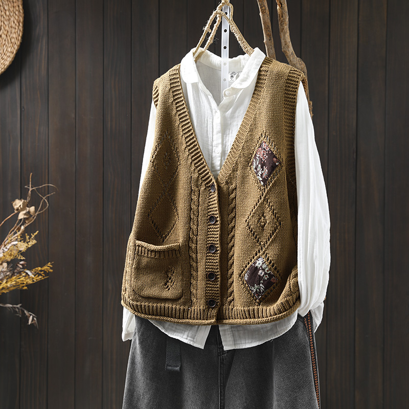 패딩 드 마름모 빈 V-넥 코튼 니트 조끼 카디건 여성용 루즈 2025 스프링 빈티지 캐주얼 스택 웨이스트 코트