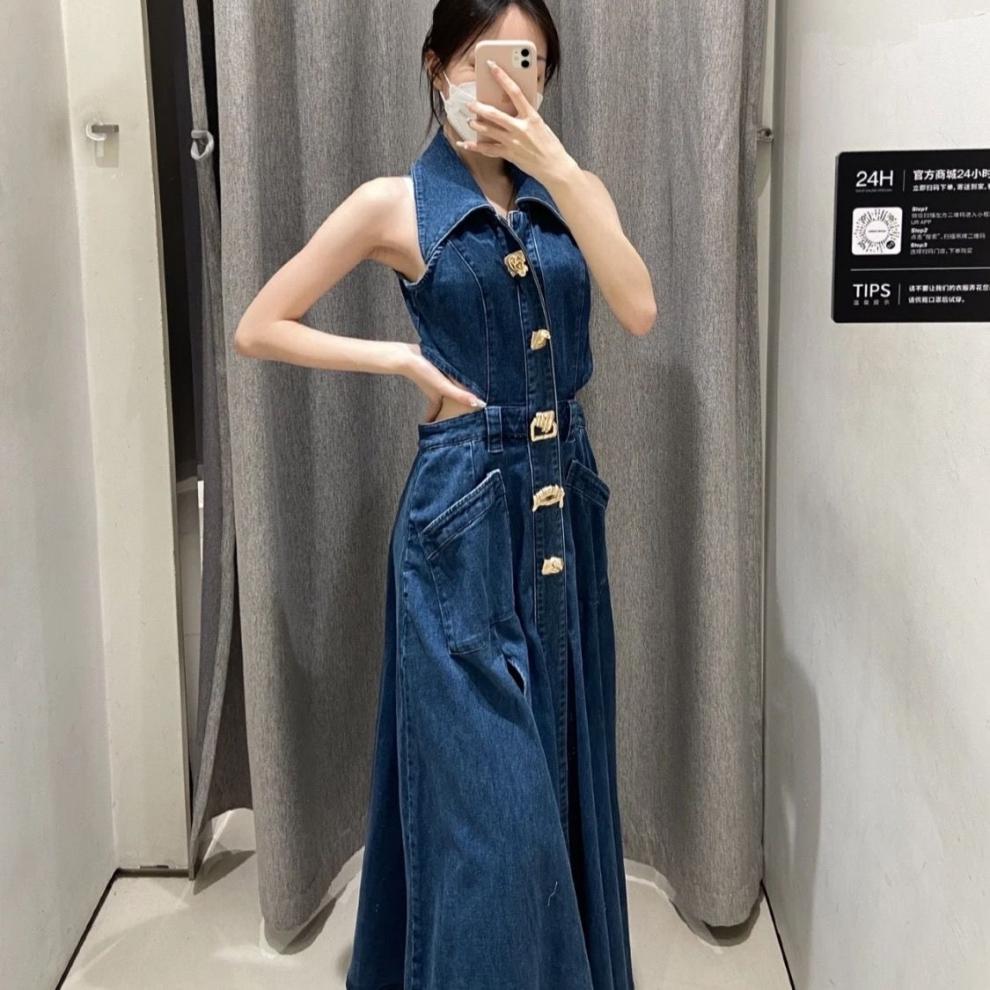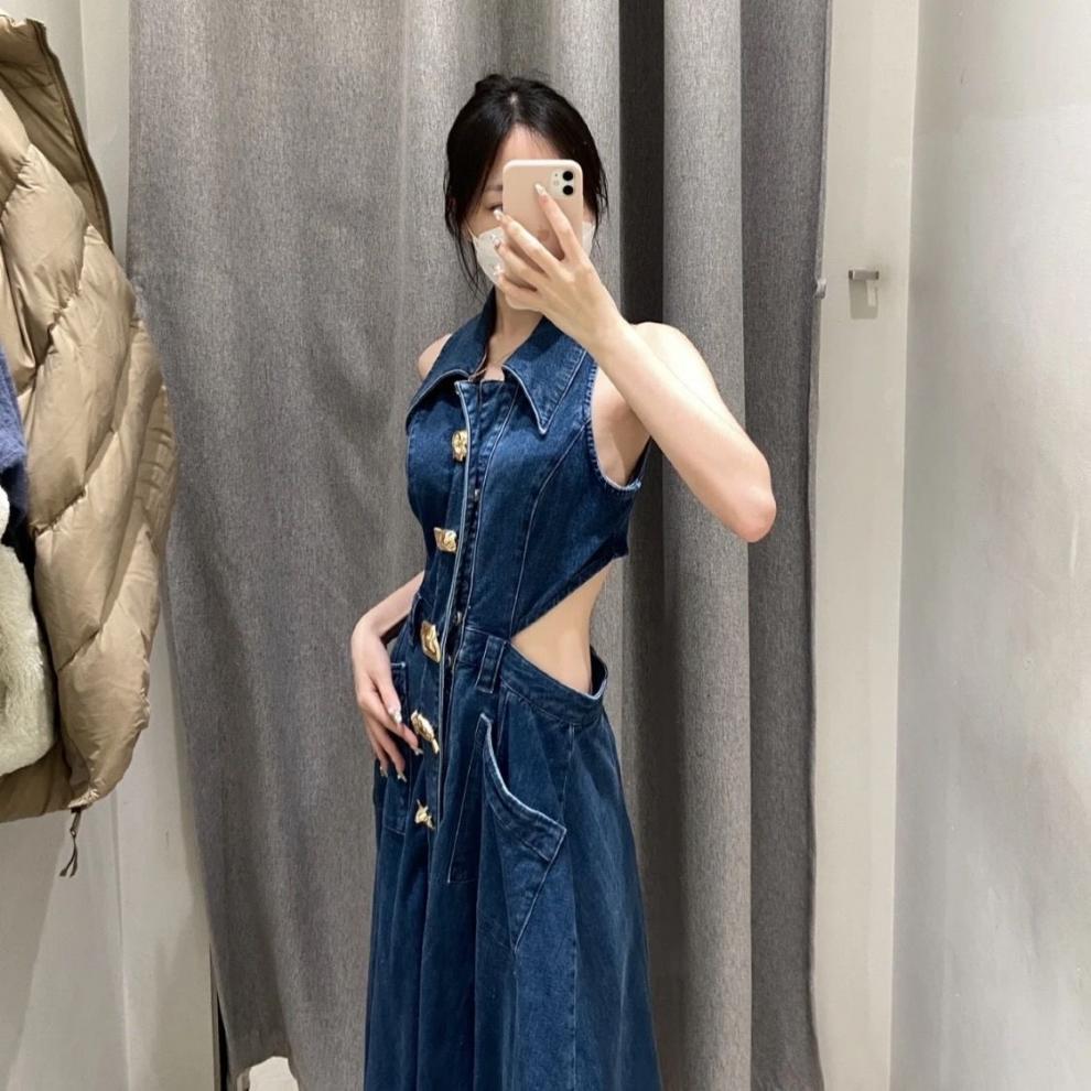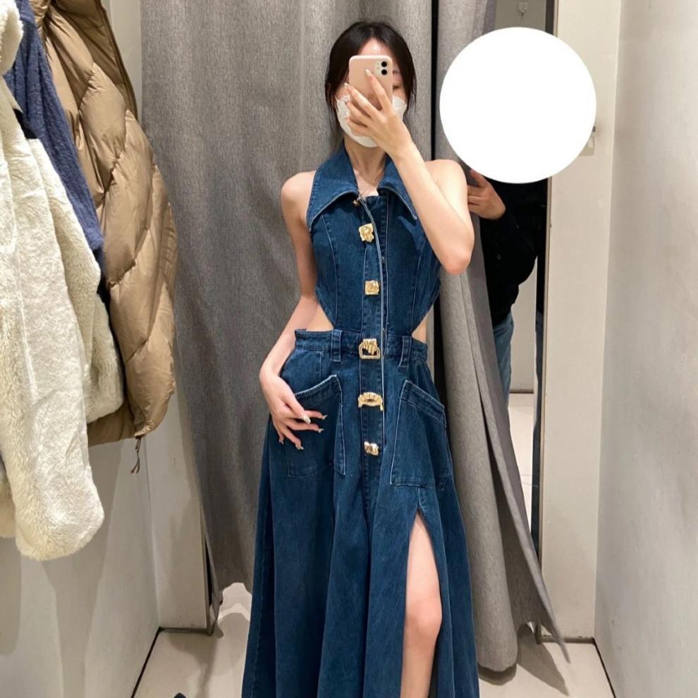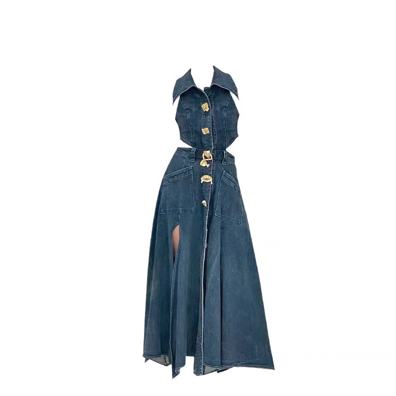 틈새 복고풍 디자인 센스 봄과 여름 착용 할로우 오픈 허리 스플릿 긴 원피스 민소매 데님 허리 원피스 여성 신제품스토어 가기