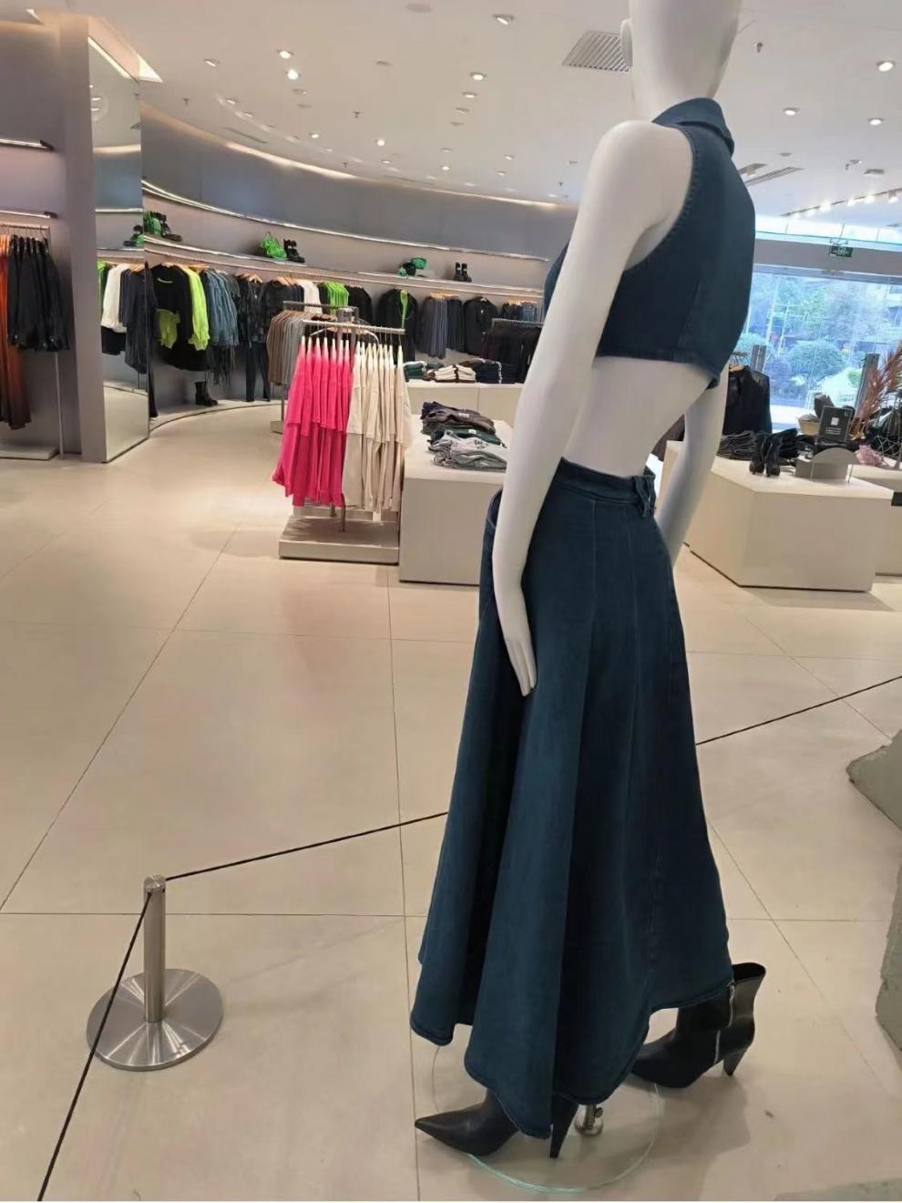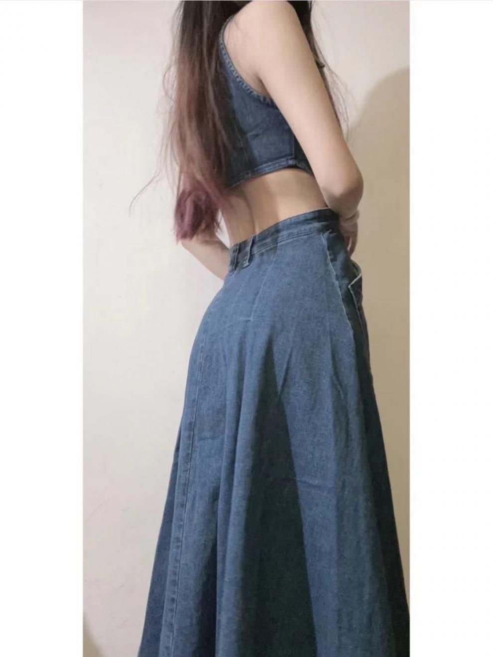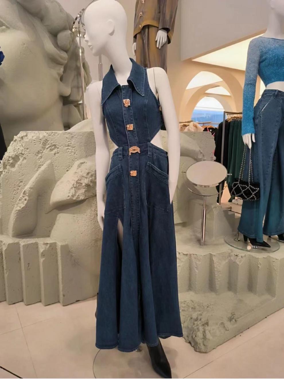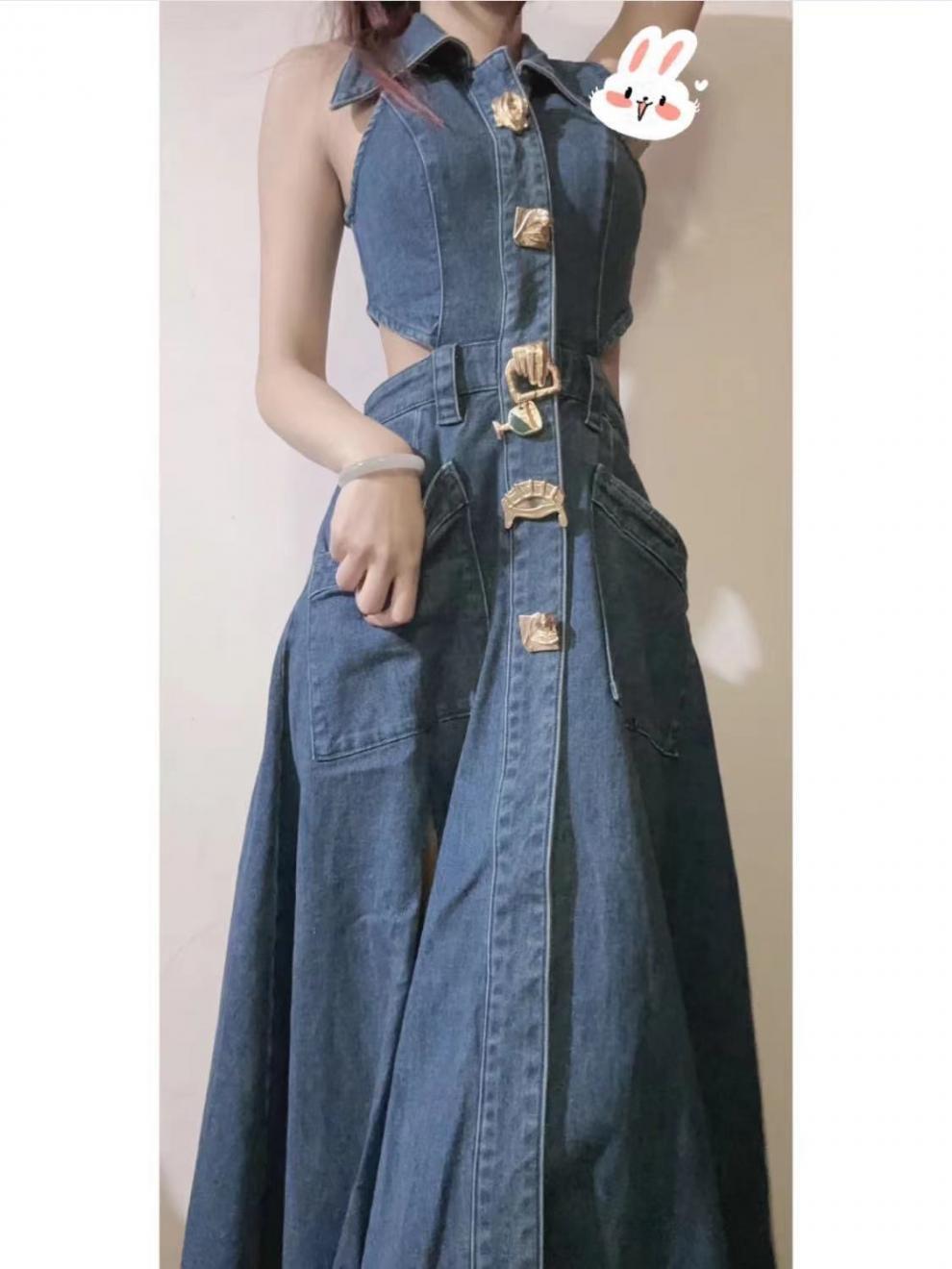 틈새 복고풍 디자인 센스 봄과 여름 착용 할로우 오픈 허리 스플릿 긴 원피스 민소매 데님 허리 원피스 여성 신제품스토어 가기