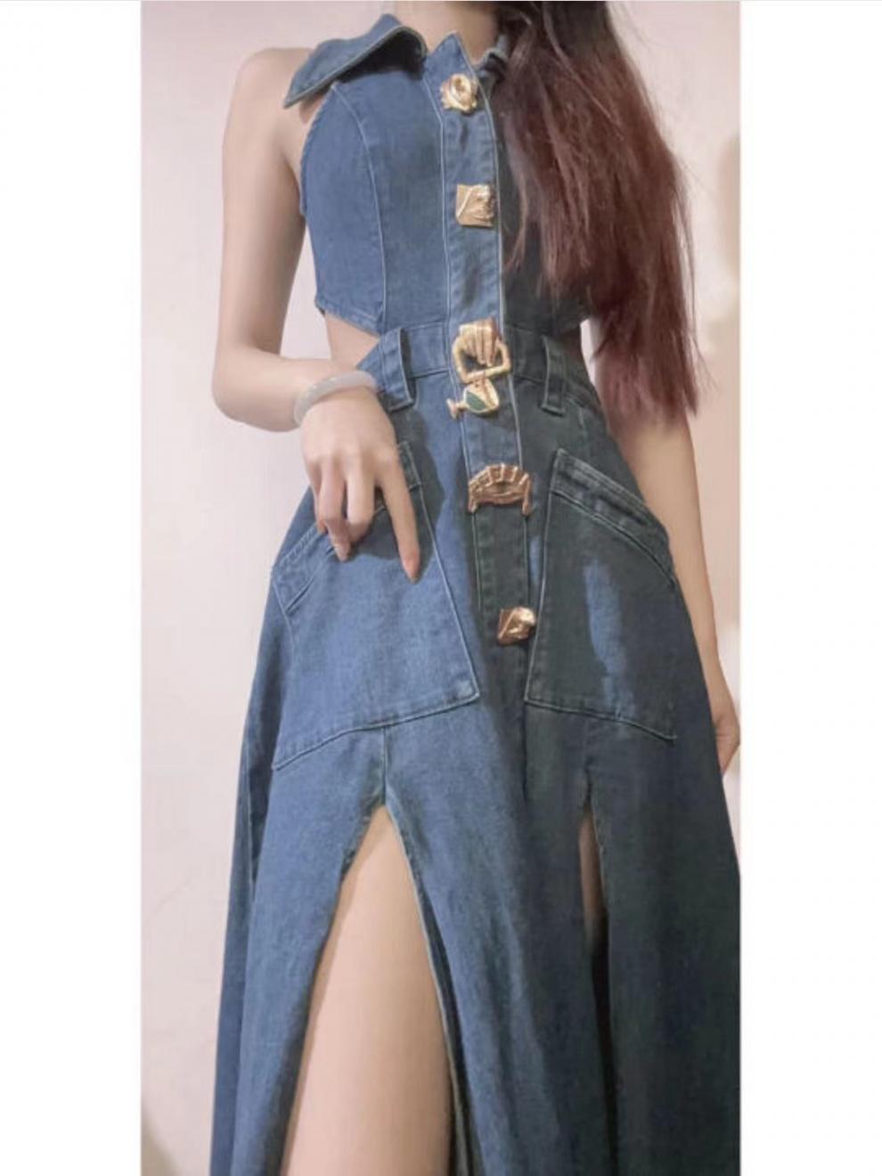 틈새 복고풍 디자인 센스 봄과 여름 착용 할로우 오픈 허리 스플릿 긴 원피스 민소매 데님 허리 원피스 여성 신제품