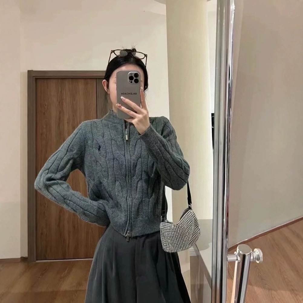 RL 재고 라프 여성용 트위스트 니트 코트 조랑말 자수 더블 지퍼 니트 가디건 여성 상의 3D 효과