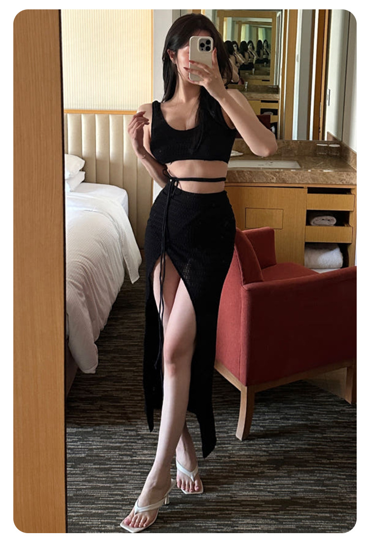 새로운 섹시한 백리스 사이즈 가슴 푸시 업 패션 스트랩 하이 웨이스트 벨리 커버 스플릿 롱 스커트 수영복 여성용 3 피스 세트