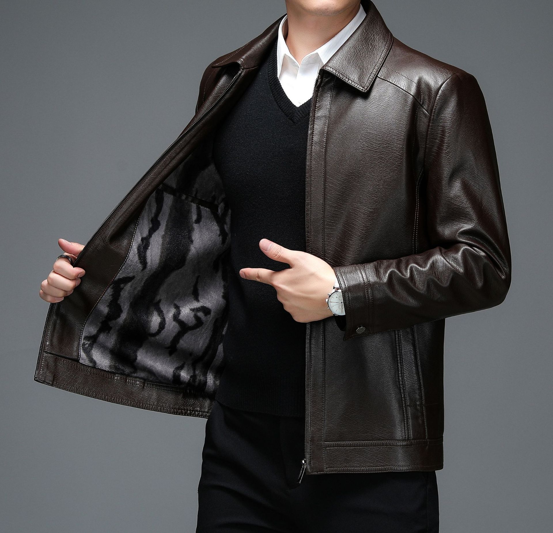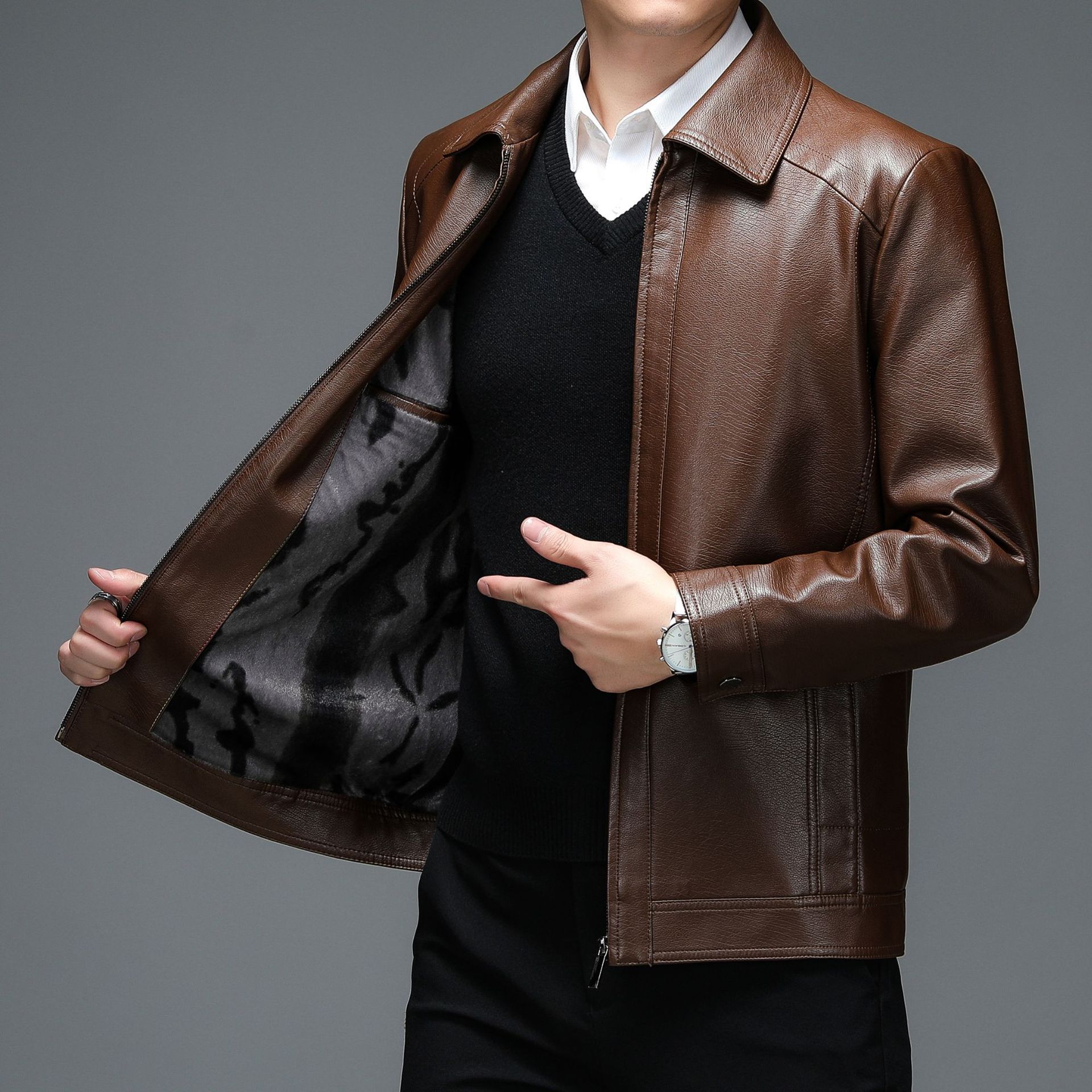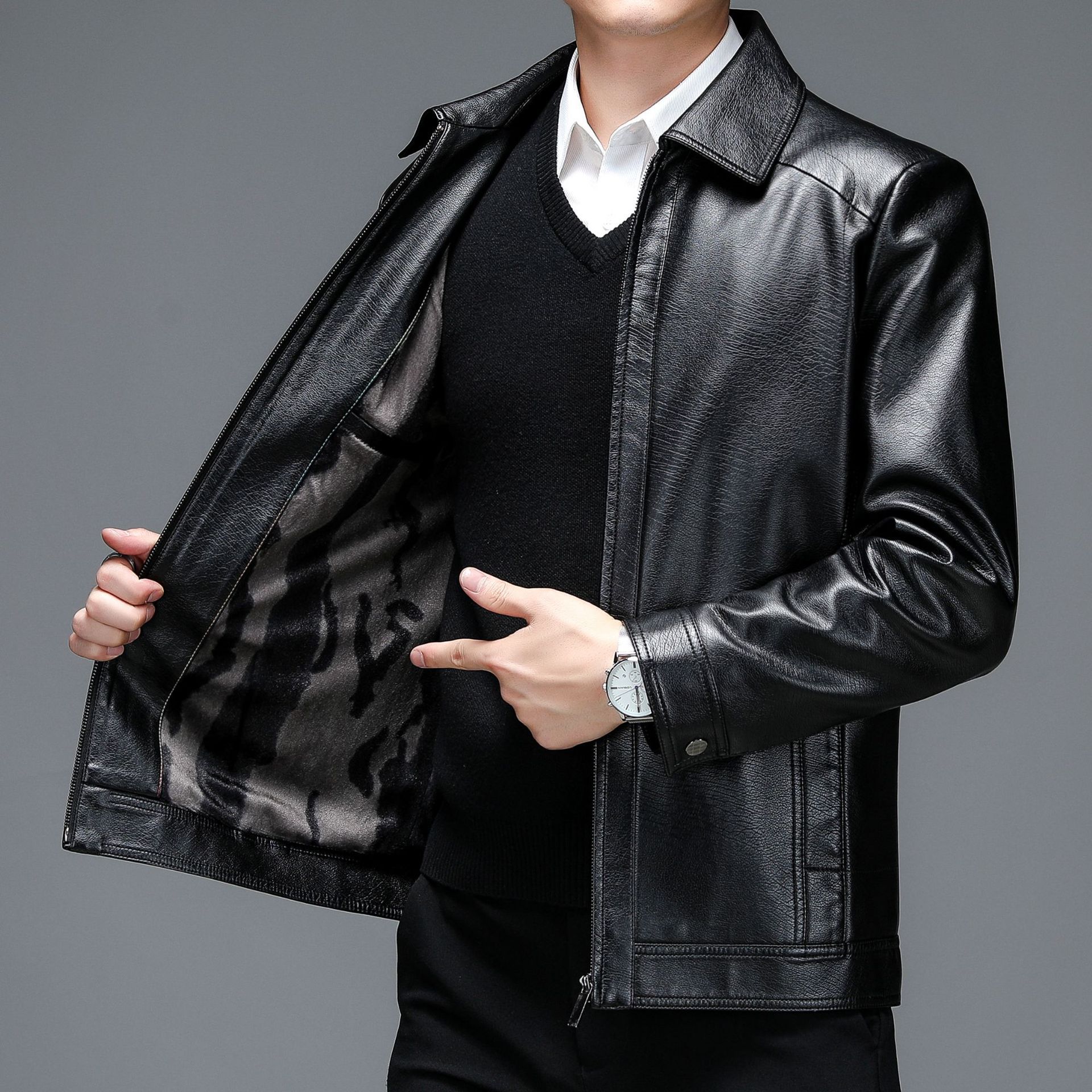 PU 가죽 기모 패딩 두꺼운 수직 칼라 남성 겨울 부드러운 가죽 코트 가죽 자켓 짧은 중년 남성 노란색스토어 가기