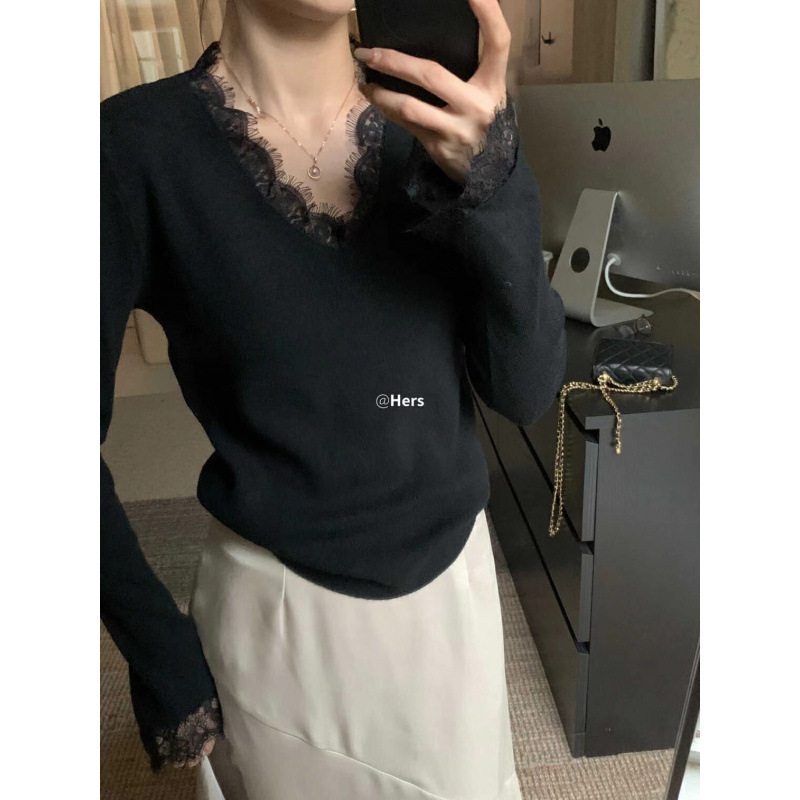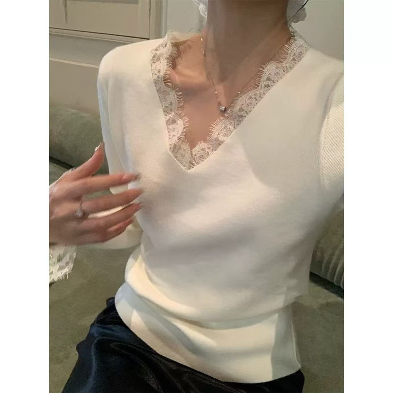 윤슈 가을 다용도 디자인 레이스 스티치 솔리드 컬러 브이넥 스웨터 슬림핏 니트 탑 여성용스토어 가기