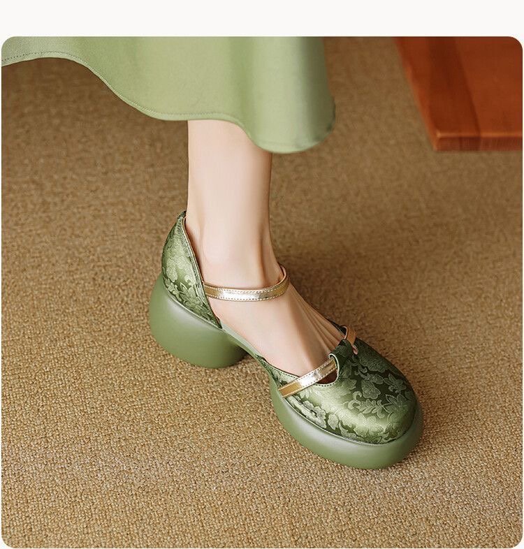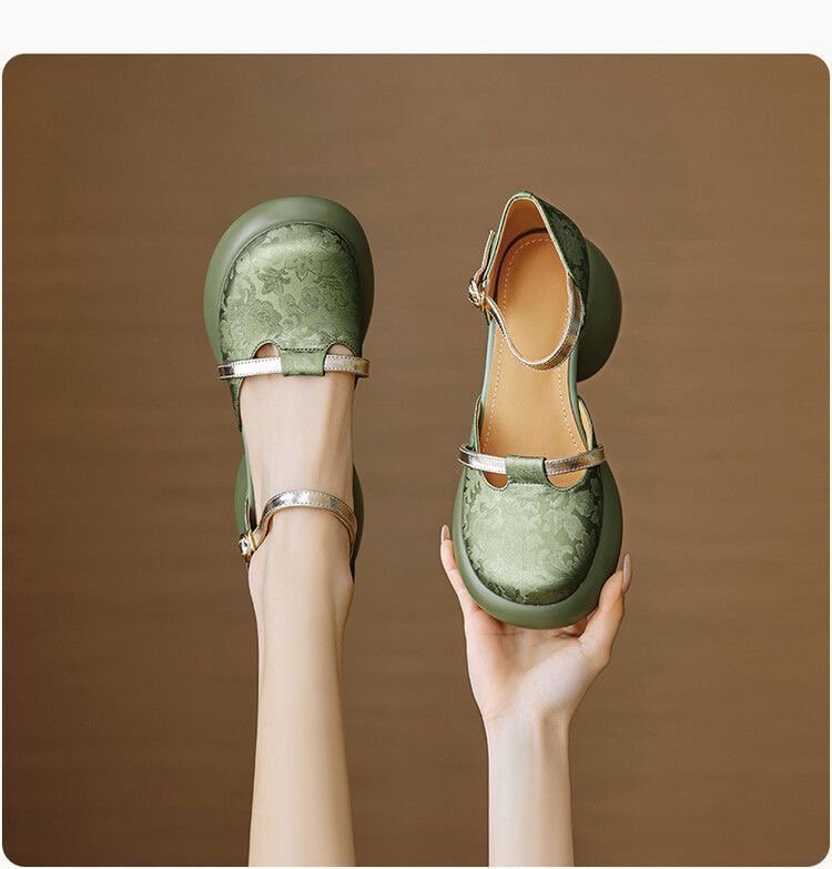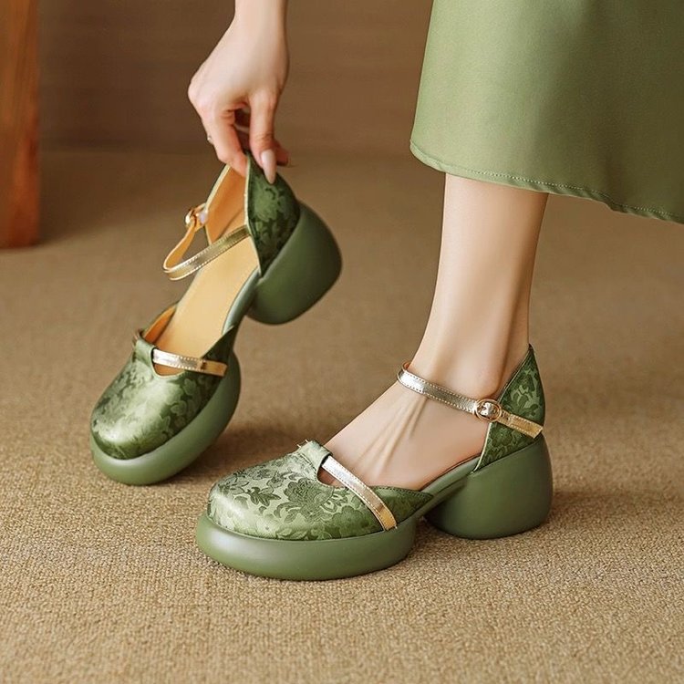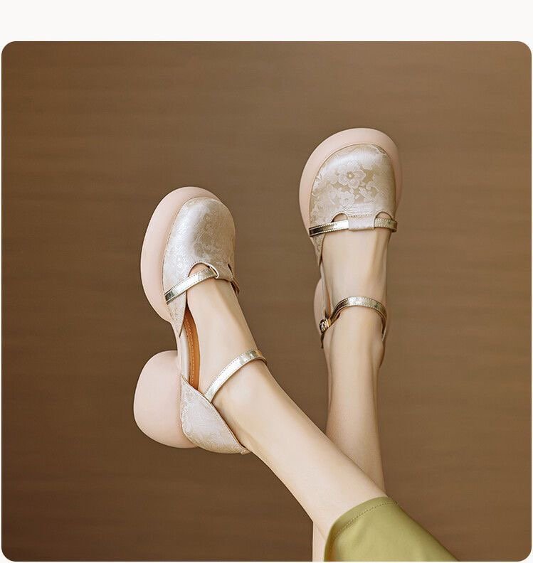 둥근 발가락 싱글 레이어 신발 새로운 중국 스타일 국가 스타일 양각 부드러운 가죽 중공 Baotou 원라인 샌들, 여성용 세련된 슬리밍 두꺼운 힐