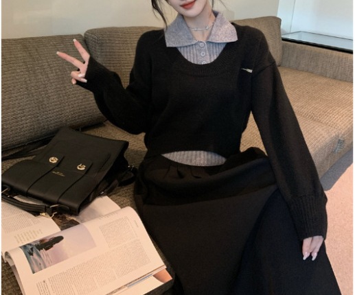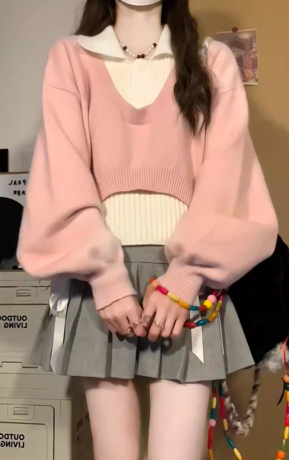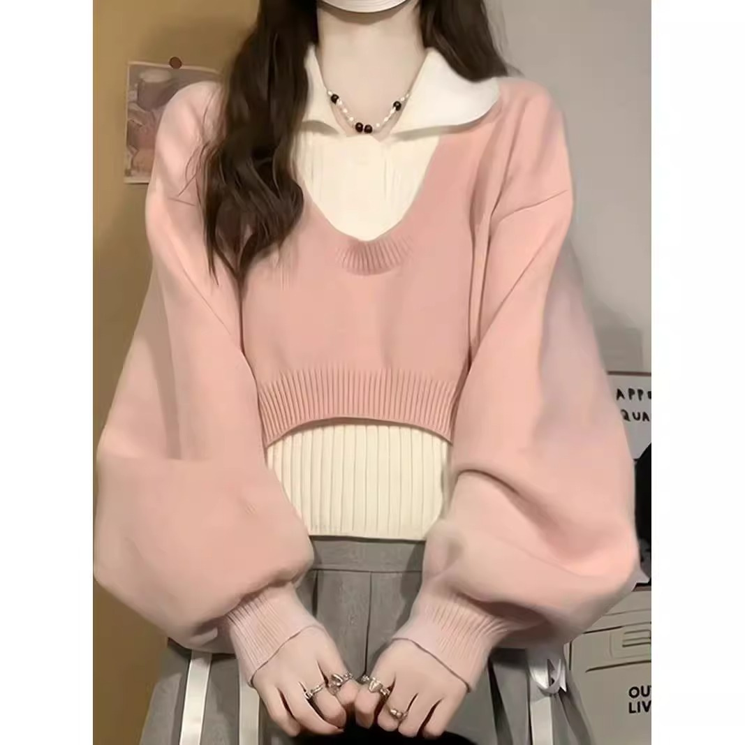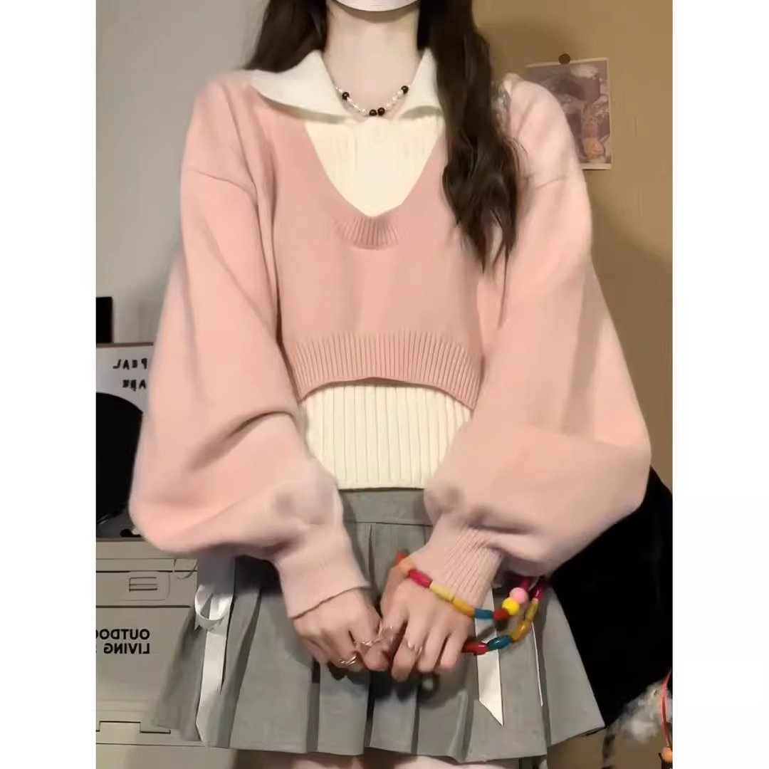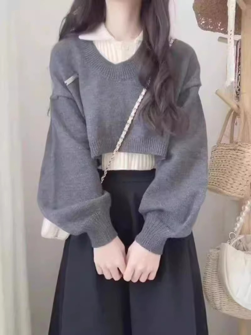 회색 폴로 칼라 컬러 풀오버 디자인 니트웨어 여성용 가을과 겨울 스웨터 조끼 2 피스 슬림 핏 쇼트 탑