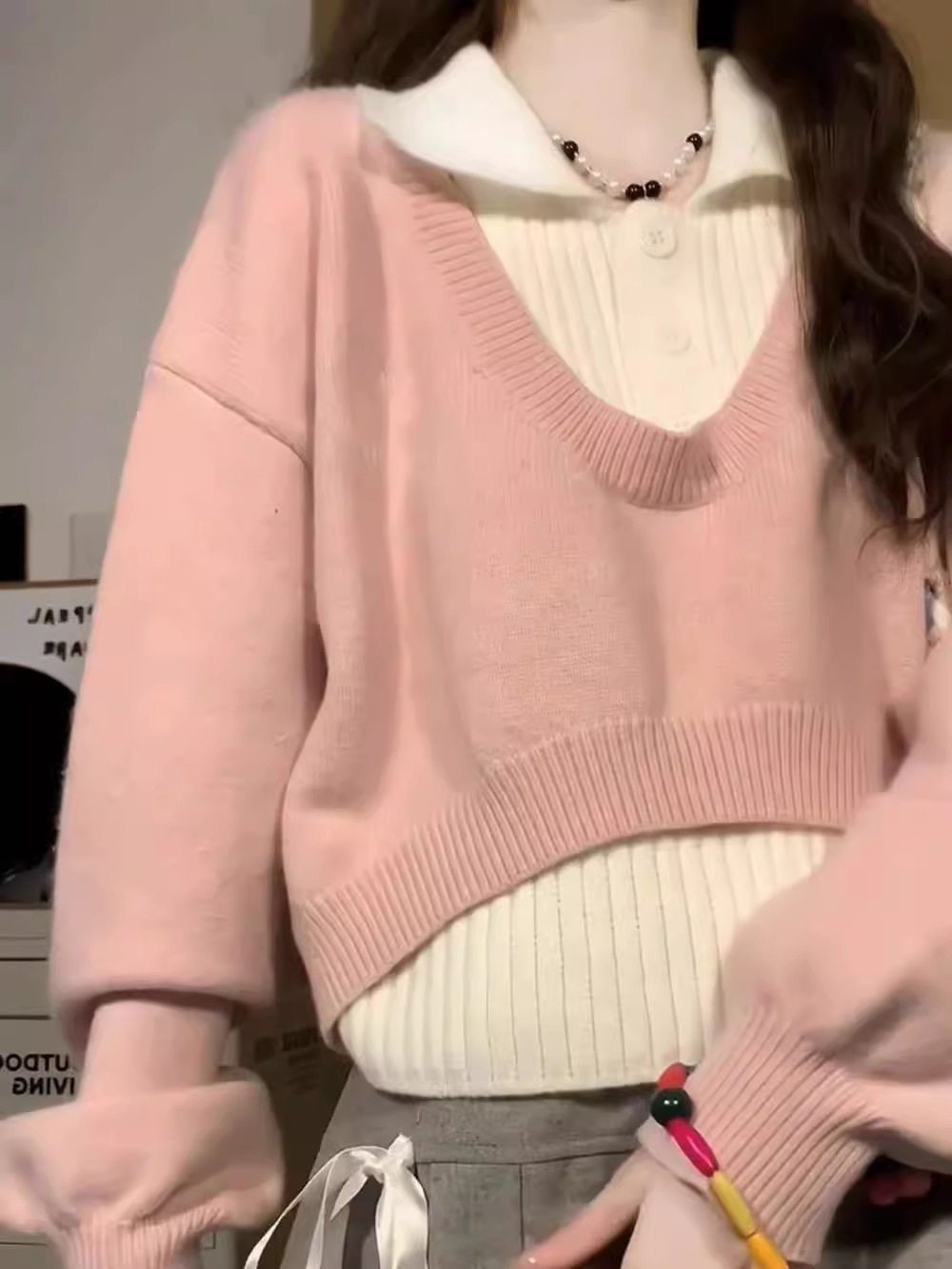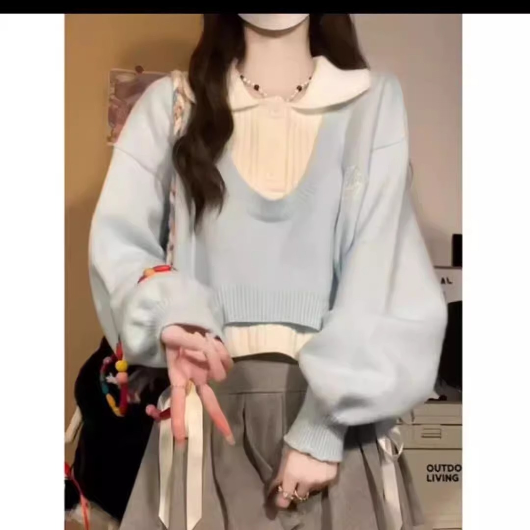 회색 폴로 칼라 컬러 풀오버 디자인 니트웨어 여성용 가을과 겨울 스웨터 조끼 2 피스 슬림 핏 쇼트 탑스토어 가기