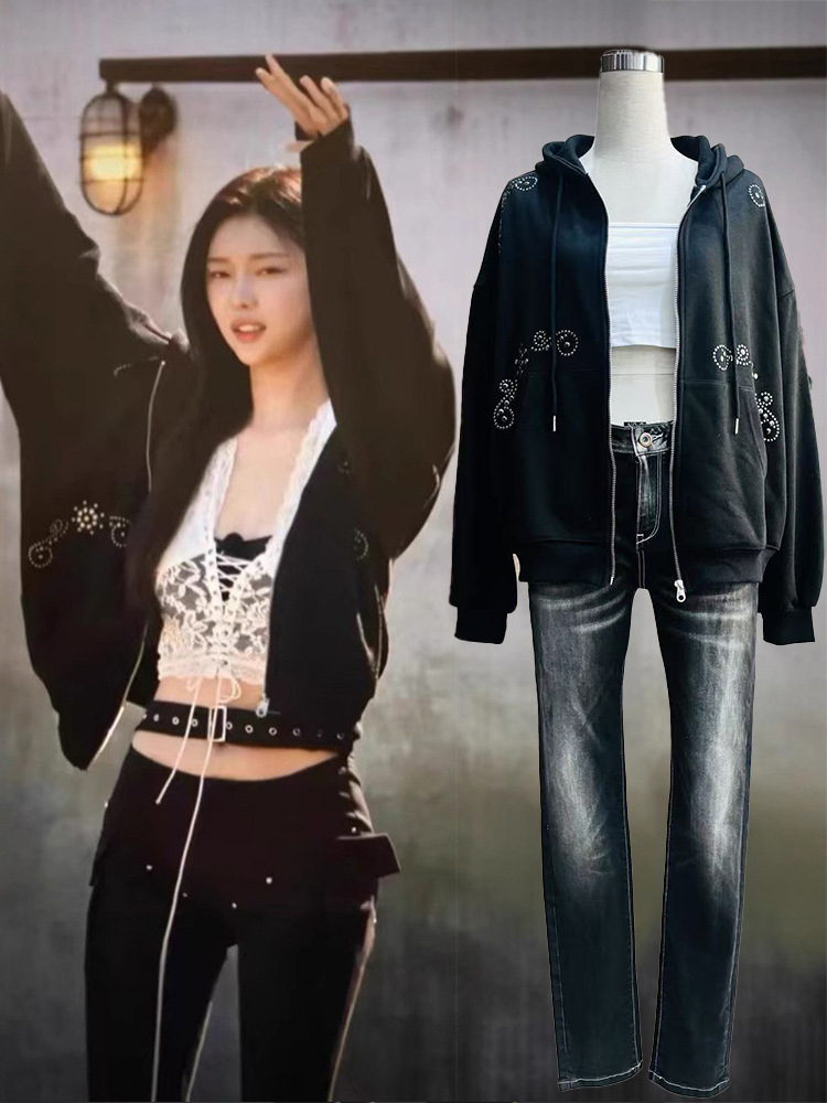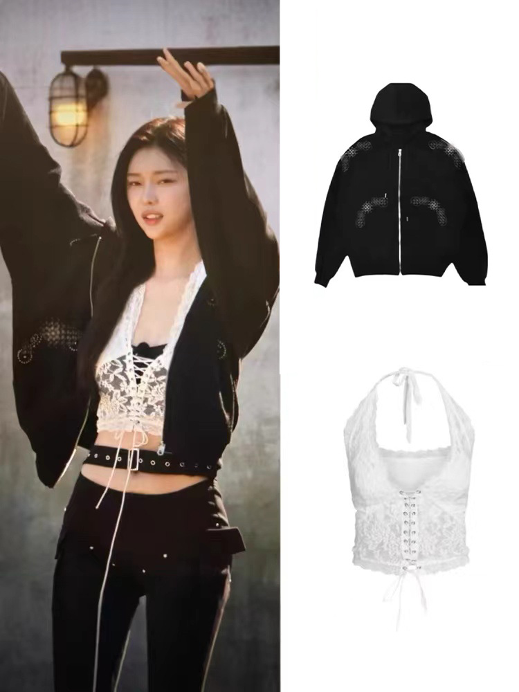 Li Shi'an의 같은 스타일 국경 간 대외 무역 검은 작업복 정장 후드 티셔츠 재킷 홀터넥 레이스 조끼스토어 가기
