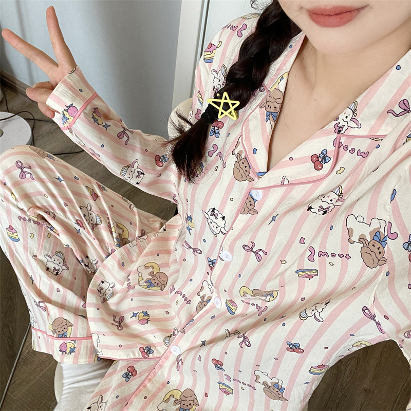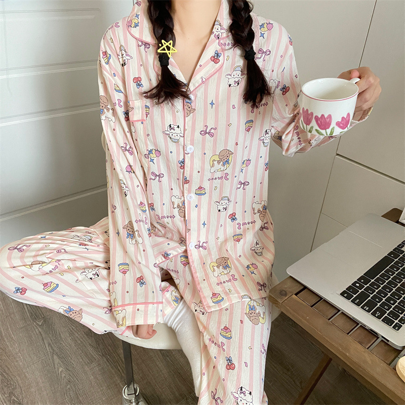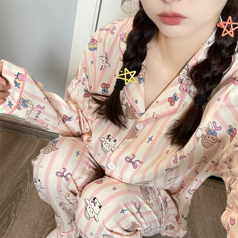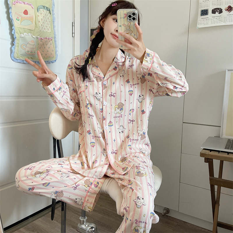 봄과 가을 구름 면 파자마 여성용 긴팔 바지 카디건 얇은 달콤한 만화 겉옷 홈 세트스토어 가기