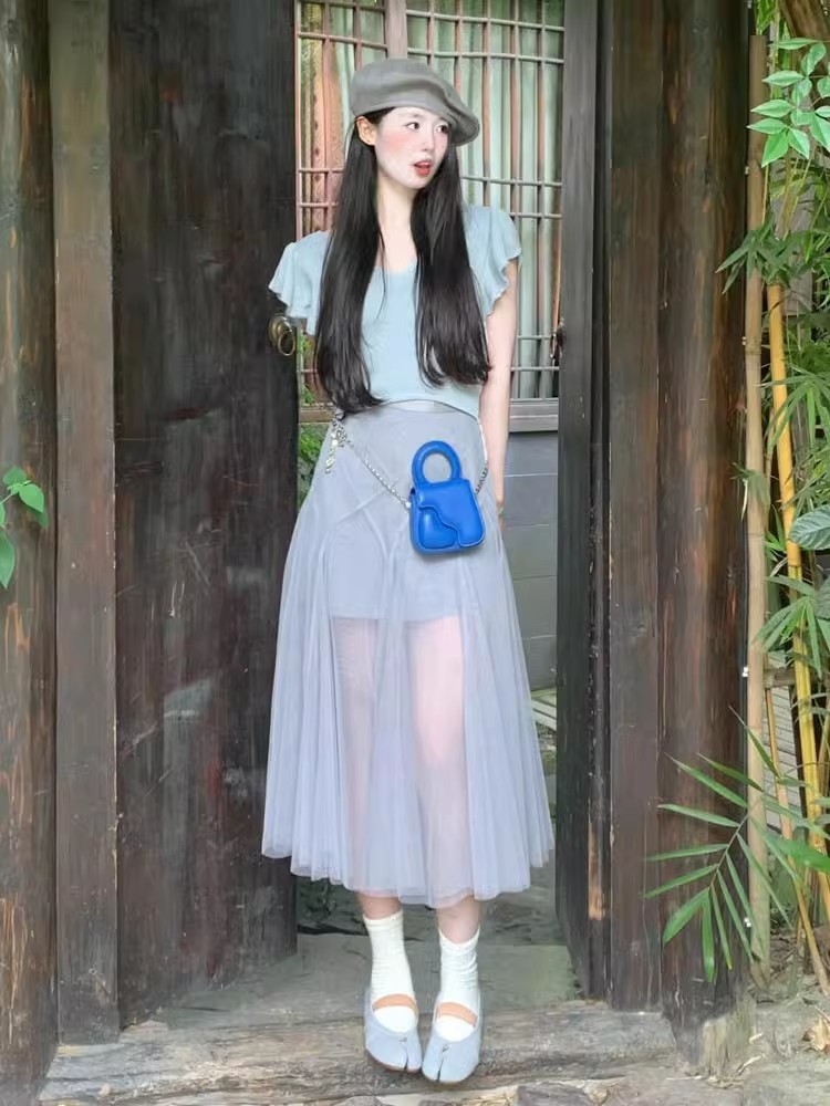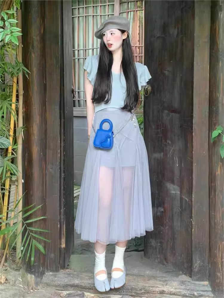 투피스 여성 여름 한국 티셔츠 탑 하프 거즈 스커트 우아한 슬리밍 세련된 요정 스타일