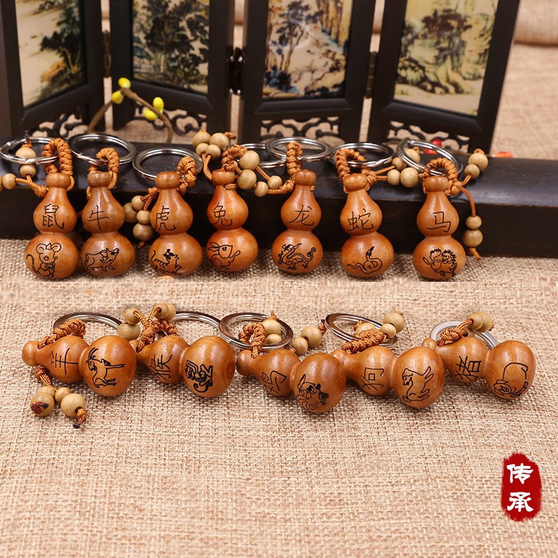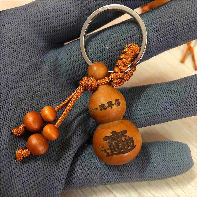 키 체인 Baoping Fu Lu Gourd 자동차 키 행운의 축복 언어 복숭아 나무 조각 펜던트 Amitabha스토어 가기