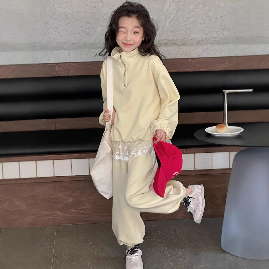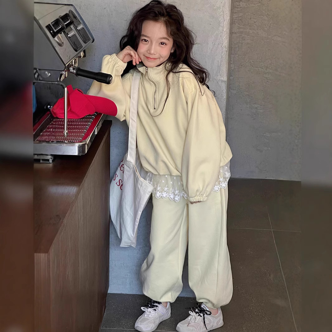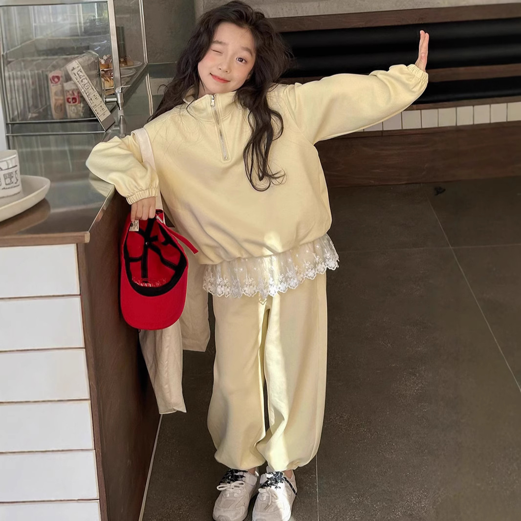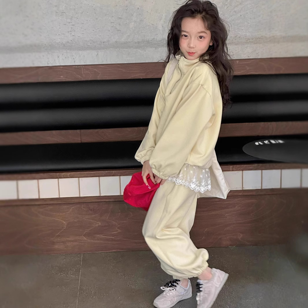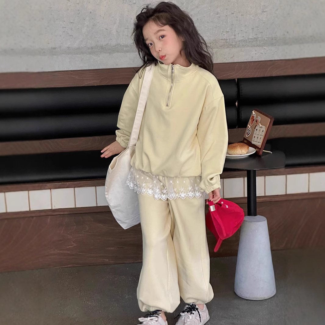 소녀의 봄과 가을 한국 스타일 캐주얼 2025 새로운 스타일 중대형 어린이 유행 봄 옷 어린이 레이스 세트