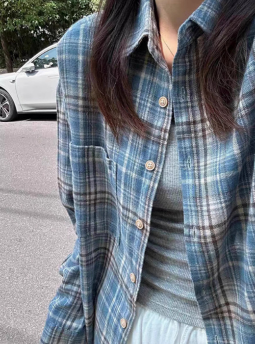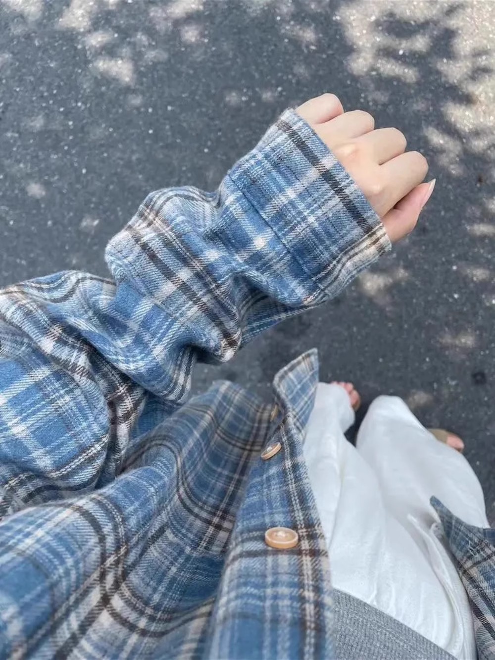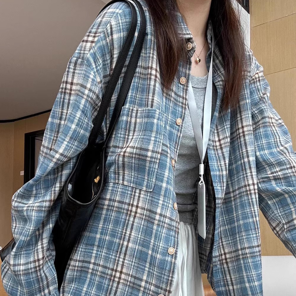 파란 격자 무늬 긴팔 셔츠 여자 2025 봄과 가을 느슨한 하라주쿠 스타일 캐주얼 올 매치 트렌디 셔츠스토어 가기