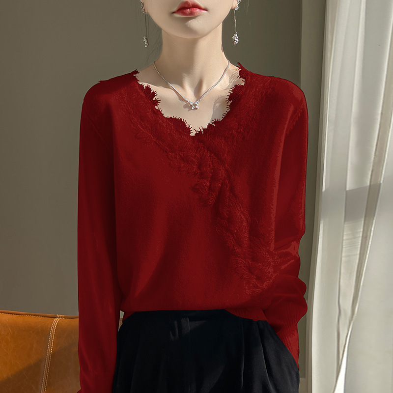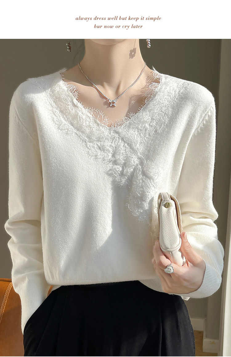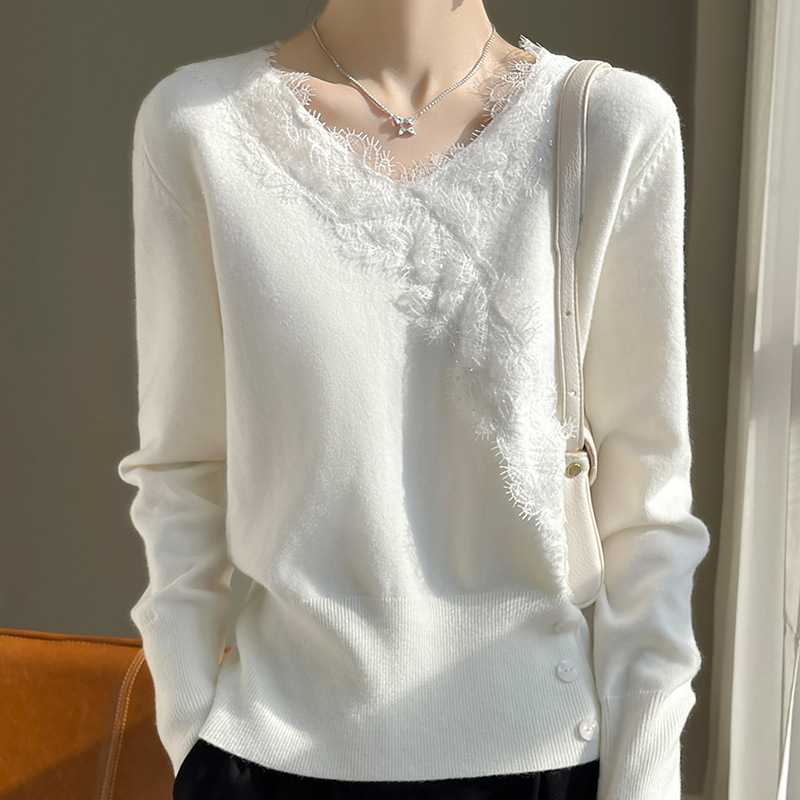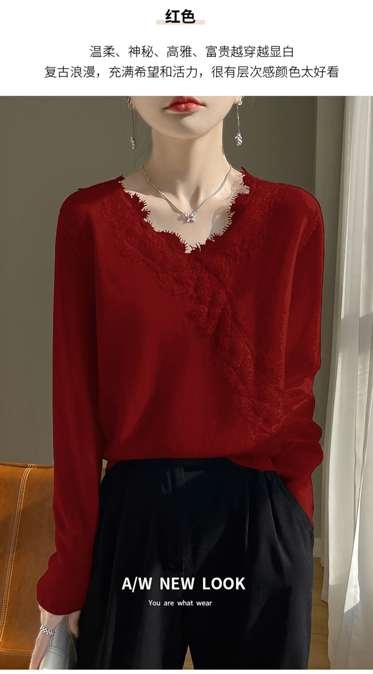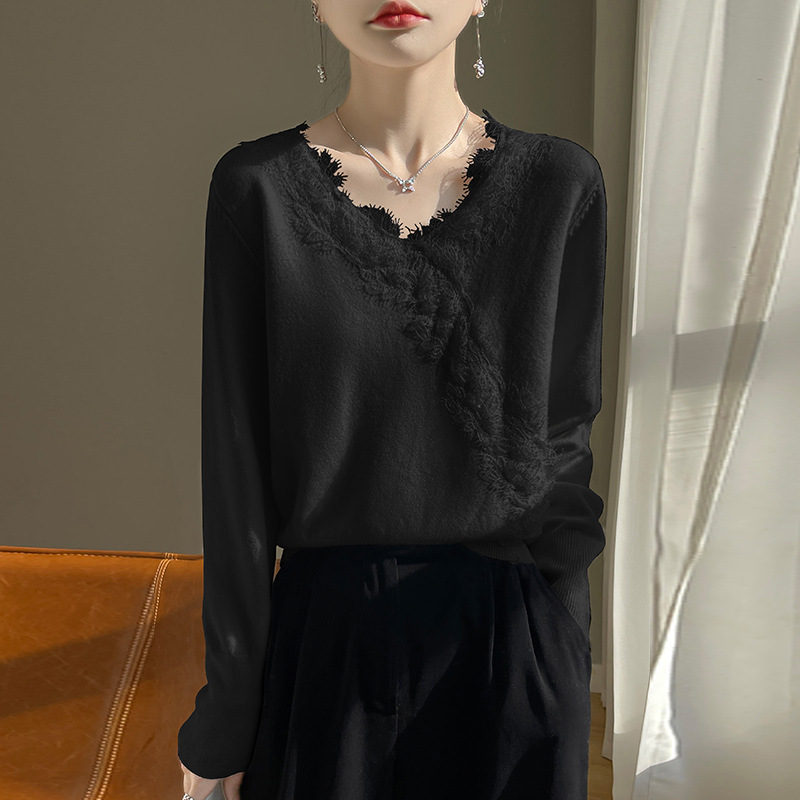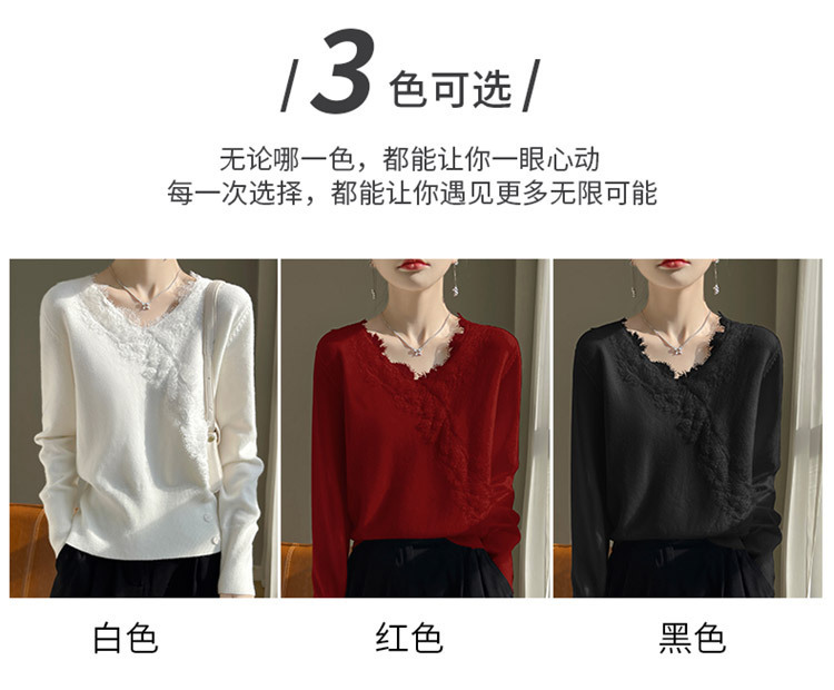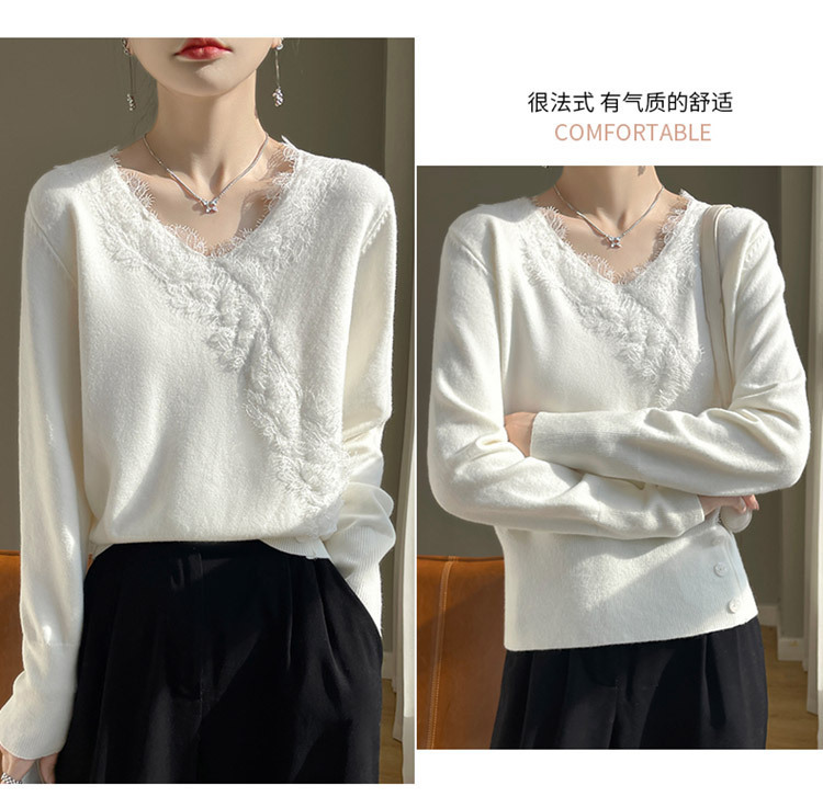 厂家蕾丝拼接V领长袖针织衫女上衣季新款洋气内搭打底衫毛衣